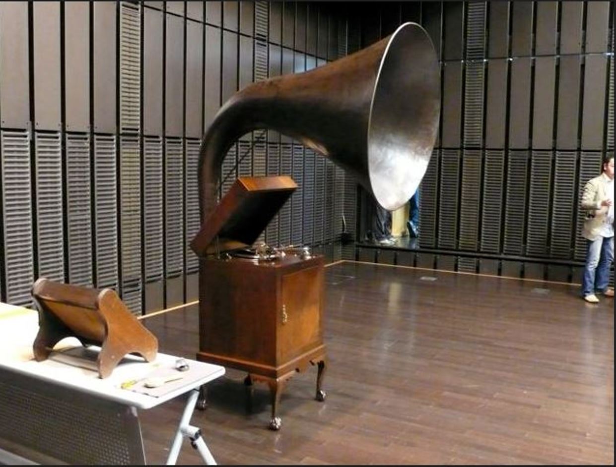 Unfortunately, the gramophone is currently only for display and does not work. The motor needs repairs and the soundbox may need rebuilding. The two examples I have seem have had the same damage to the horn. The diagonal brace rod, which is meant to help support the horn, has punctured through the paper horn. All quite easy repairs, and I have encouraged the curators at Harewood House to have these repairs done, so that the beast can be played and perhaps even used for concerts.