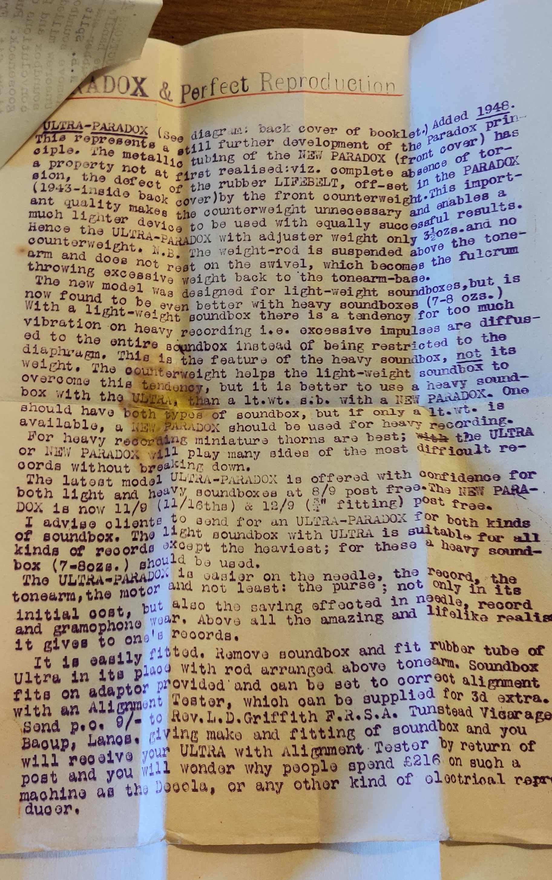 Indeed it looks very crude, Chunny. It seems that the vertical alignment of the soundbox would go haywire with this hose in between the arm and the soundbox, unless the hose is rigid, which would kind of defeat the purpose. Maybe worth a try to make one of these and check if there is any improvement or this is only another bottle of Reverend's Snake Oil.chunnybh wrote: Fri Jul 22, 2022 8:26 pm The Ultra-Paradox counterweight with “Lifebelt” was found with the Expert All-Range at Harewood House. My first thoughts were that this was a one off home-made device until I found the typed instructions.