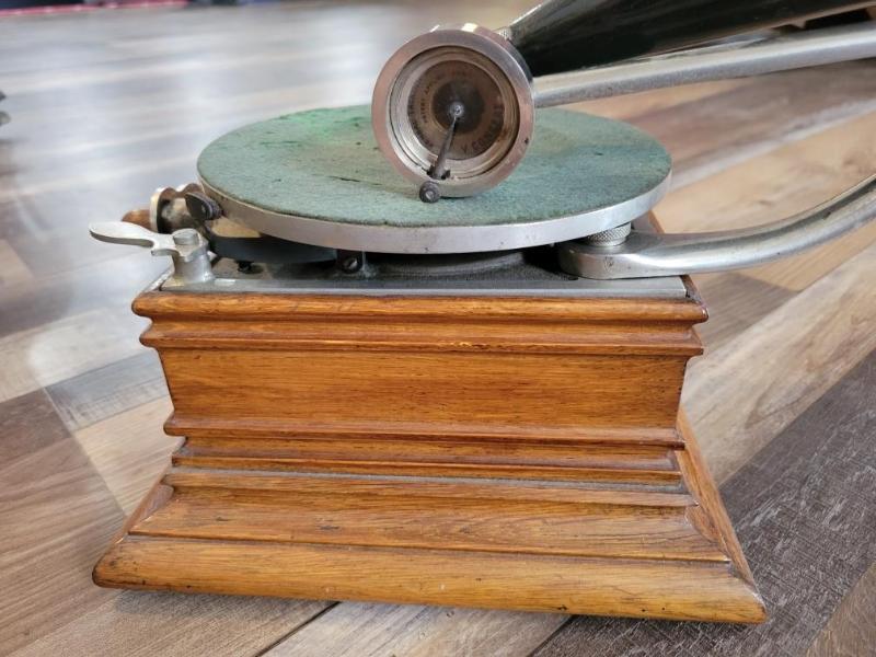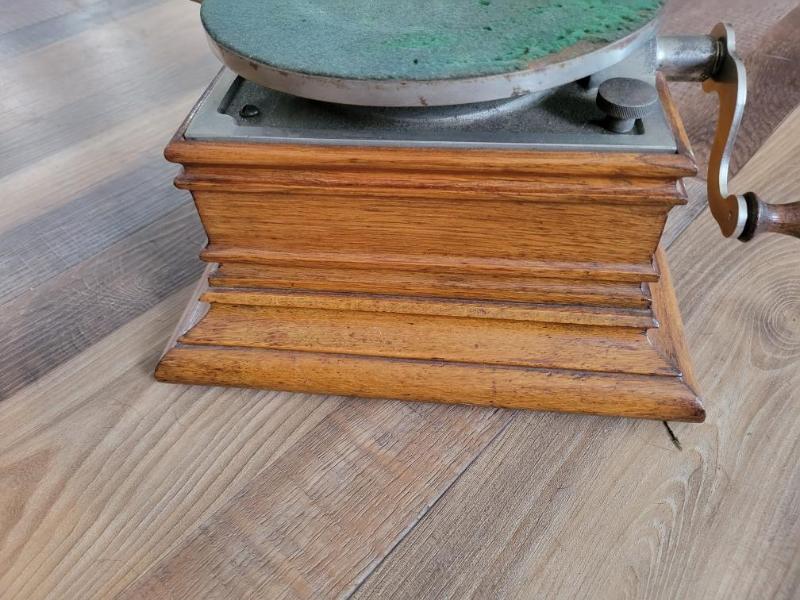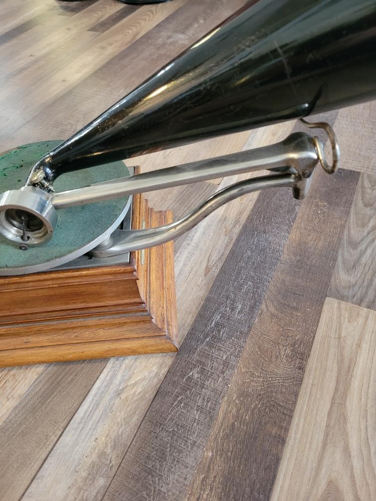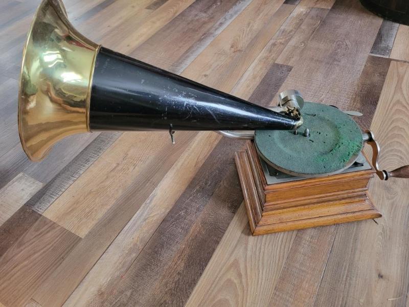 Here is a really nice small Zonophone which is all original with the exception of the reproducer and the crank which are both quality replacements. This machine winds up and does play. It looks to be a European model. The original decal is in decent shape ( see pics ) This is a very cute small highly ribbed machine. The horn bell looks funky in the pics. It is in perfect condition. Payment through paypal Friends and family. The price is 1800.00 shipped to the lower 48 only. Please call me with interest. 641-891-0054 Tom. Do not use email!! PM is ok also. The first to post sold get it.