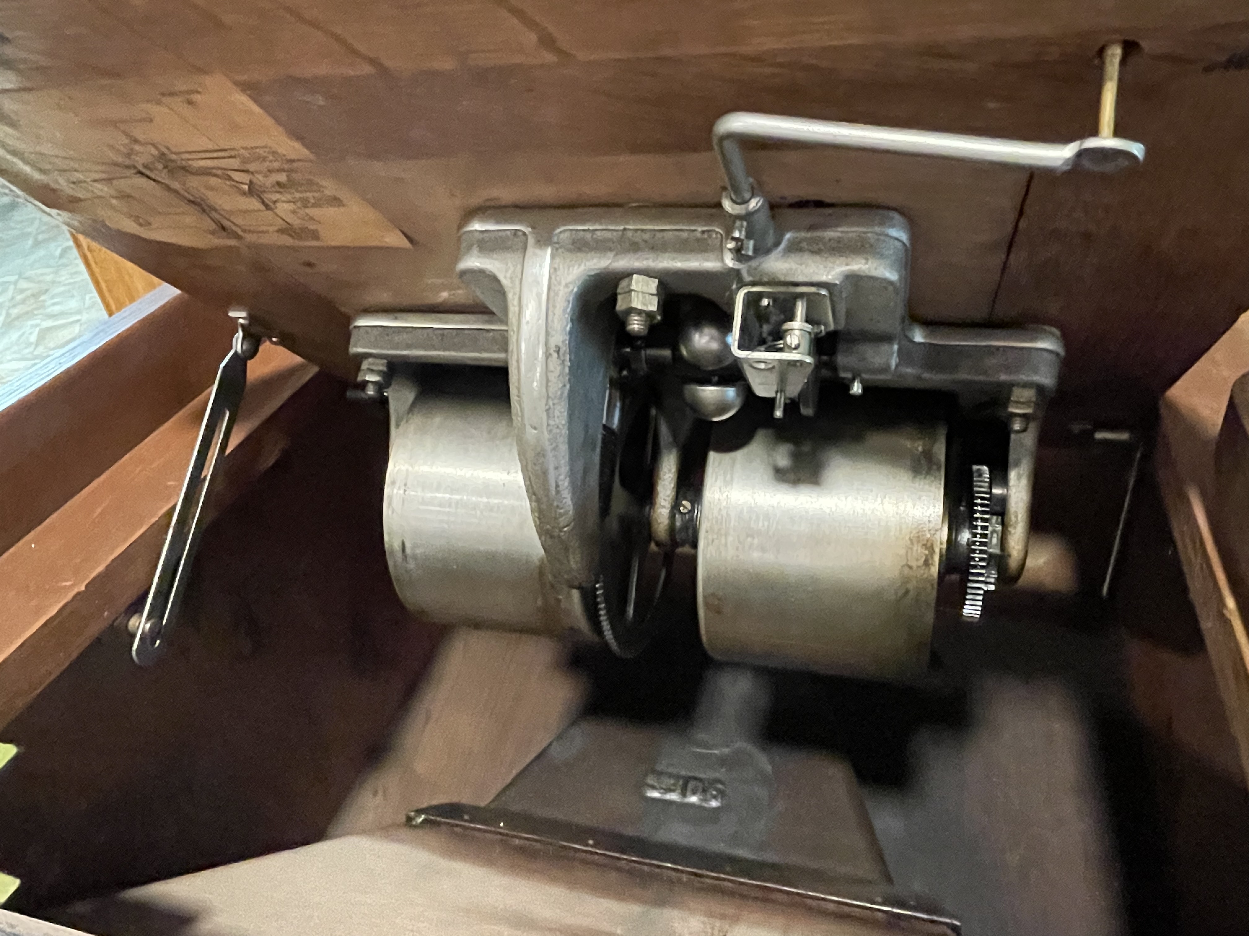This machine was given to me recently by my mom. She got it from my grandpa. It’s been sitting for a lot of years but I do remember hearing it play Hank Williams when I was a kid. I can crank it up and it will almost come up to speed but when I put a record on it it drags it down really low. I didn’t see a badge on it anywhere. Just stickers. I’m wondering if it’s all original? Also the turntable doesn’t stay flat. It wobbles around pretty bad. I’m wondering if it’s even for one of these machines? Thanks for any help you can give. Ben