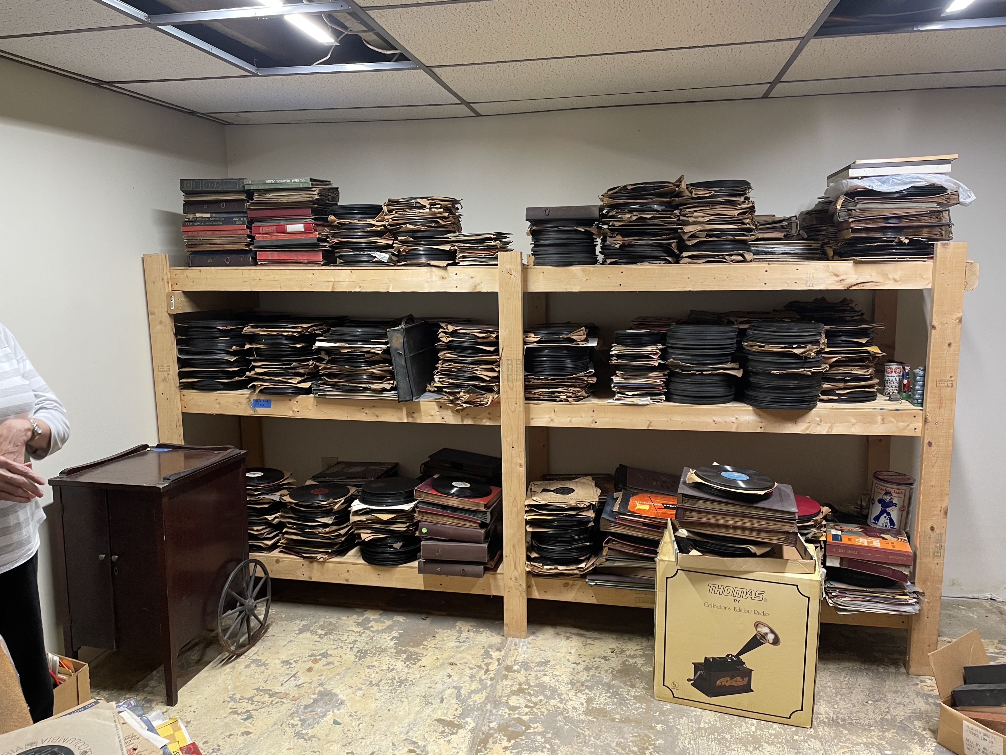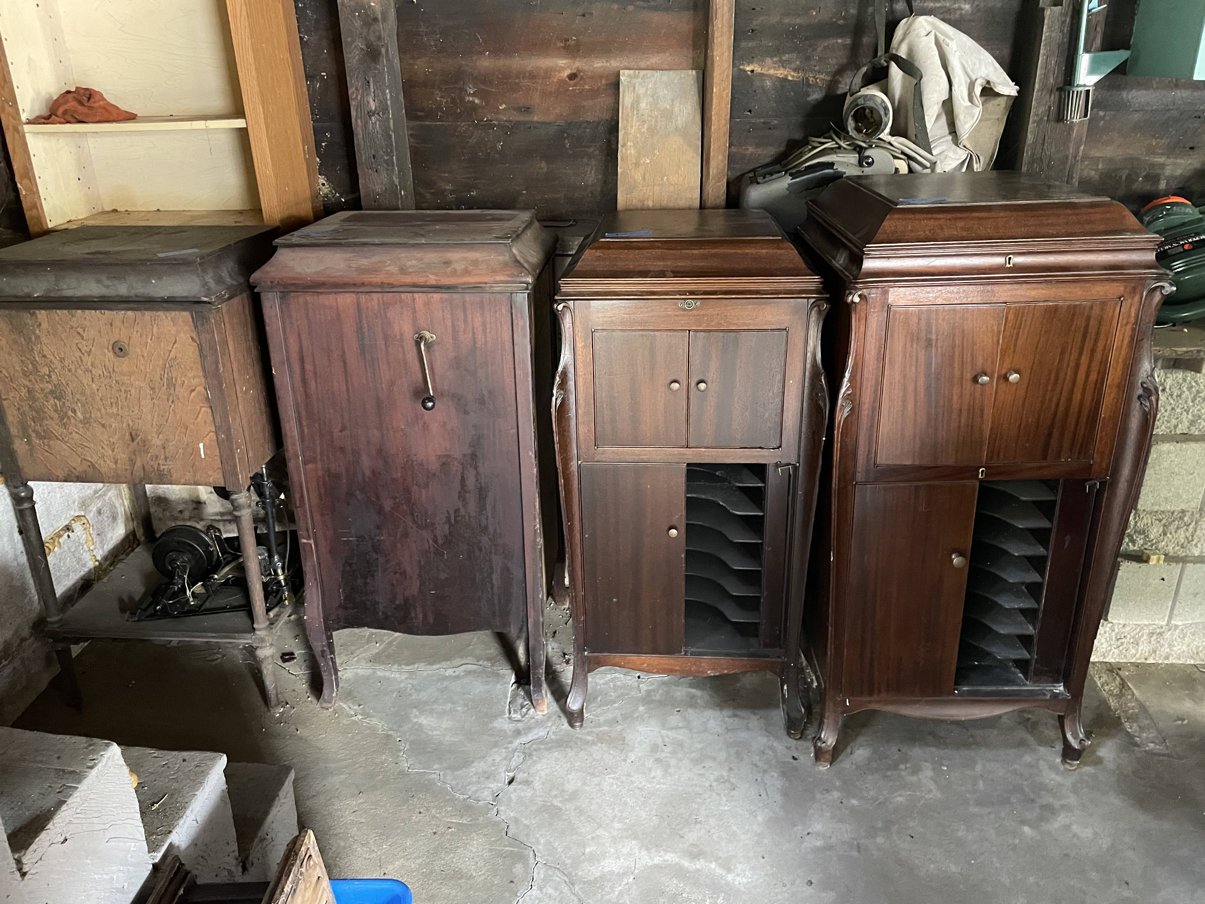 The widow of a friend is disposing of his phonographs and records. She is in Barnsville Ohio. The town is an easy detour from the Ohio Tpk. She has the records are in stacks of approximately 150 for $50 each stack. She is not allowing picking through the stacks. There are a lot of good records. Mostly 10". There are blues, minstrels, comedy, etc. They have not been picked through. She also has a number of record cabinets for less than $50 each. She also has a Columbia schoolhouse record cabinet with big wheels. There are also a group of upright phonographs that have most of the parts for about $50 each.