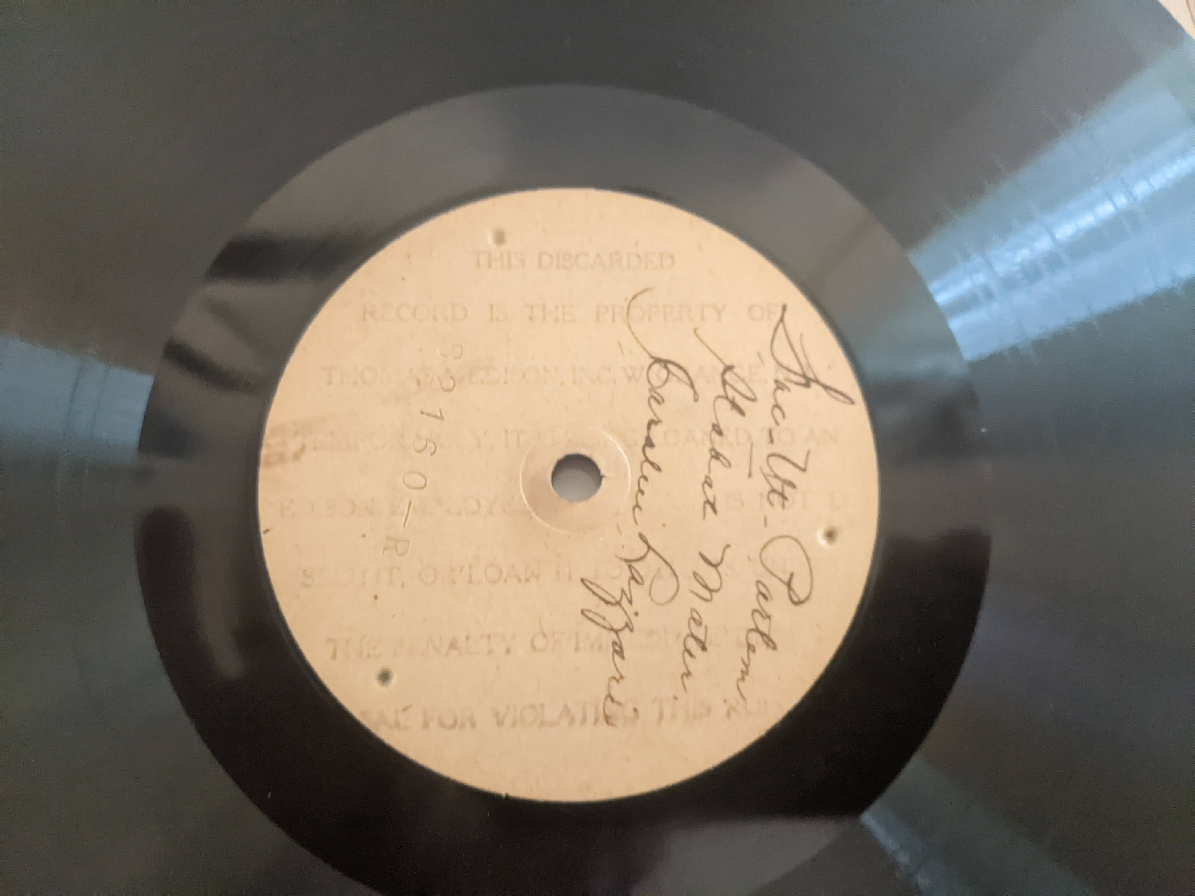 THIS DISCARDED RECORD IS THE PROPERTY OF THOMAS EDISON INC. W. ORANGE N.J. TEMPRORARILY IT IS BEING LOANED TO AN EDISON EMPLOYEE WHO IS NOT TO SELL IT OR LOAN IT TO OTHERS. UNDER THE PENALTY OF IMMEDIATE DISMISSAL FOR VIOLATING THIS RULE.