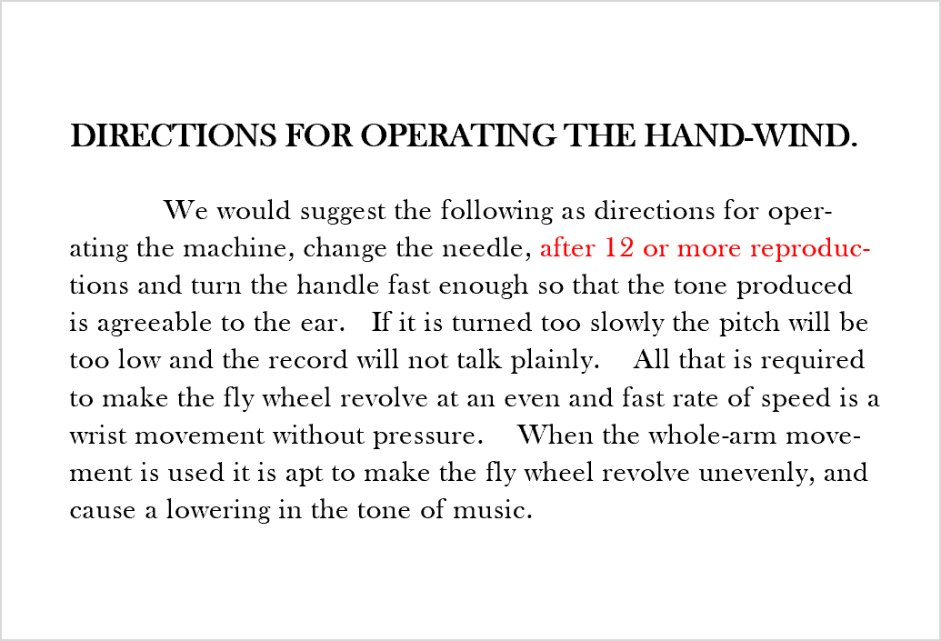 Having owned a reproduction hand wind in the past, the needle of the soundbox must be set on the record first, because two hands are needed to operate the machine!