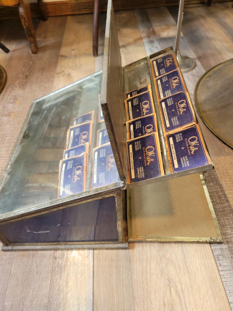 Here is a really neat and hard to find OKEH countertop needle display with approx. 18 packs of OKEH needles. This is the only one of these that I have seen. It is in good condition. It has a door on the back that opens to access the needles. It also has a pull-out tray to store undisplayed needles. Graphics look great for the age. The marquis is loose and likes to lay down slightly. It will stand upright too. Buyer to pay shipping through paypal friends and family. First to post SOLD gets it. 500.00 + shipping. Call Tom 641-891-0054