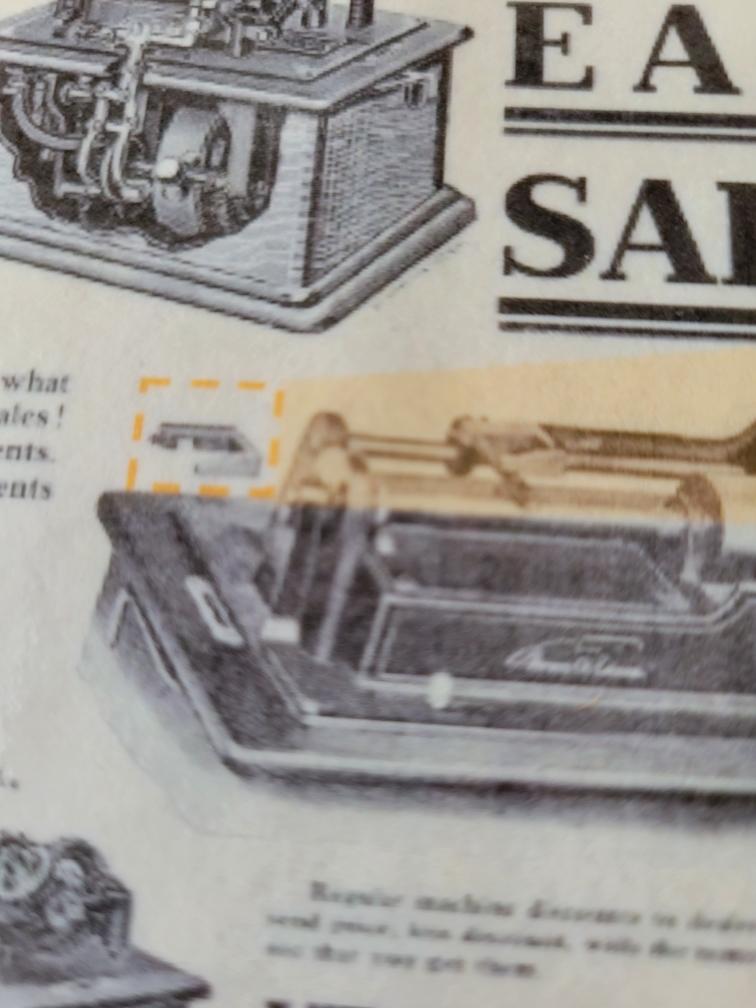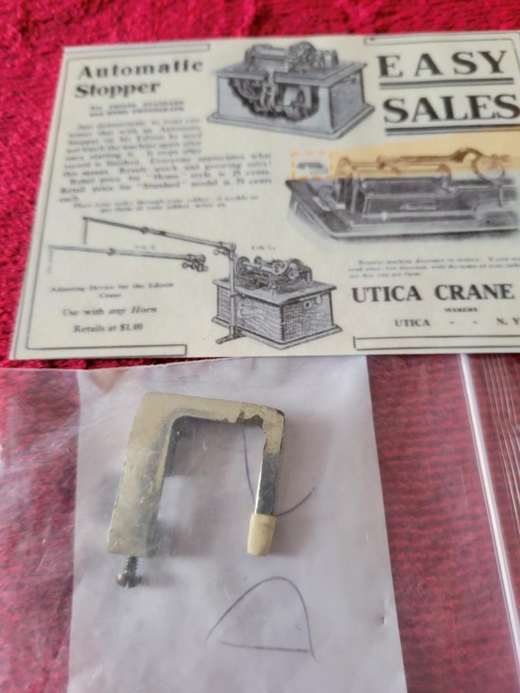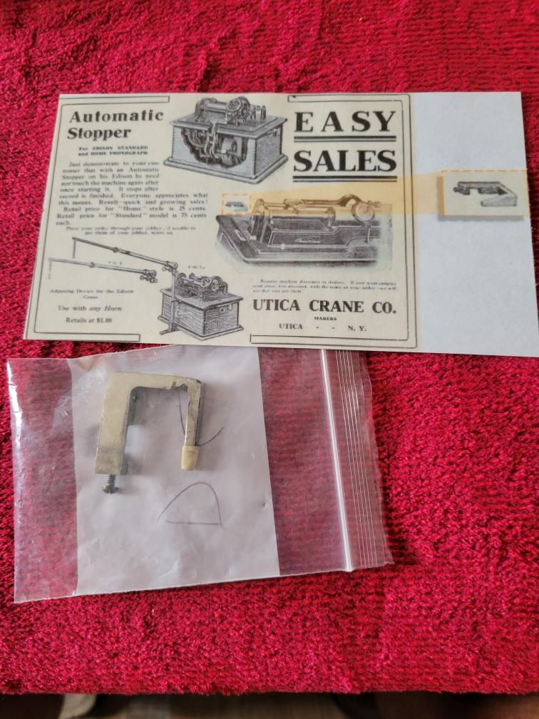 Here is a really nice shape Utica auto-stop for an Edison cylinder player. I think it is for a Home. I have a photocopy of the original sales flyer that is shown and goes with this. First to post SOLD get it. 100.00+10.00 Paypal F&F Tom