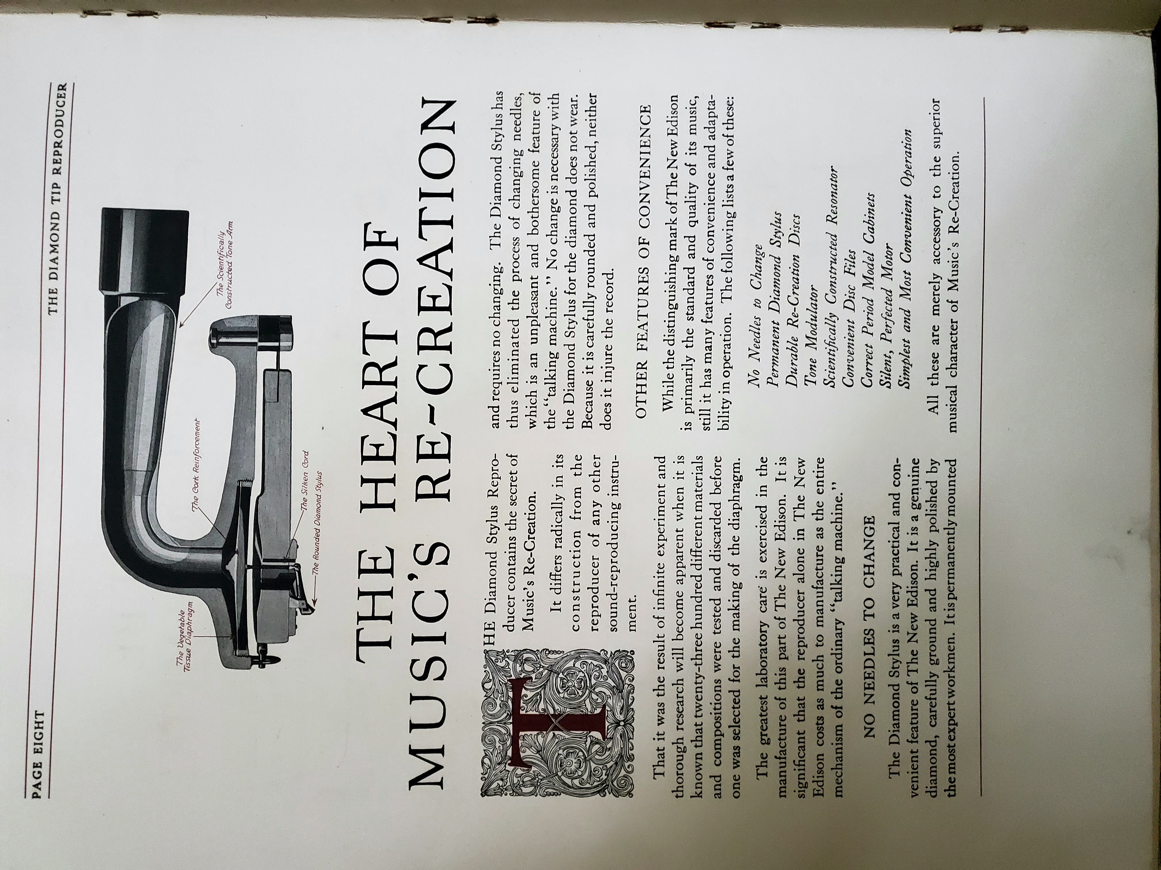 I bought this a couple of years ago. It is a hardbound, sixteen page book housed in a fancy folio. Copyright 1917. Measures 12 ⅝" X 16 ⅛". Promotes the Diamond Disc machines and records. I have never seen another one of these anywhere. It seems a bit over the top to be a giveaway or mailer. Does anyone out there have any info they would share about it? Thanks.