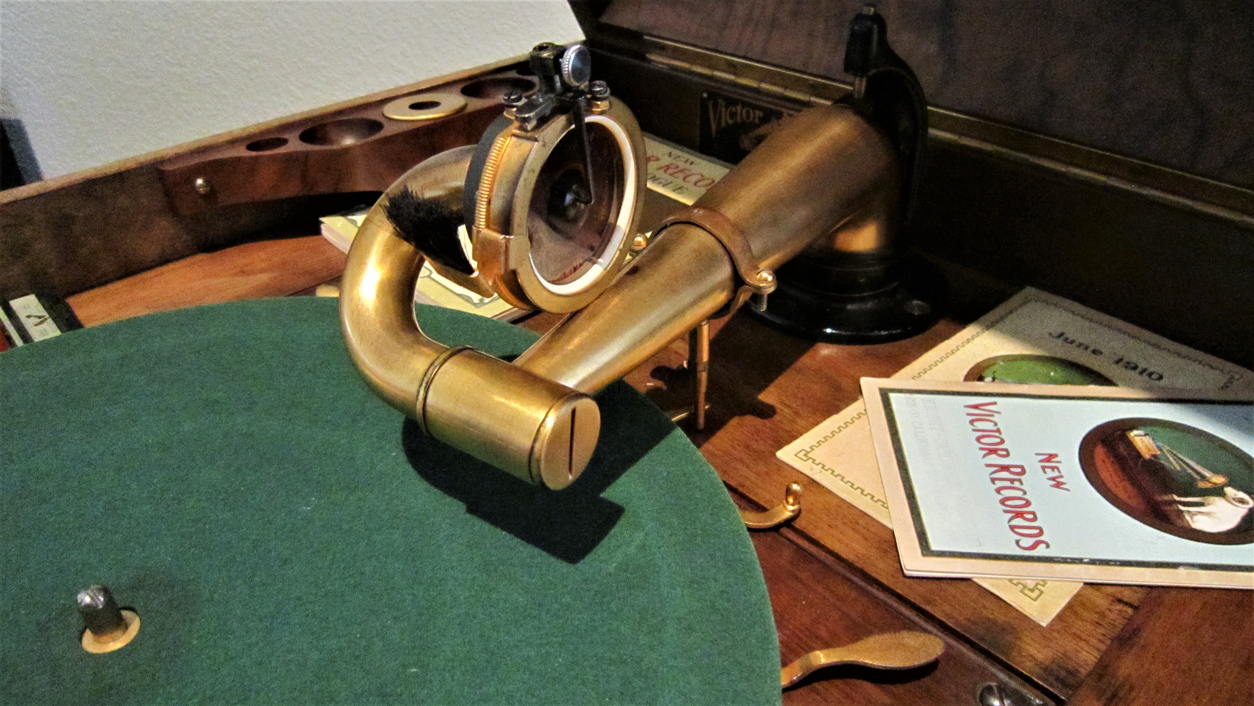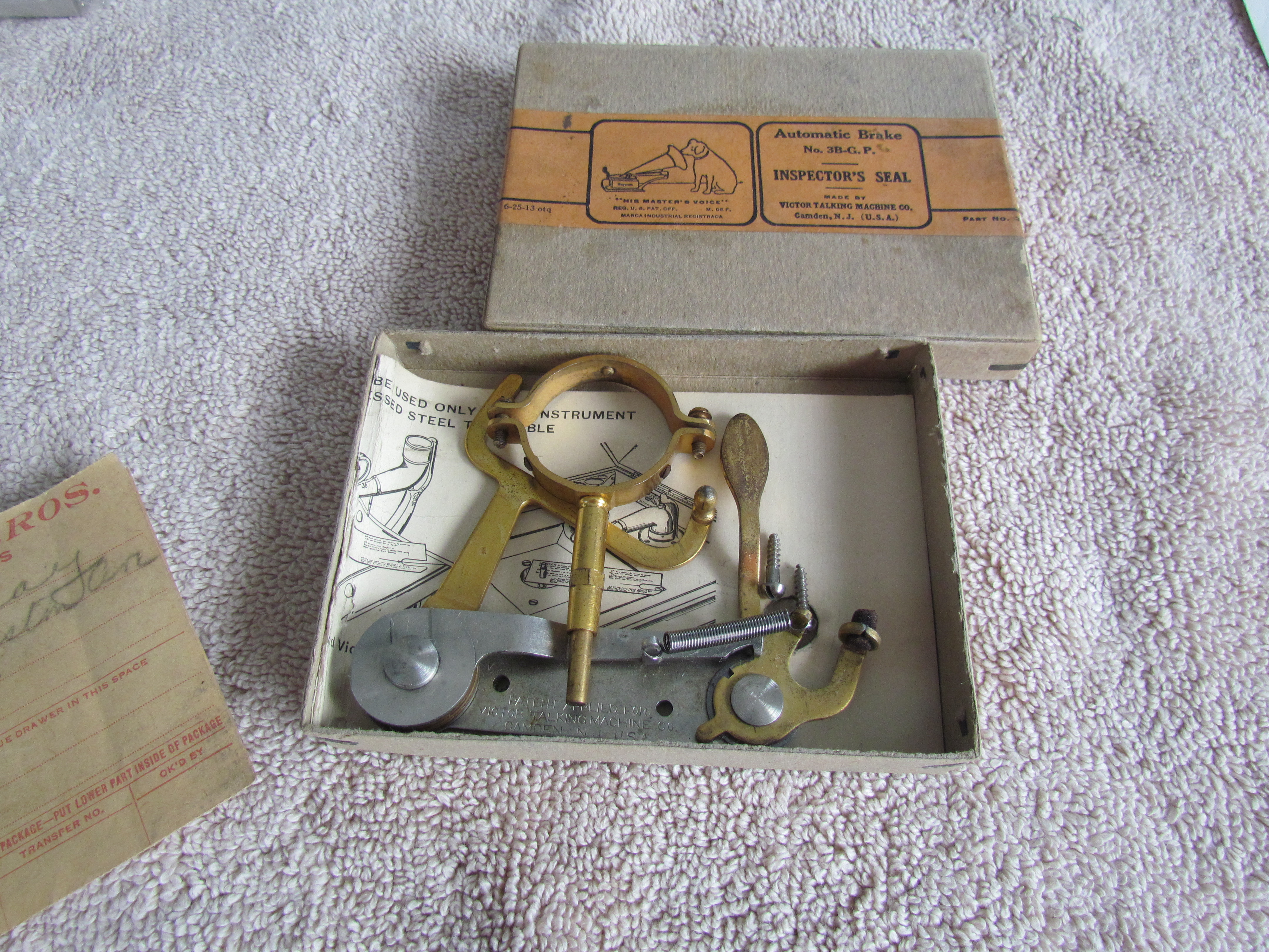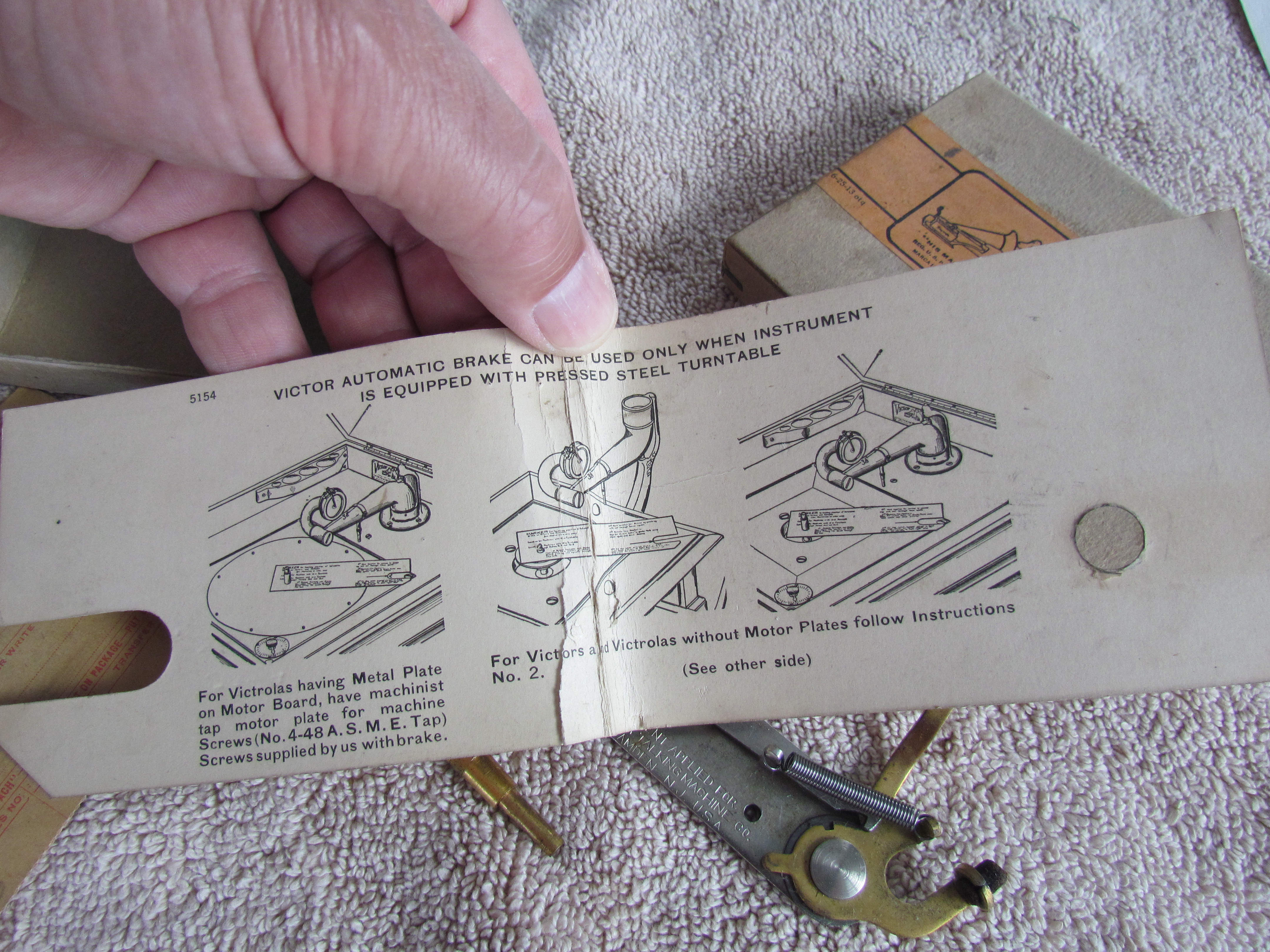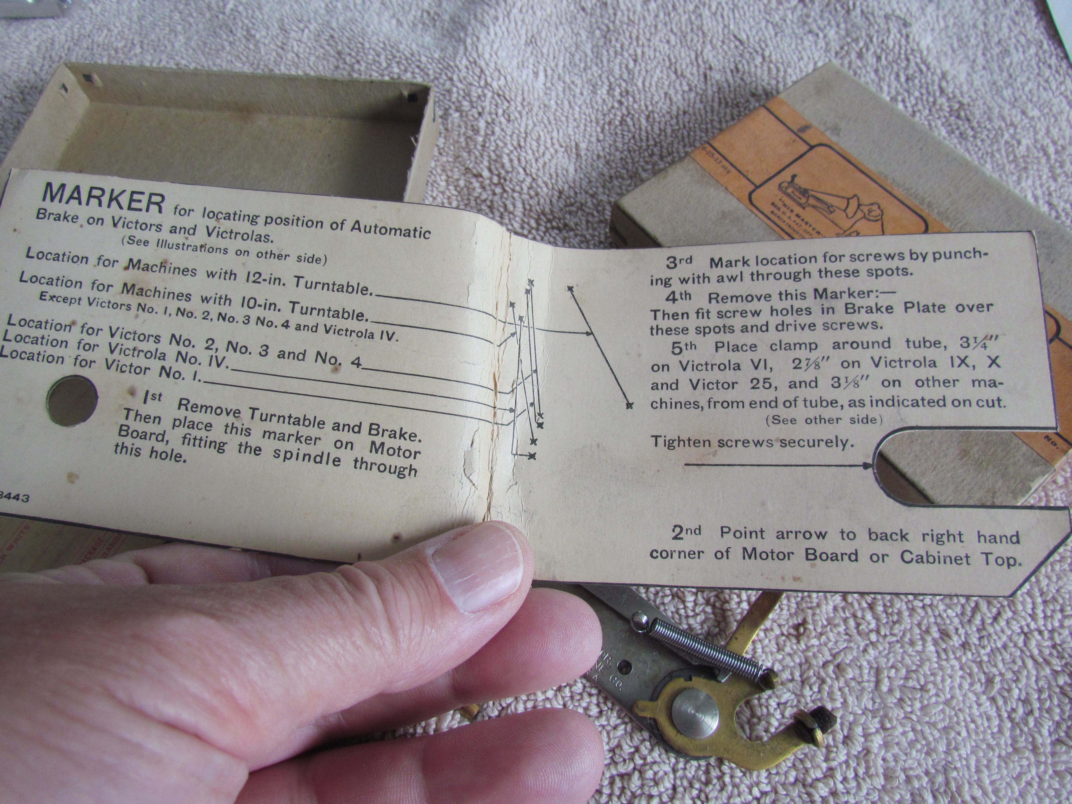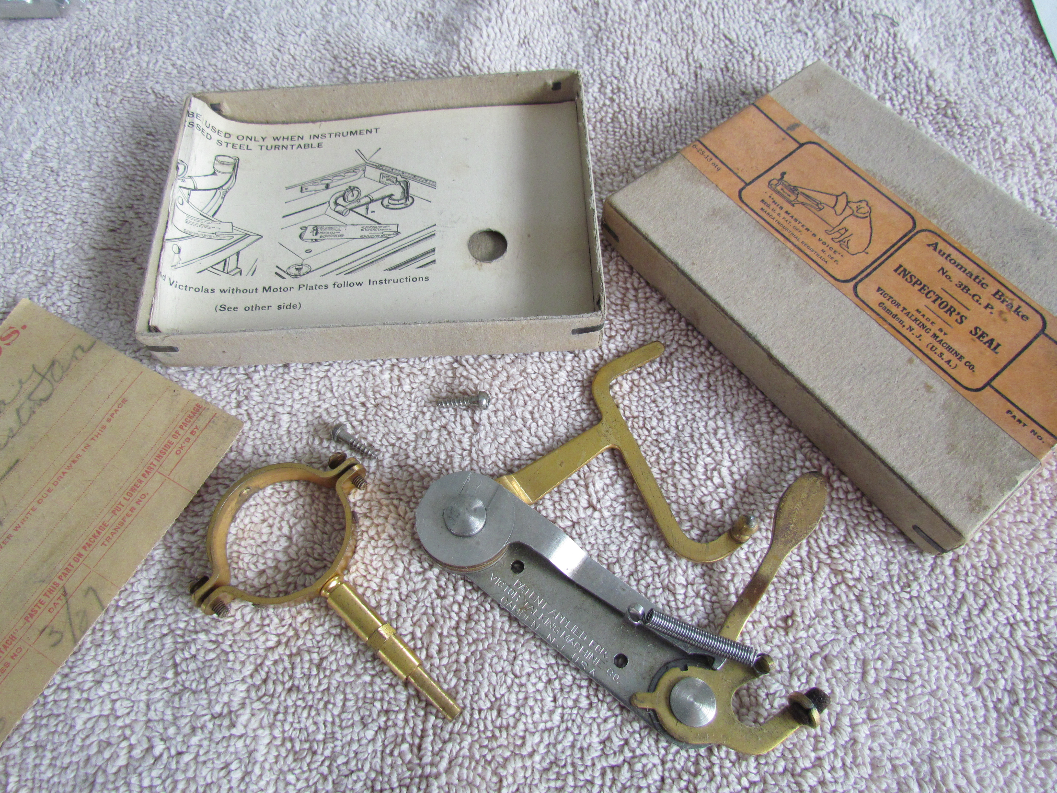 Everything is there to convert your late Victor VI, or Early Victrola to an Automatic Brake, including the original mounting Template. (The last picture shows one mounted on an L-Door Victrola XVI).