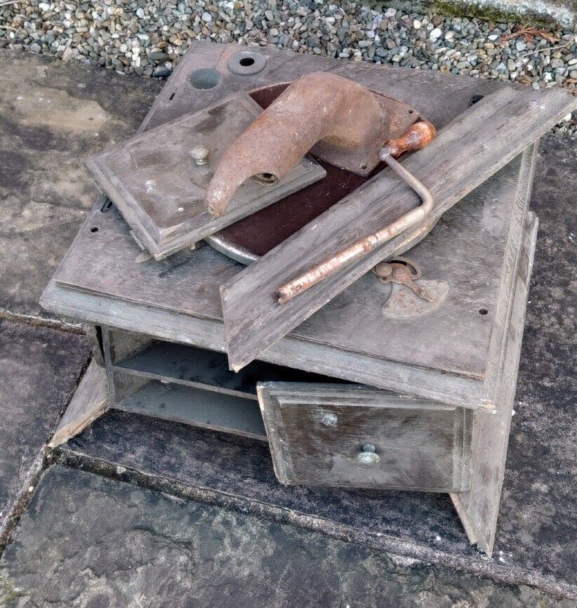 What a mess! Looking at the speed control, it would appear to have an HMV No.32 (or similar) motor. In which case that winding handle won't fit. But as they say "Hope springs eternal"!