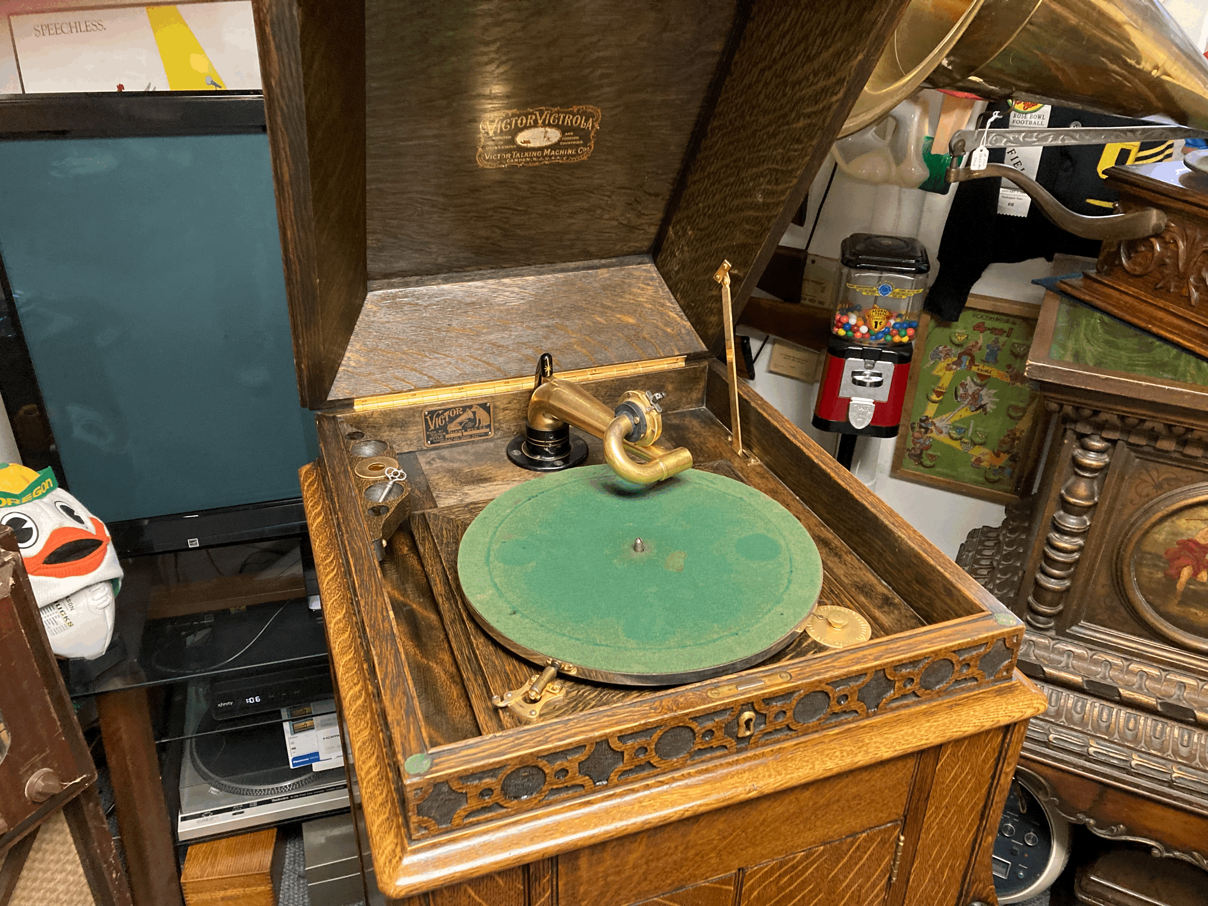 They had trouble in those days with the stains and dyes not being very light-fast. It's discussed in some of the old finishing books I have and that was the attraction to some of the things they did like fuming oak and using arsenic to stain walnut. But then they had to be careful to make sure all of the veneer used in a cabinet came from the same tree and that sort of thing. Some of the suggestions were to add tannic acid to the wood to try and make everything match but there was no way to know (with certainty) until the process was complete. And Victor was not always very careful about how they book matched veneer and that sort of thing anyway so staining was probably the easier path to take. Your machine was probably that "Flemish oak" color as it was called and that was nearly black when it was new. It also had a lot of green in it to kill any red that might be in the oak. They felt that red oak had a more pronounced flake (if it was quartered) than white oak did, so if it was going to be stained really dark, there was no real reason to use white oak since it was more expensive anyway. I've refinished a few pianos that were in the Flemish oak and they were all made around 1907-08 and I've rarely seen that stain used on pianos that were much newer. So that color came and went kind of quickly, and maybe because it was beginning to fade early on. Some of those old finishing books are kind of funny, like one suggesting tying a stout rope around a young guys waist, when fuming oak woodwork in a house and having him open the containers of ammonia upstairs first. "He will appreciate you not having to drag him down the staircase in the event that he is overwhelmed and needs to be pulled out"