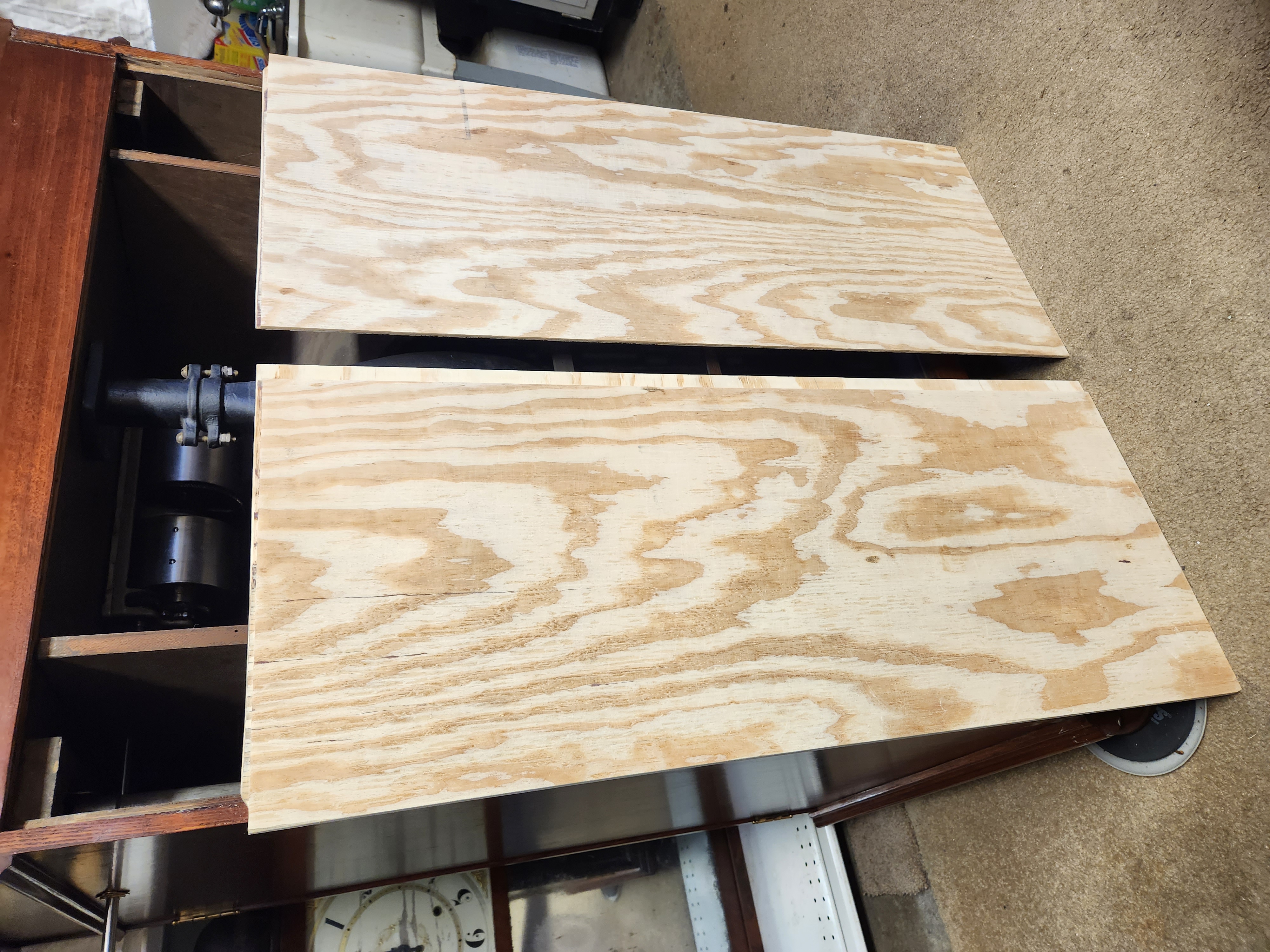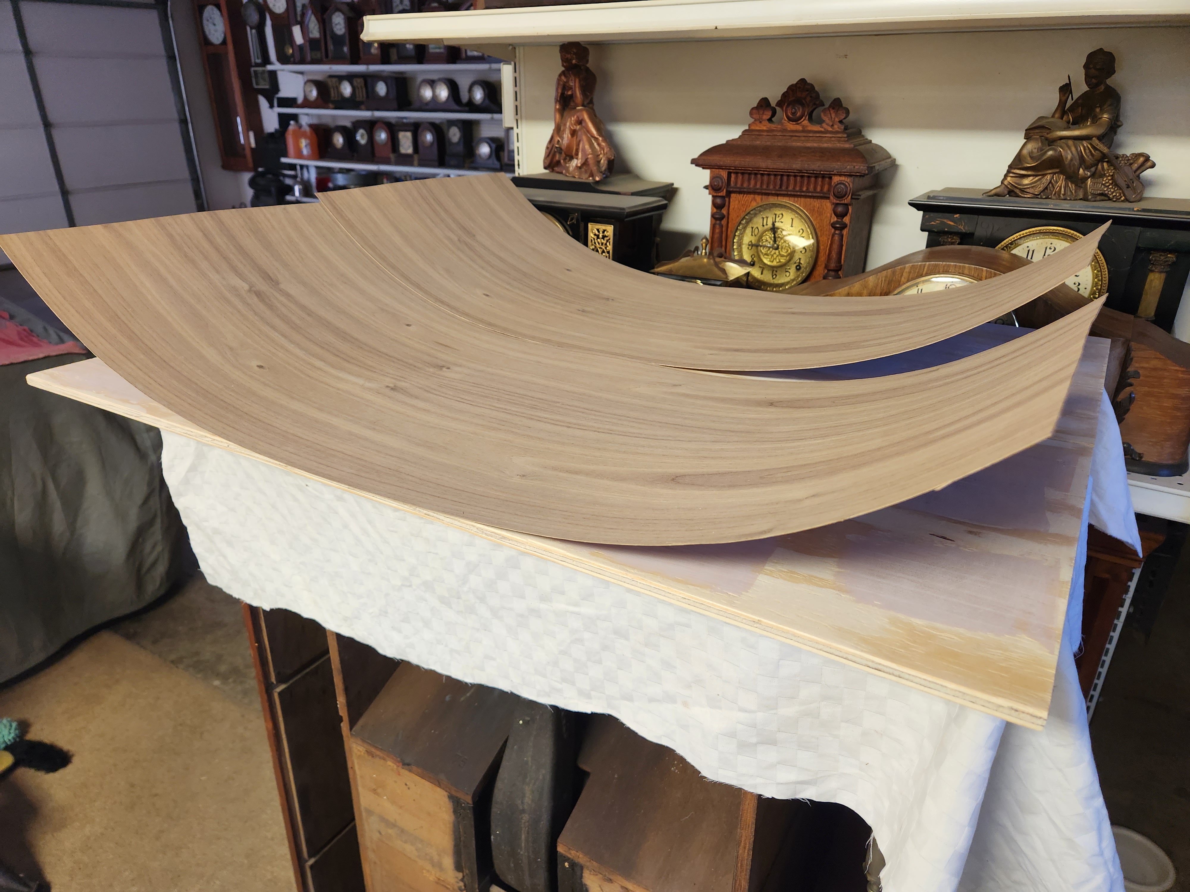 I made new back panel bases to match the old panels out of ⅜" plywood that I ripped and routed to the spec of the old wood. I rough fitted the panels before starting on the veneer.