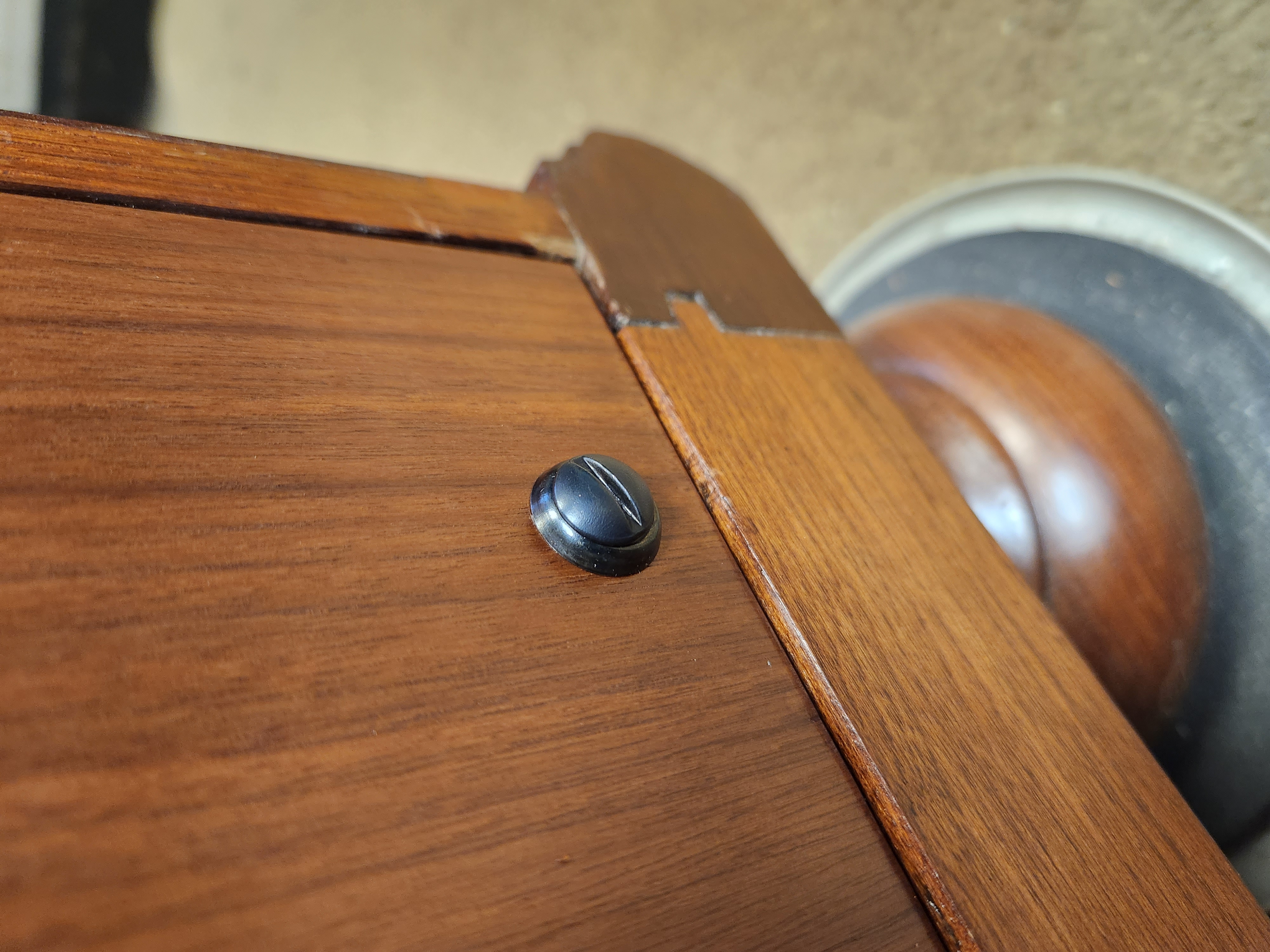 After advice from members and pic's from Jerry I was able to complete the mounting of the new back panels. I bought some truss head screws and some cup washers to use. They were zinc plated steel so I brushed the heads of the screws and the cup washers then I gun blued them for a near black finish. I also did the same to some replacement motor board and tonearm board mounting screws. I sealed the horn joints inside and out with clear silicone and put it all back together.