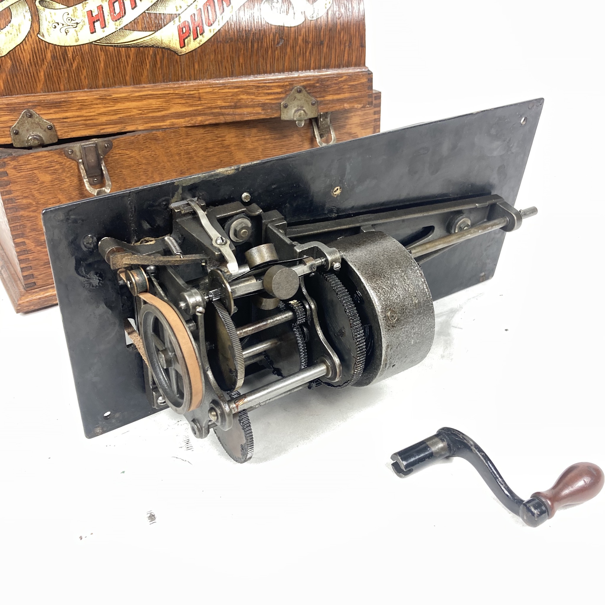 Here is a nice late 1890’s early Edison Suitcase Home with raw brass mandrel, cast iron pulley, and early motor, and a clean early decal cabinet.