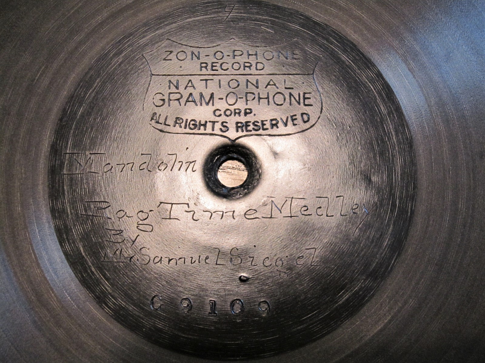 Here is my 7-inch American Talking Machine Record Disk circ 1899. One mentioned earlier in this thread. What makes this even more interesting is its black shellac. The only references to this label states that they were pressed in red / brown shellac.