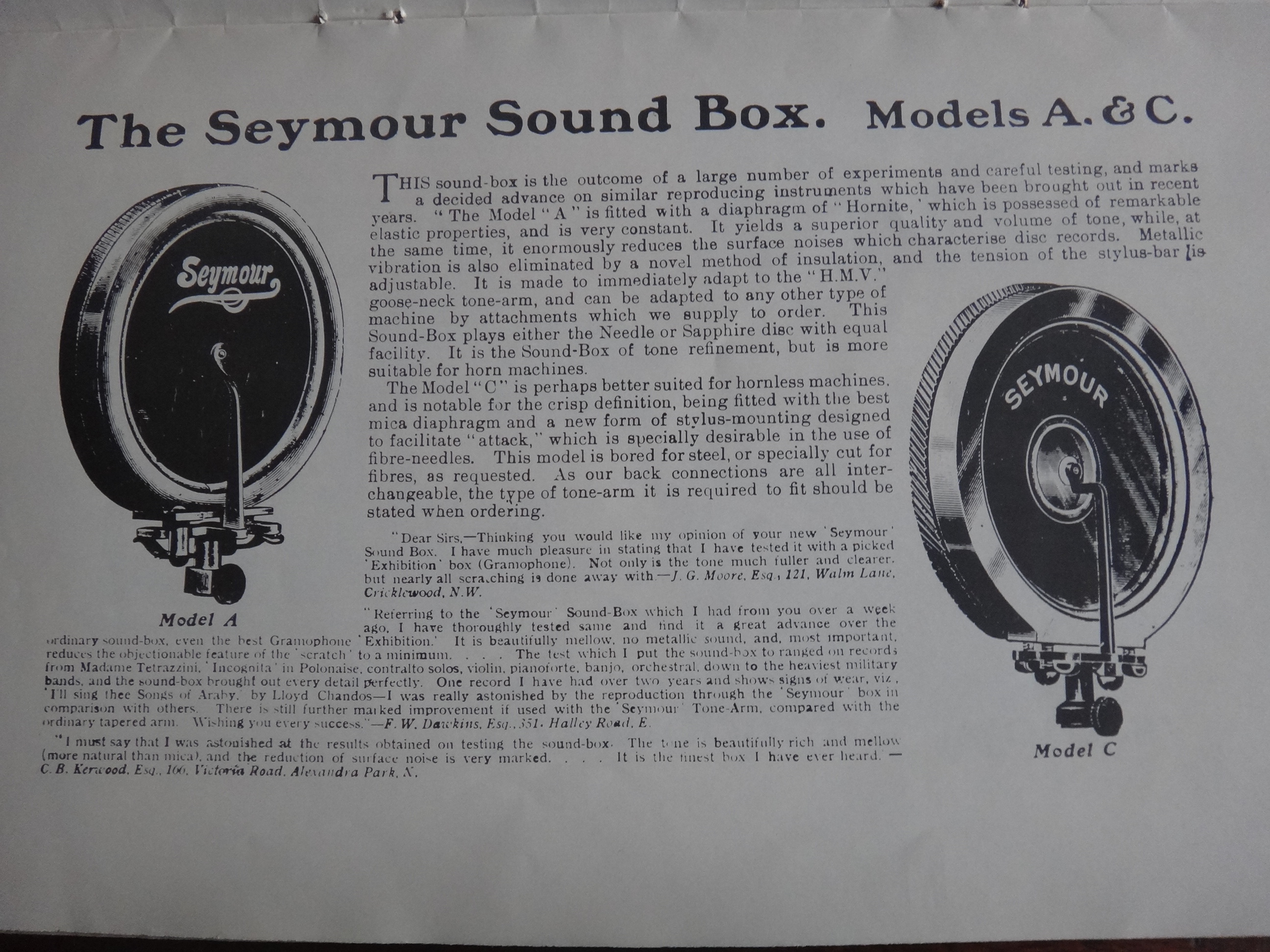In 1923 Ellis Michael Ginn and his brother-in-law David Phillips set out to create the perfect gramophone, and it was to Henry Seymour that they turned for guidance. The Seymour Superphone was their inspiration, and their early EMG machines made extensive use of Seymour's components.