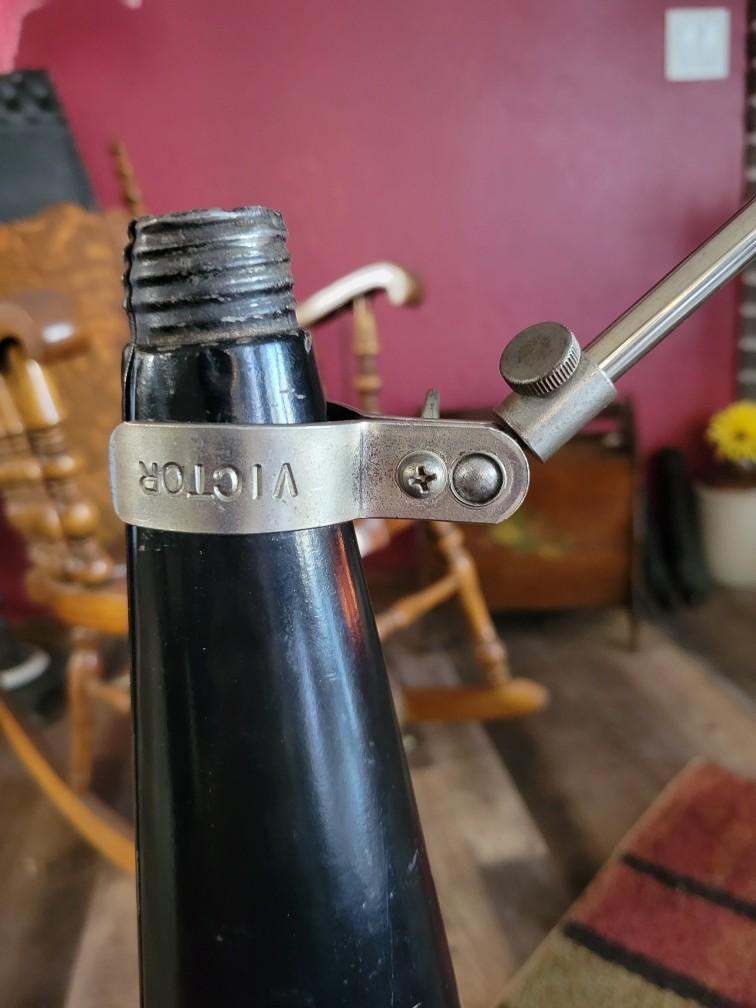 I have what I think is a horn support for the larger front mount horns on the Rigid Arm Victor M's and MS's. I know this has been discussed before but everyone always wonders what the front mount delete block with the hole is for. This would explain why it has a hole in it so that it can support the horn down low or the elbow. It is somewhat adjustable. This would answer some of the larger screw in front mount horn and what they are really for. Yes, I know Victor did make extended arms for some of the sizes of the front mount horns. Just a thought. Let me know your thoughts. In the pictures I have it attached to a 27" front mount horn. And yes, I realize it should be a flat head screw. Thanks, Tom