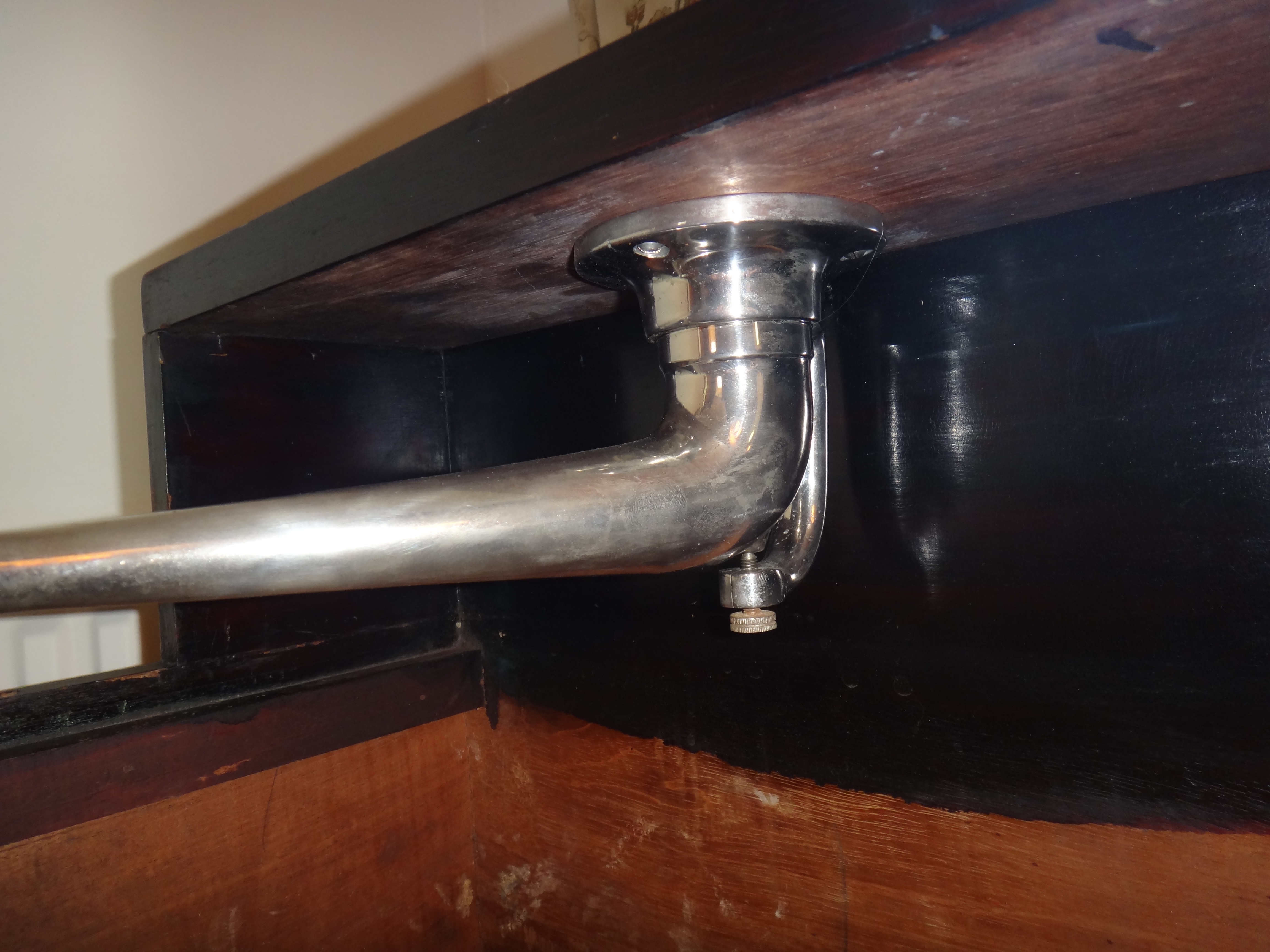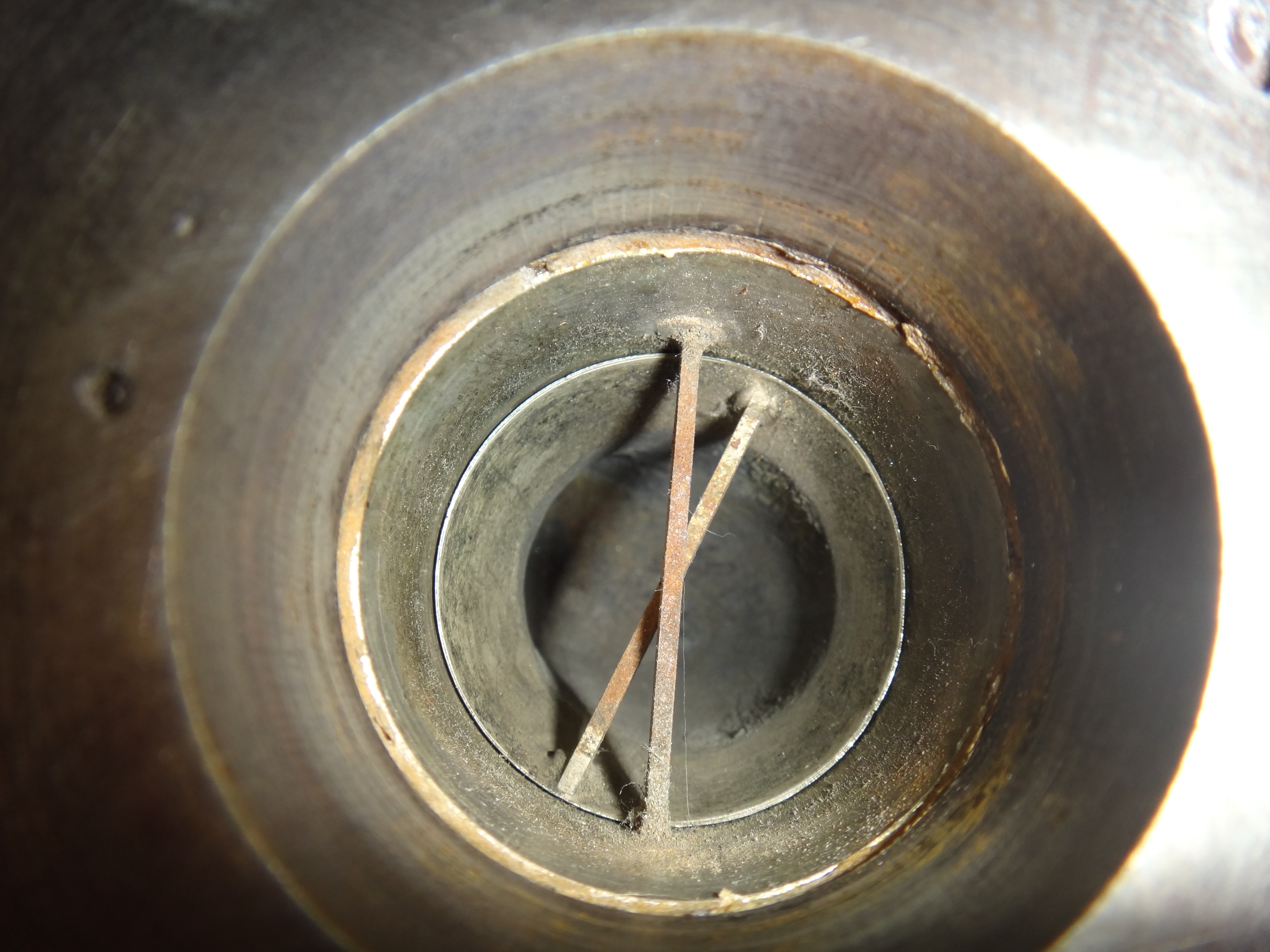 If anyone has any ideas as to the purpose of the internal "braces" in the conduit it would be good to know the thinking. Anti-resonance perhaps ? They do not seem to be particularly necessary from a structural or positional point of view and appear to be soldered at one end only---but the photo may not disclose everything ? Perhaps they are a kind of end thrust limiter for stopping the swivel from going in too deep ? A some stage the mechanism must be dismantled for inspection. The bearing runs very freely indeed. Do your two similar versions have the same detail Chunny ?