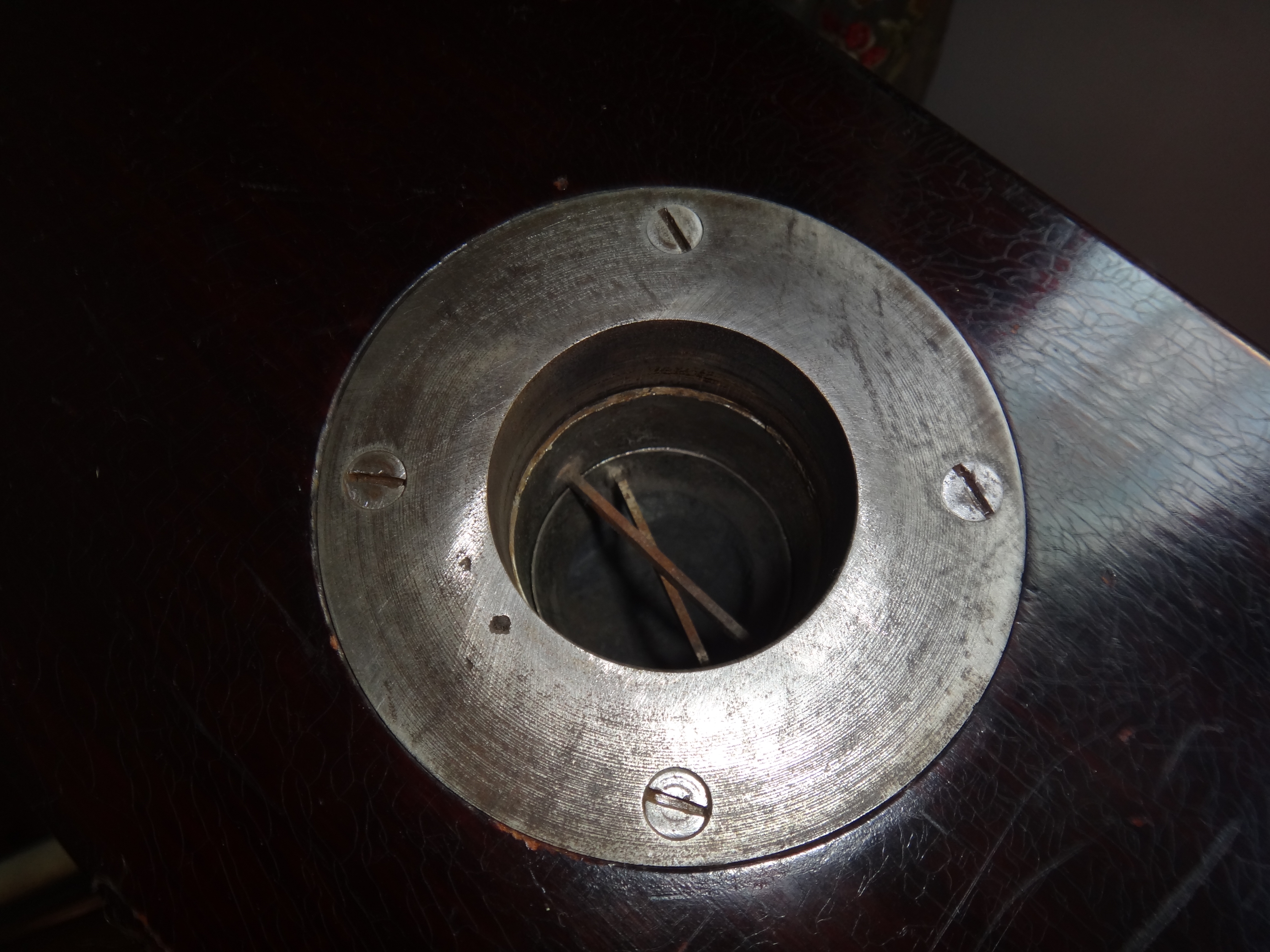 Unfortunately they are both in storage so I cannot confirm for sure but I remember the same braces on my black one but the oak one has flat brace rings as found on most HMV and Victor horn models. There is a spring loaded pivot pin that centers the tonearm. The two ring braces separate the horn from the tonearm so they can move independently.Do your two similar versions have the same detail Chunny ?