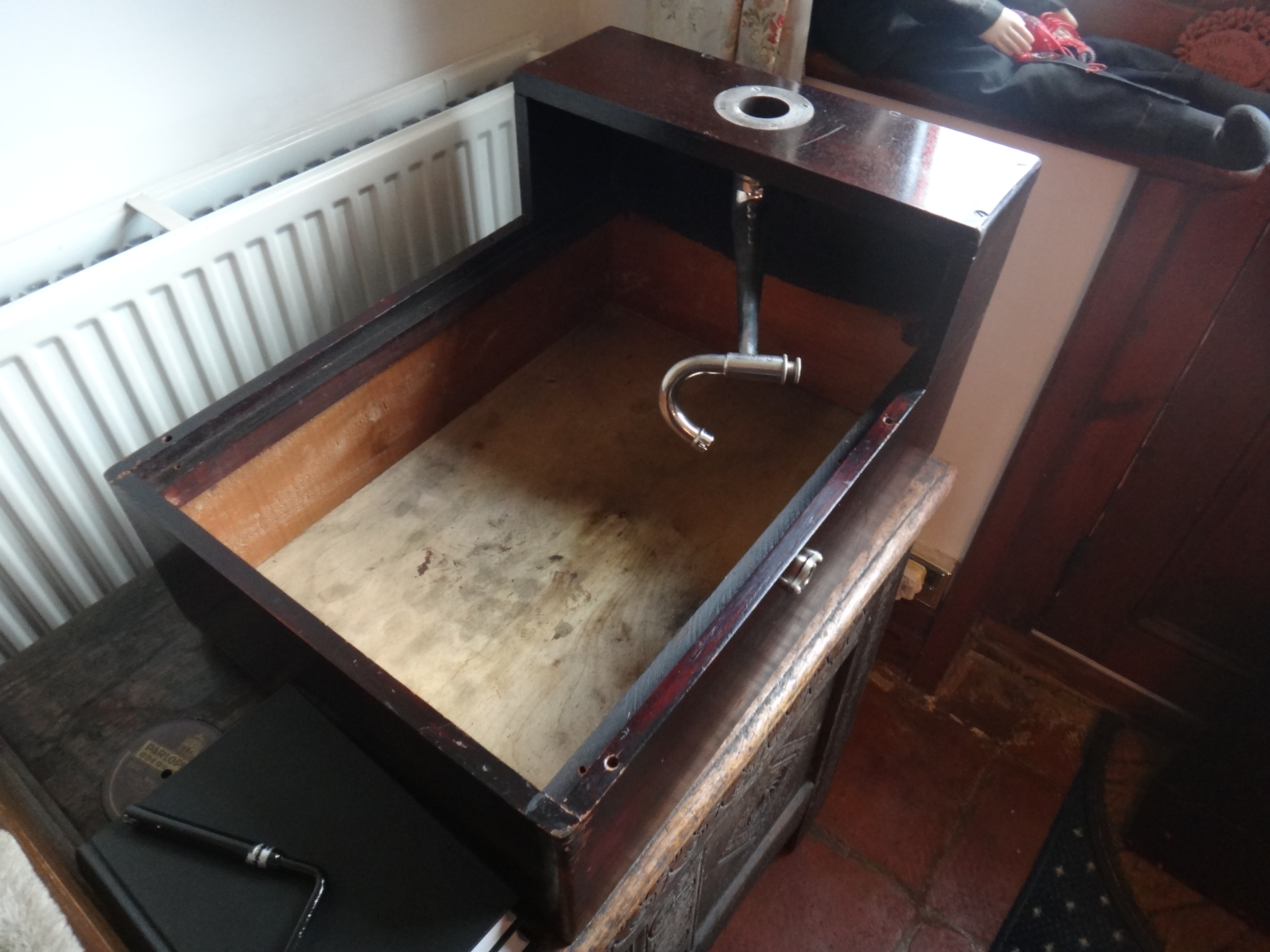 This hyper-rare gramophone with doweled lid---a unique discovery to date---has apparently had little use and is in amazingly good condition after about 94 years since production. It was found, carefully preserved, in a house in London at the time when the widow of the owner was selling records. It had been in an attic for many years and the lady first discovered only the horn. On another occasion at a later date she discovered the base unit ! She did not know any more details except that her husband had been a keen gramophone/record collector and had bought it some decades previously---probably in the nineteen-seventies. She was absolutely certain that her husband had never had any connection with Cambridge University so, sadly, that trail has gone cold.