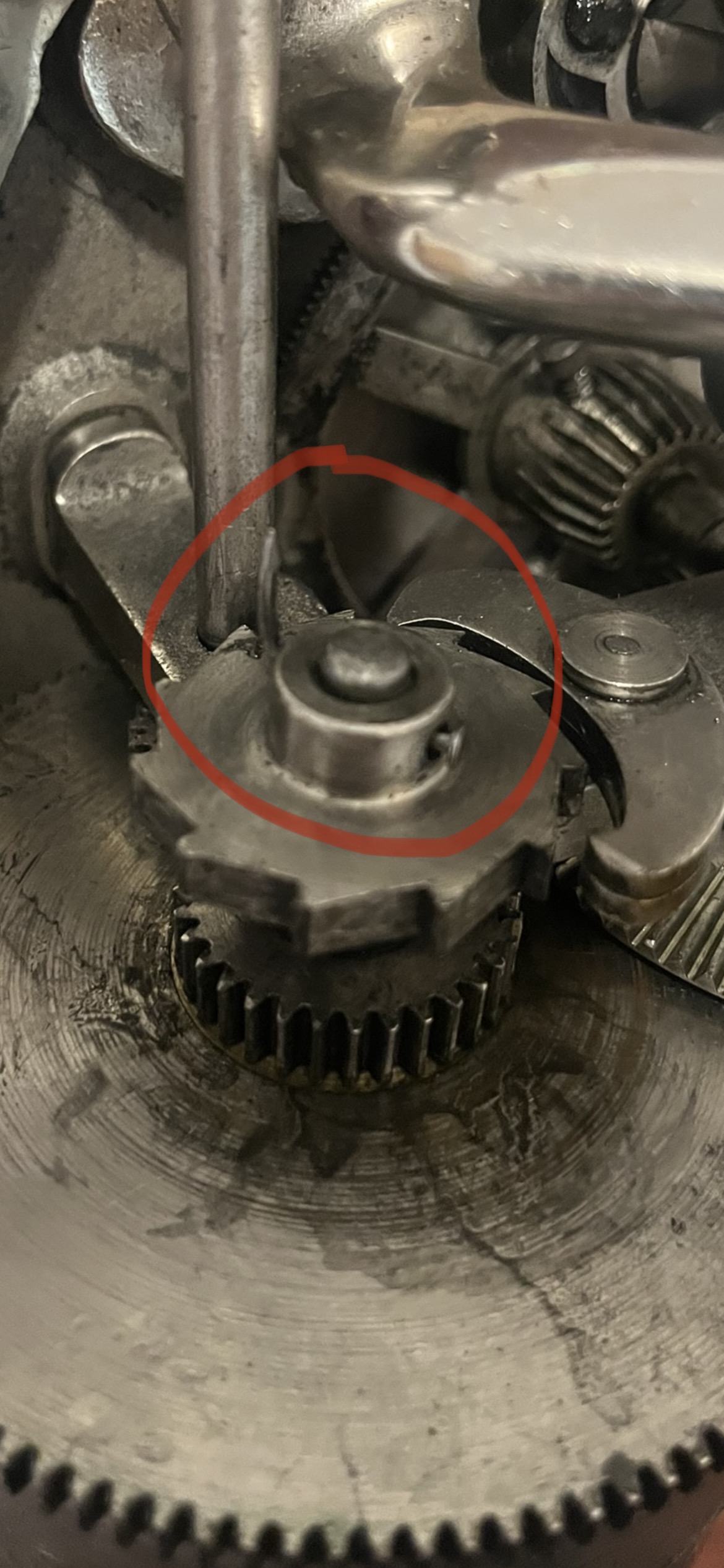 There is a nail holding the ratchet gear in place instead of a pin or screw. However that that I have gone through it more, all the motor needs is some greasing. The speed control knob is stuck in position. Something is too tight. Does the gold knob on top loosen?