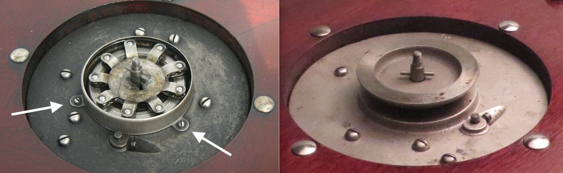 The nut in the top of the spindle can be reproduced with a counter bored extension like the one on a VV-XVI D, or a short sleeve can be added over the short cylindrical end of the spindle the prevent the turntable from “yielding “. I would prefer this to adding bumpers, (and holes). The risk of bending the spindle seems pretty low, but would need to be considered. The later motors had a .375” diameter spindle rather than the .3125”. The Victor D has a 12” cast turntable and a .3125” spindle like the Pooley and the 6, but had no ball bearing race or yielding turntable and seems to do fine.
