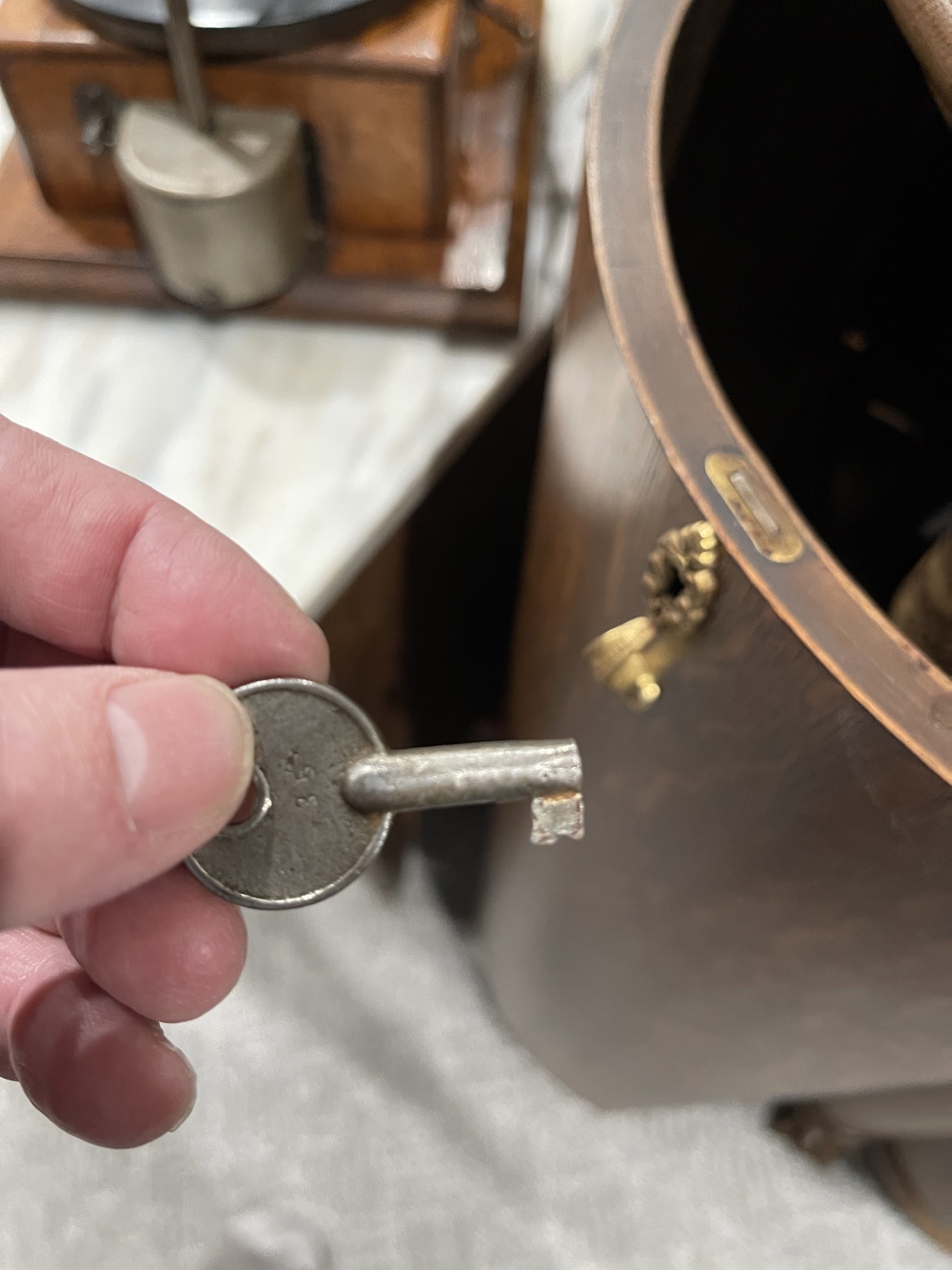 Just restored this oak double Salter cylinder cabinet, looking for a key that will operate the locks. Attached is a pick of a key that sort of works but is certainly not a period key or correct. Thanks in advance for any help! GSS