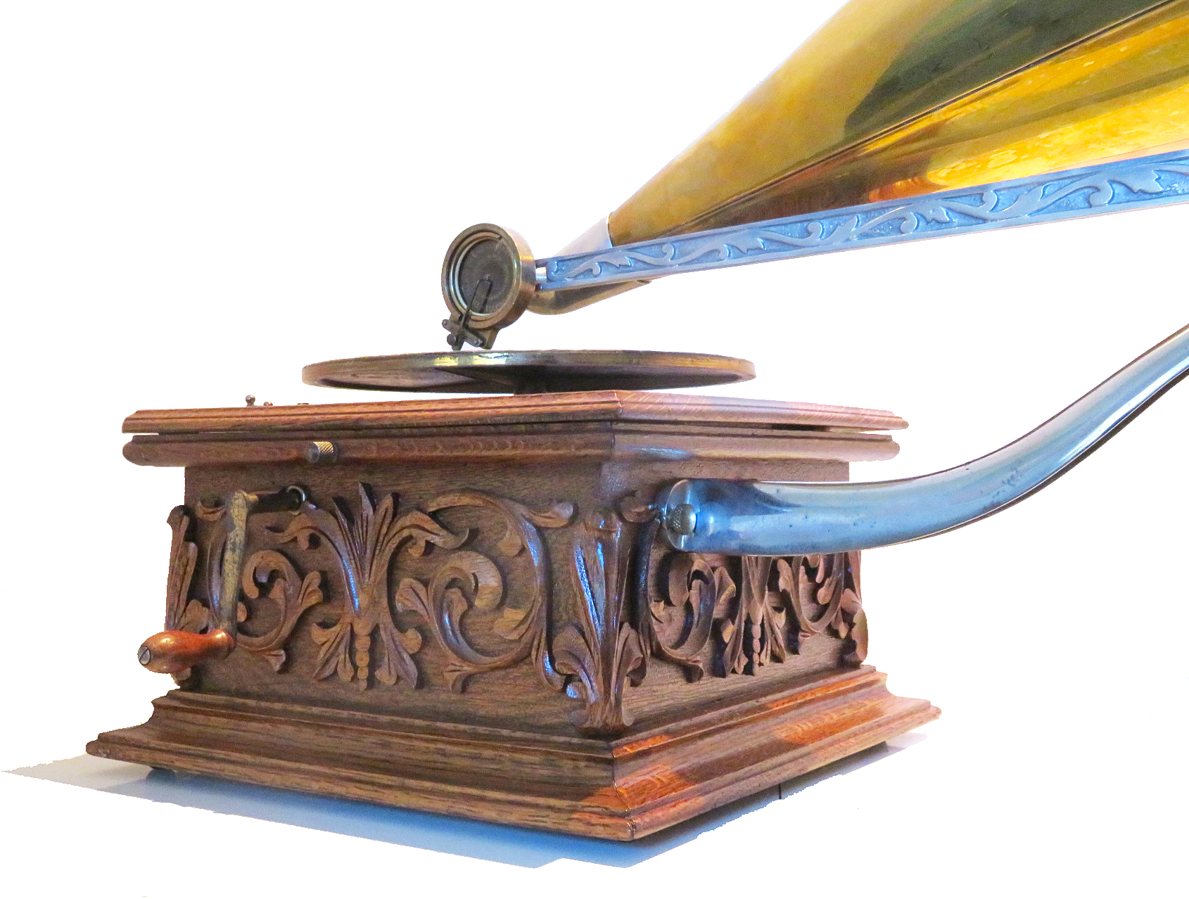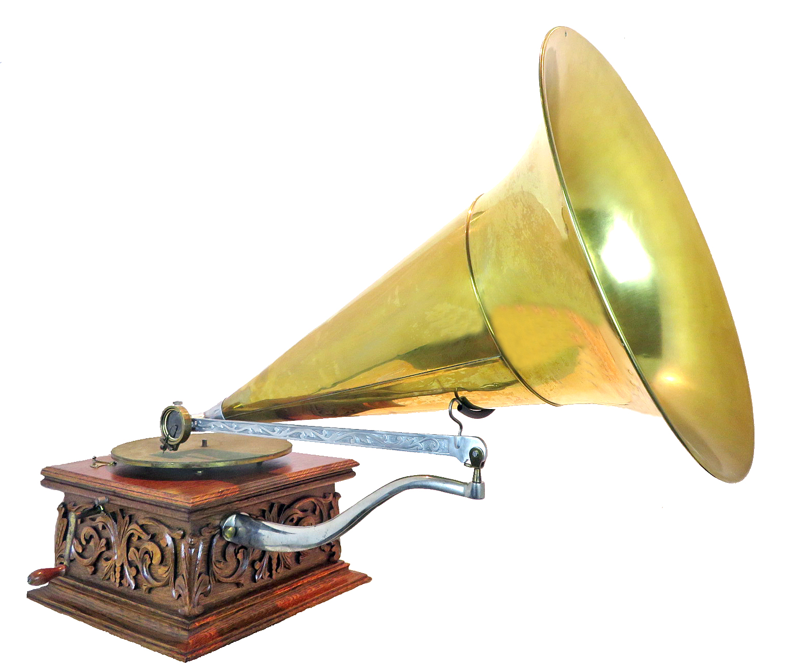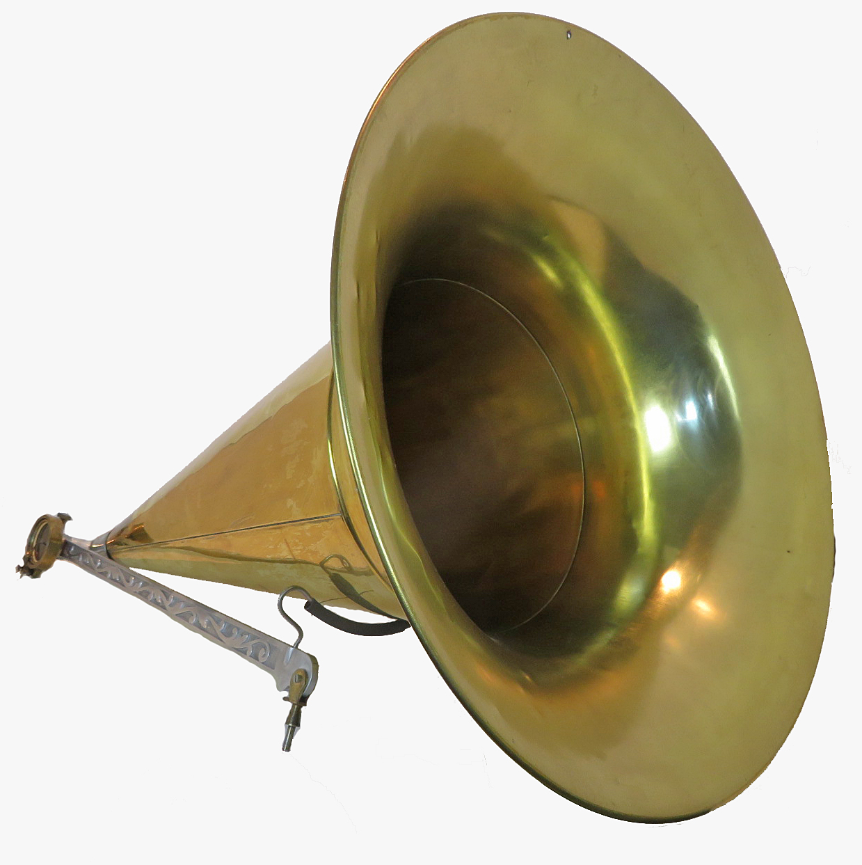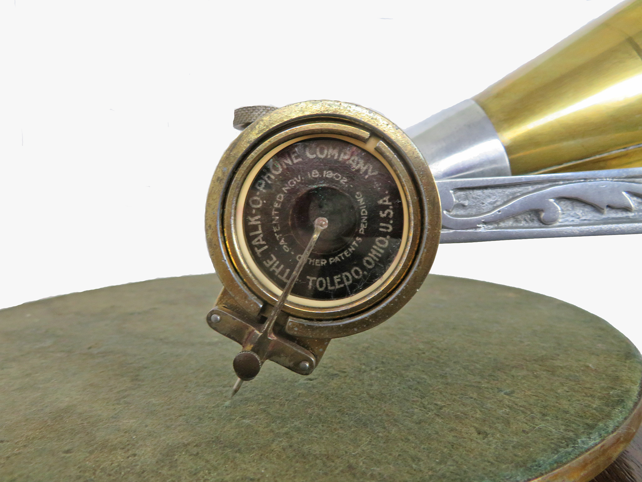 Talkophone Deluxe was special because of the 18” arm and some gold-plated parts. The horn is all brass and measures 26” long and 17.5” wide at the bell. The motor is the large 3-spring motor which in this case has been fully serviced and springs regreased. The horn is nearly perfect except for a pin hole in the rim seam at the end of the bell. It is the largest Talkophone horn made. The platter felt is original.