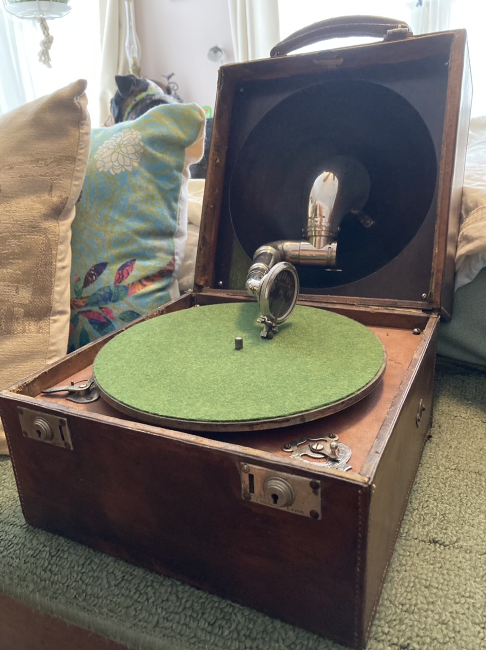 Early Sonora and Decca portables with reflective horns are often called “Trench Phonographs”. I doubt that many were actually in the trenches. My Sonora has a calf skin covering and a wood horn.