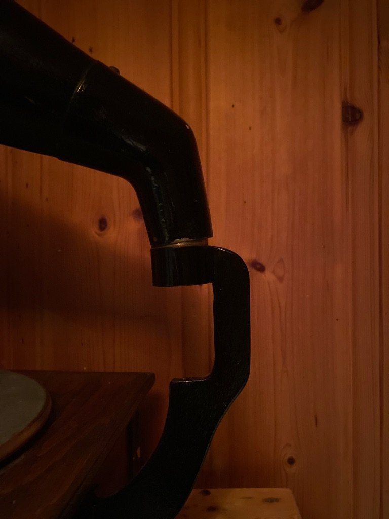Fortunately epigramophone saved his pictures so maybe those will last another couple of years. I had an example similar to this although not as nice with a rather damaged black horn. As I recall the Plano Reflex tonearm made for the last external horn machines was a unique part. A Plano Reflex tonearm taken from another machine would need to be turned upside down to connect to the horn on an outside horn machine, the soundbox connection would therefore face the wrong way. The tonearm on the machine in question looks adapted. There appears to be screw holes to the top side, these may be from the piece that located with an automatic brake below.