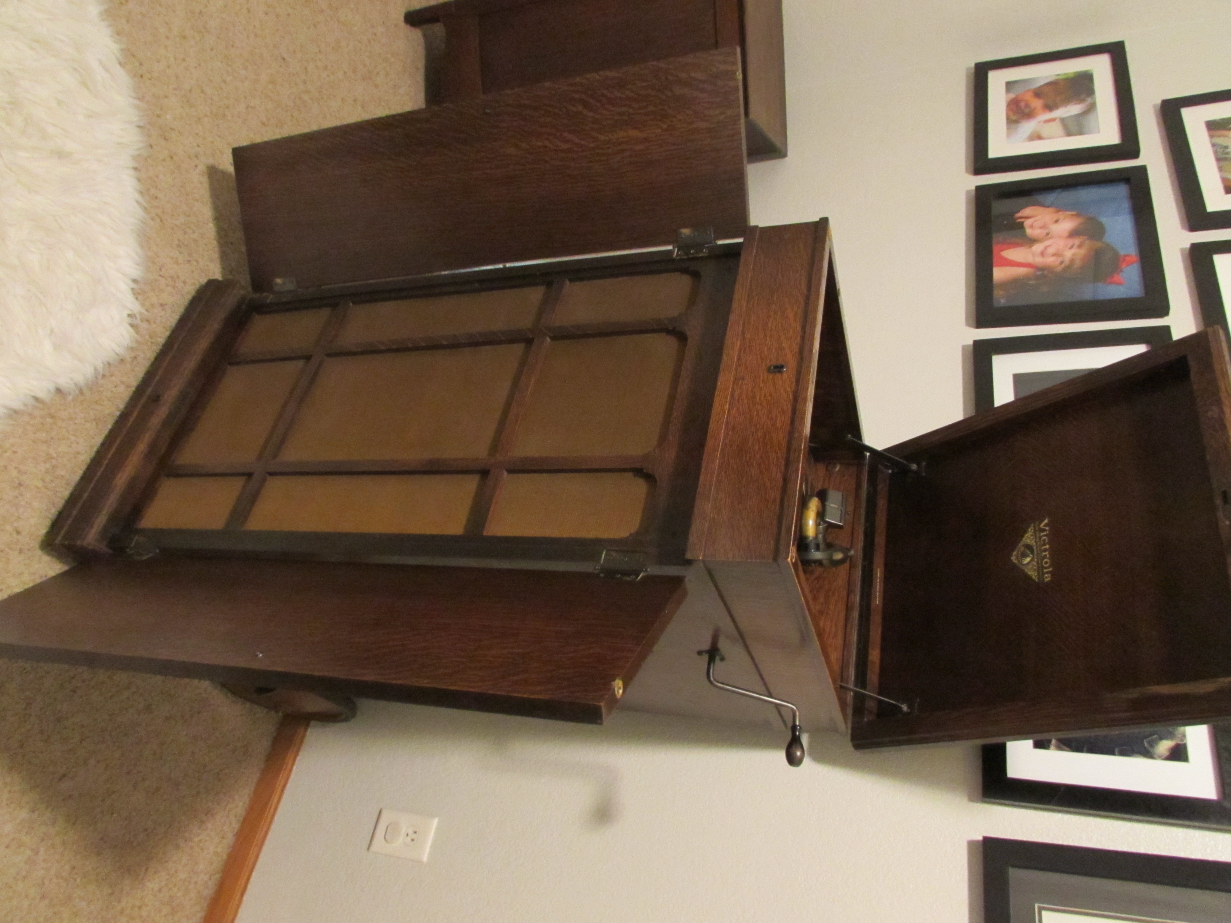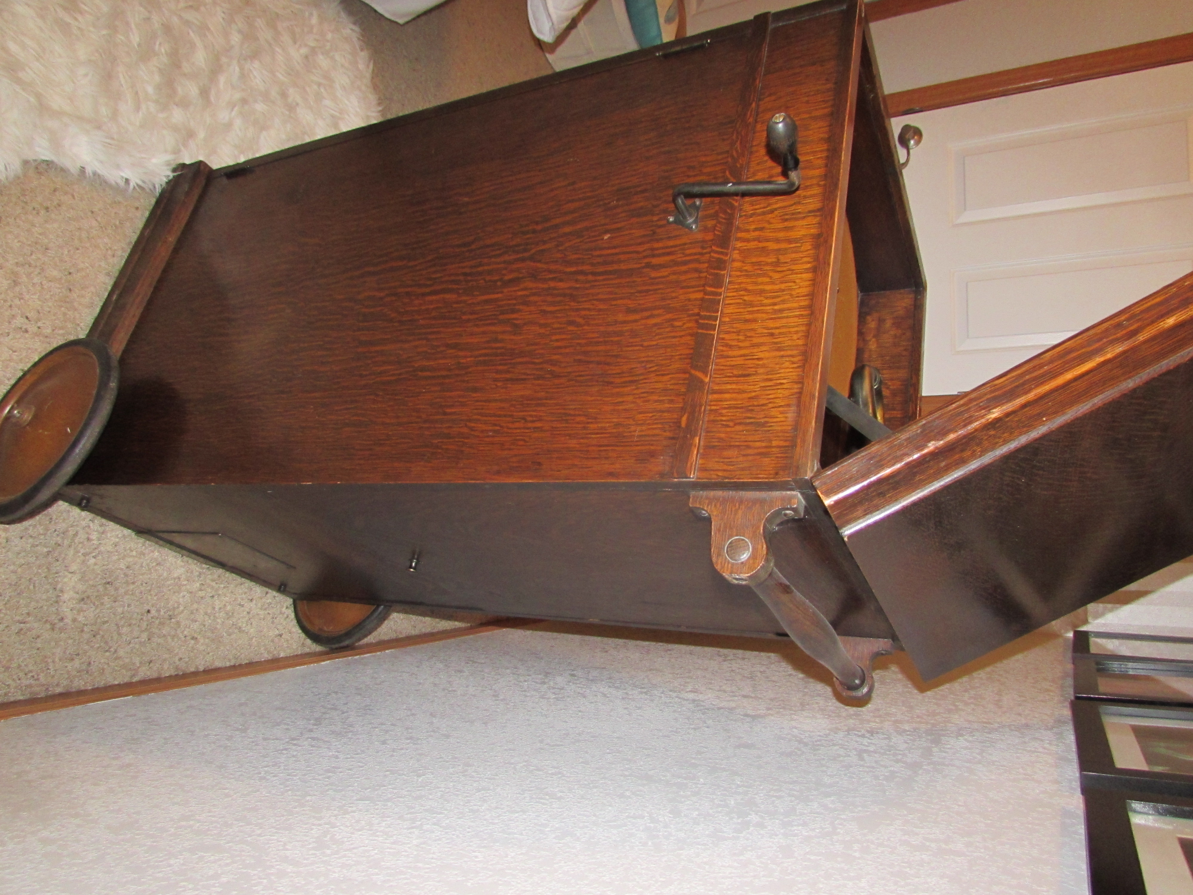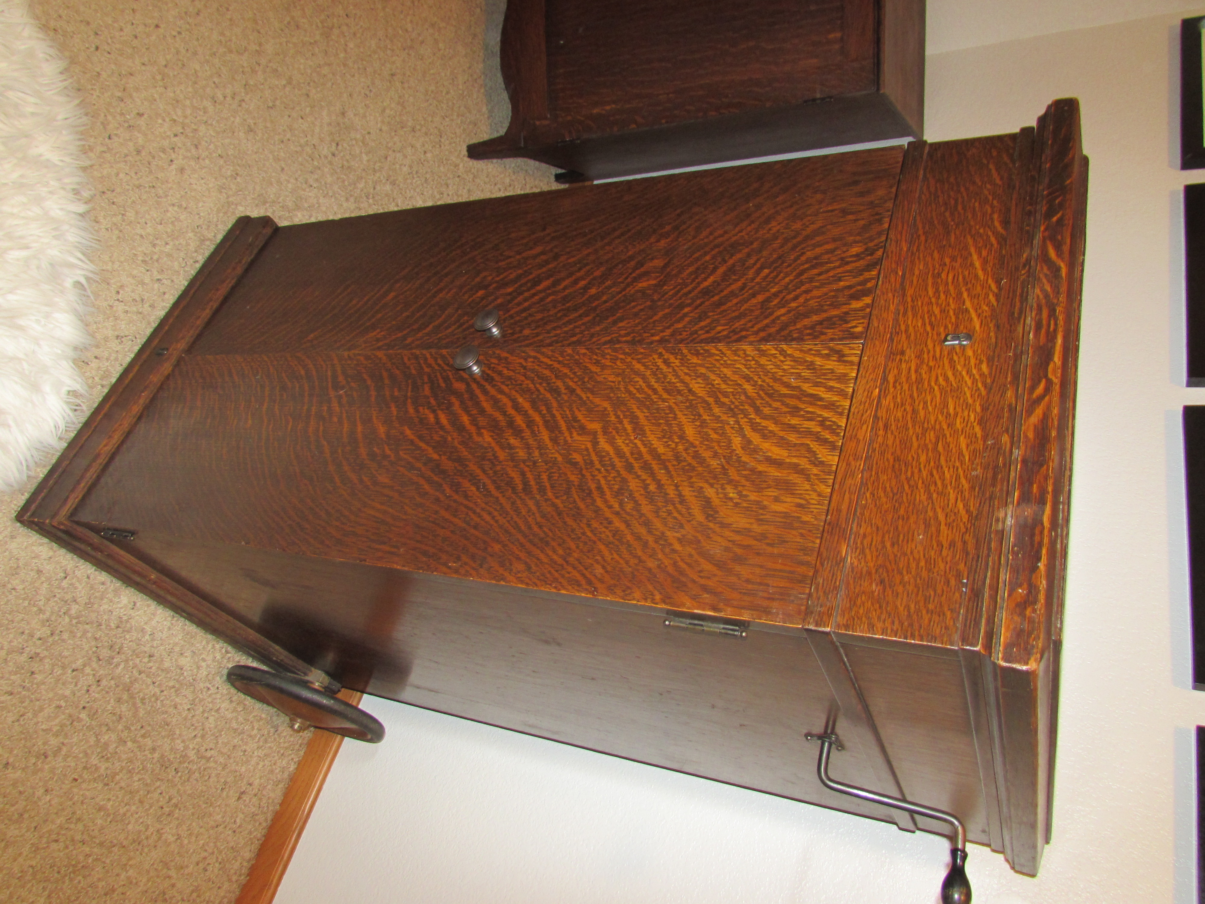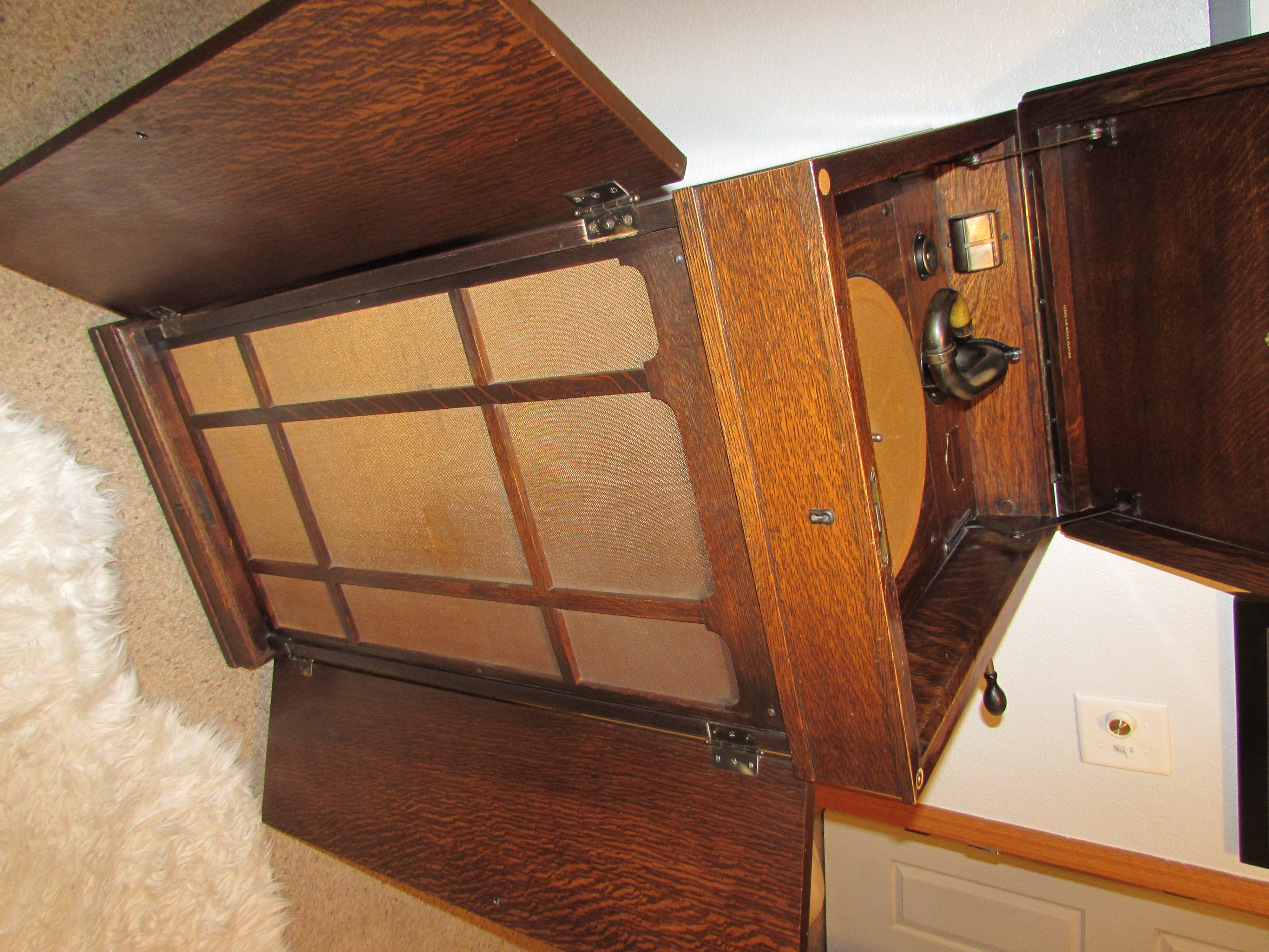 The 8-7 was a very unpretentious 'oak box', with minimal decorations. It was easily moved around via the presence of large wheels located in back of the cabinet; a large handle in the rear made guiding the machine an easy task. It featured nickel-plated hardware, an automatic brake, and a large 'folded' (re-entrant) Orthophonic horn, and could provide surprisingly good performance at a sound volume which could easily fill a large room.