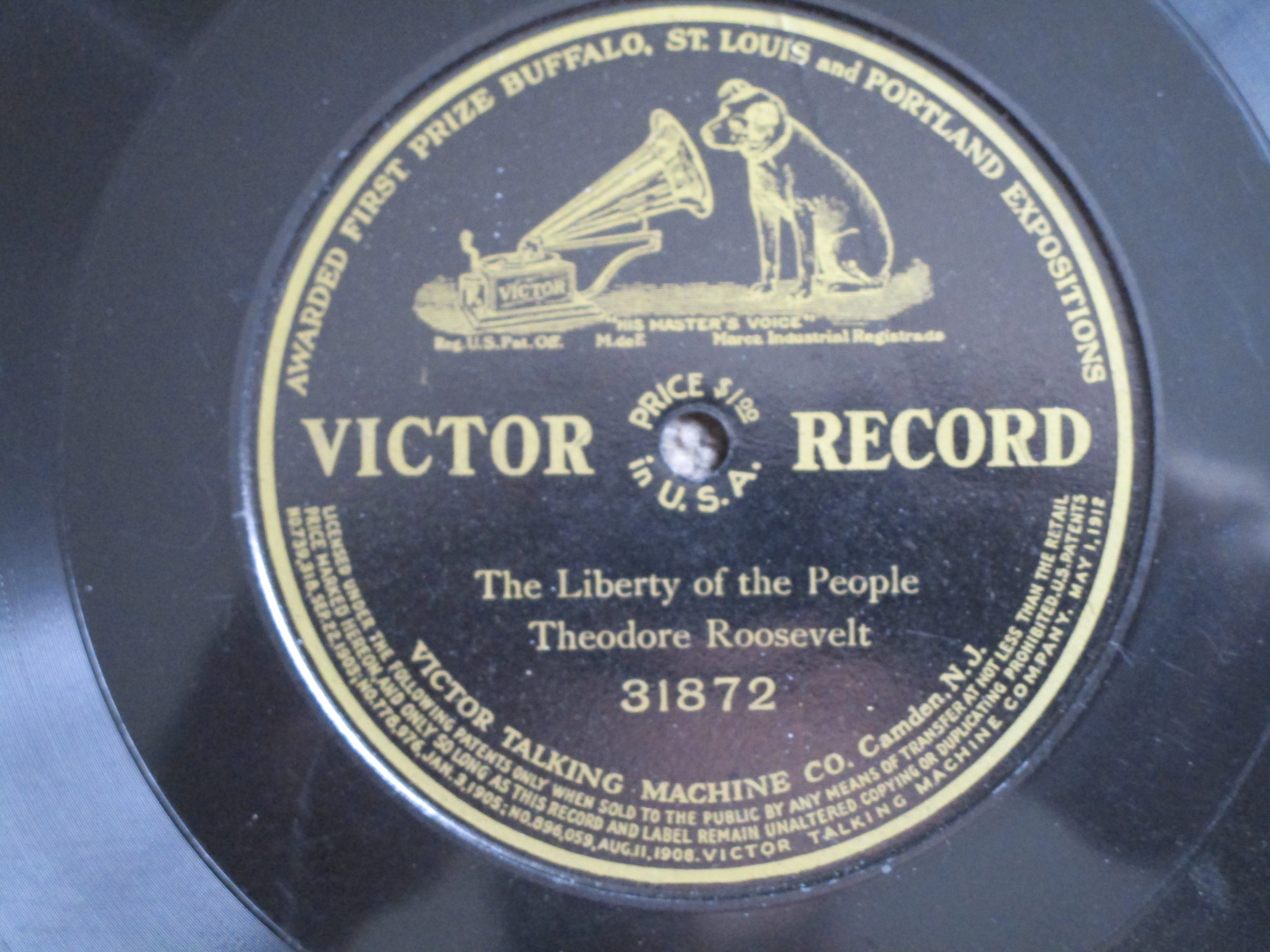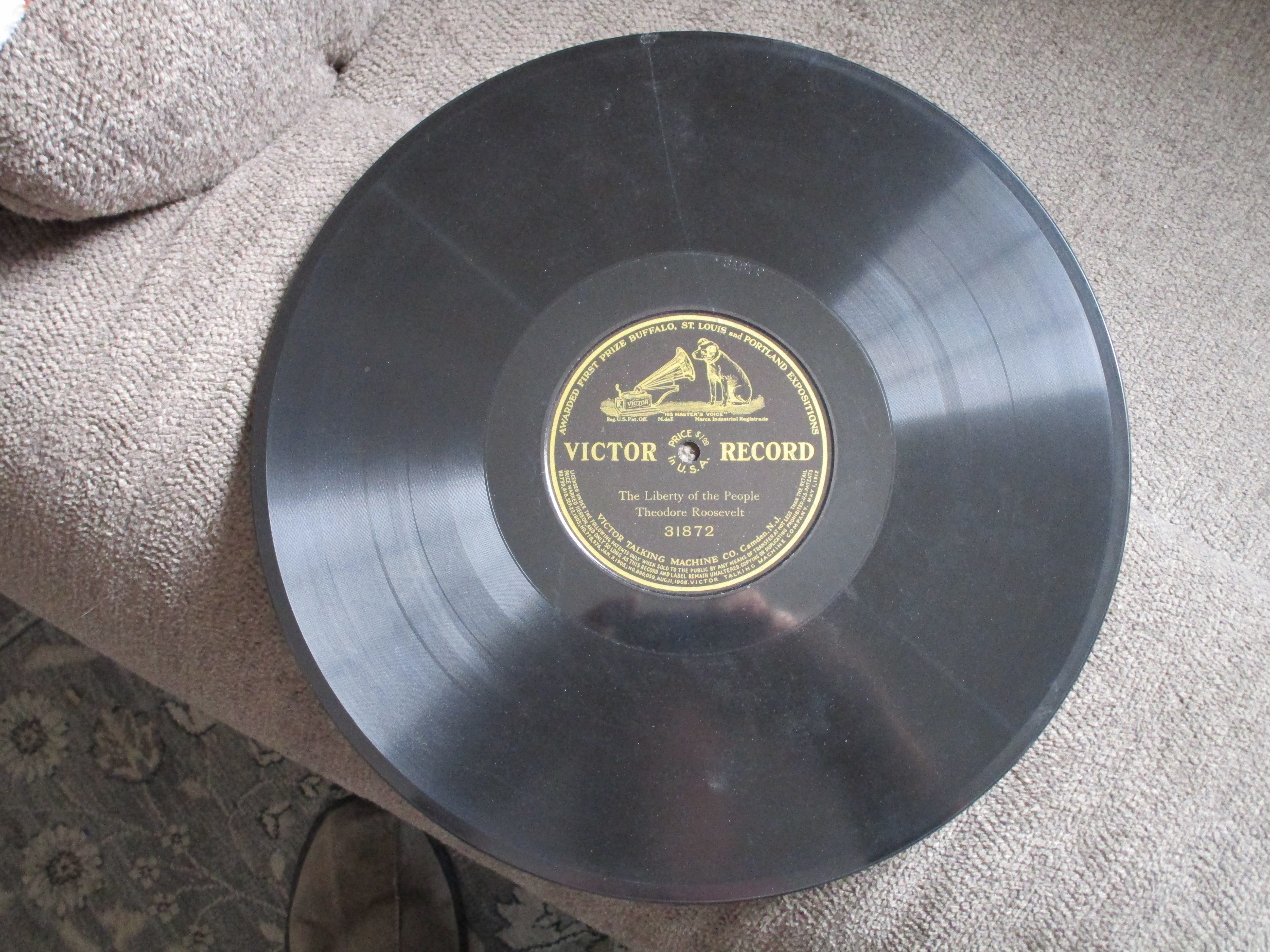 12. Rarely Found - Theodore Roosevelt 12" Victor Patent Label single sided record "The Liberty Of The People" - long crack that was carefully repaired - plays fine with light click as expected - $50