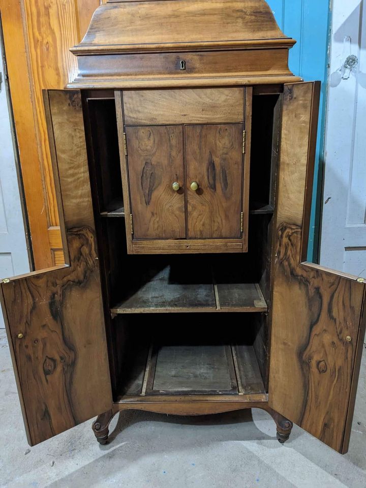 I said I wasn't going to do this anymore. Then this came up for sale not far from me and I couldn't resist. A circassian walnut L-door XVI. And I only paid $60 for it. OK before anyone starts commenting "deal of the year", I did say it's a project. The machine looks great and most of the wood is present, but the inside is gutted. The old owner made it into a beverage bar. I understand the appeal by some to do this, but to do it to a circassian walnut machine? It boggles the mind. The person obviously had no idea what they had.
