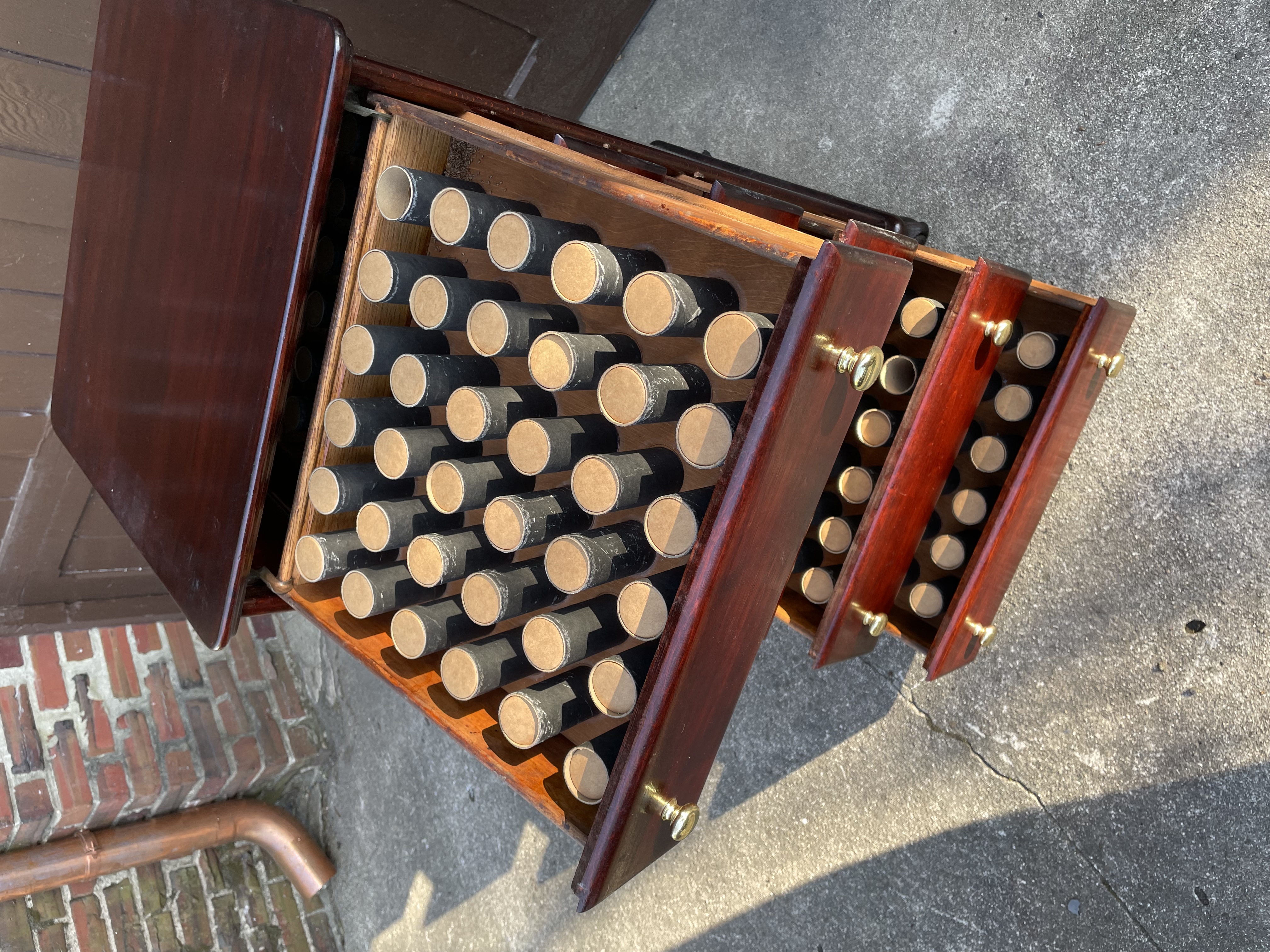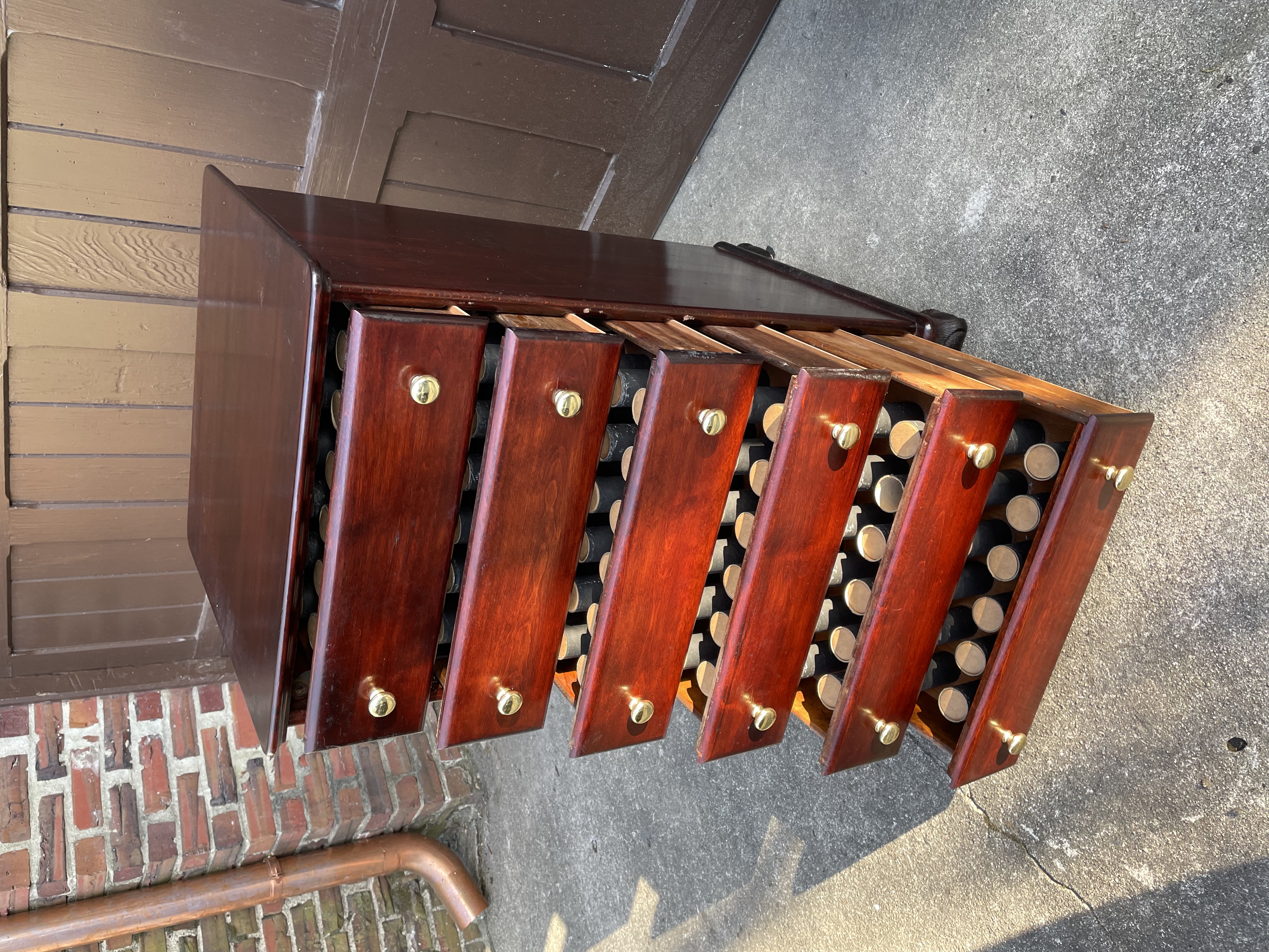 Clean mahogany cylinder cabinet with six drawers that hold 36 cylinders each, 216 total… all pegs are present and all but a handful are fully intact, a few are missing the tops… $425.