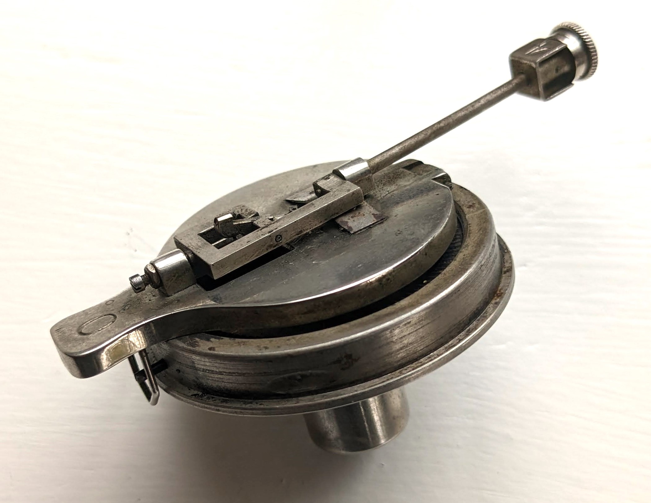 A not commonly found reproducer for an early Eldridge R Johnson/ Victor Machine. This reproducer would be correct on an early ERJ A, B, C, or D as well as early M. That being said, this is the longer throat version, excessvley rare, and the only one that will work with a horizontal tone arm. It also works on a vertical tone arm. It is in excellent condition. The linkage is original and completely in tact. It is loud!!! There is no damage to the knurling. It has great nickel plating. The locating pin on the back is present. It is absolutely ready to put on your machine. A very, very hard reproducer to find available seperate from a machine!!!