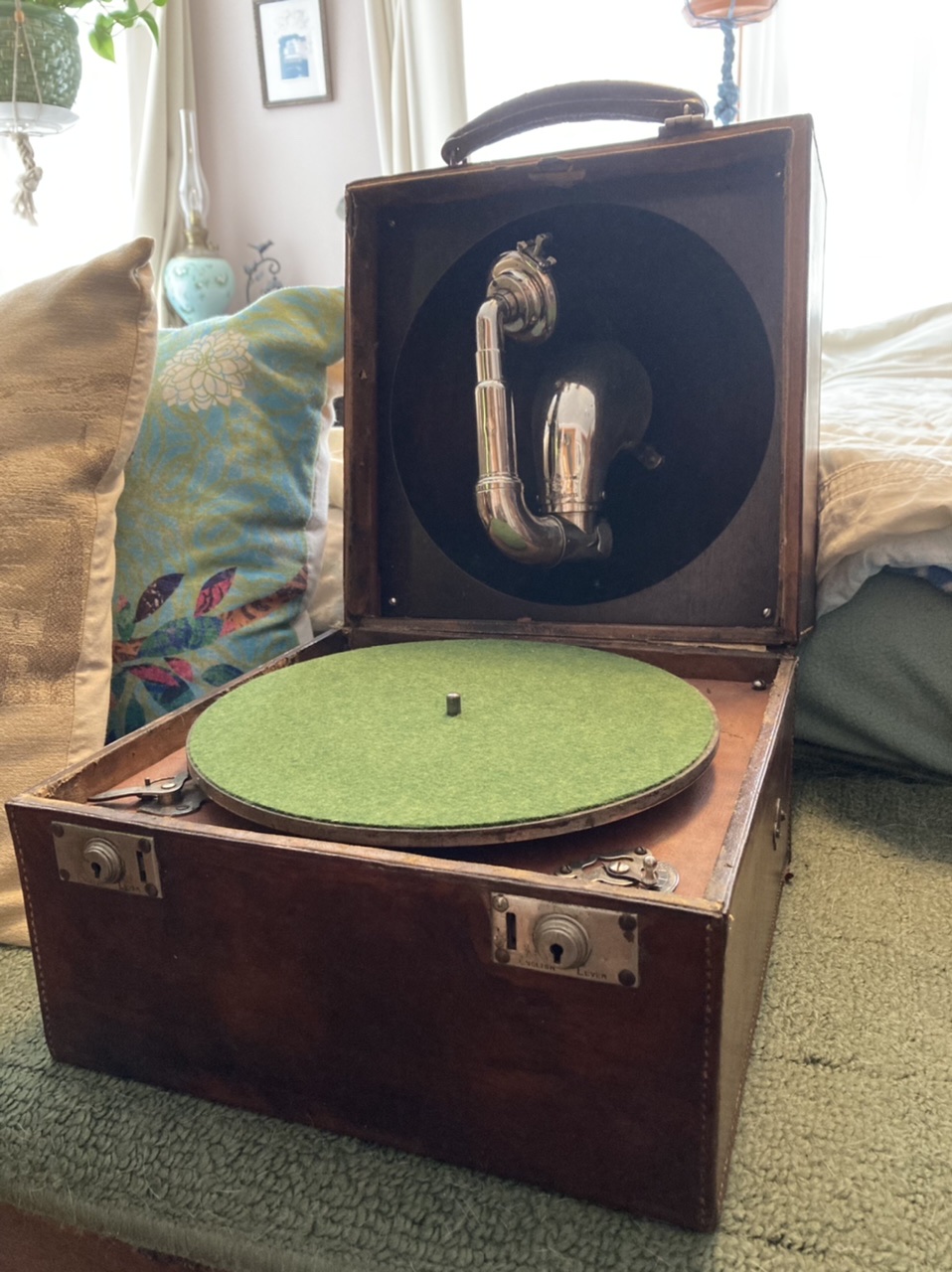 Early Sonora and Decca portables with reflective horns are often called “Trench Phonographs”. I doubt that many were actually in the trenches. My Sonora has a calf skin covering and a wood horn.