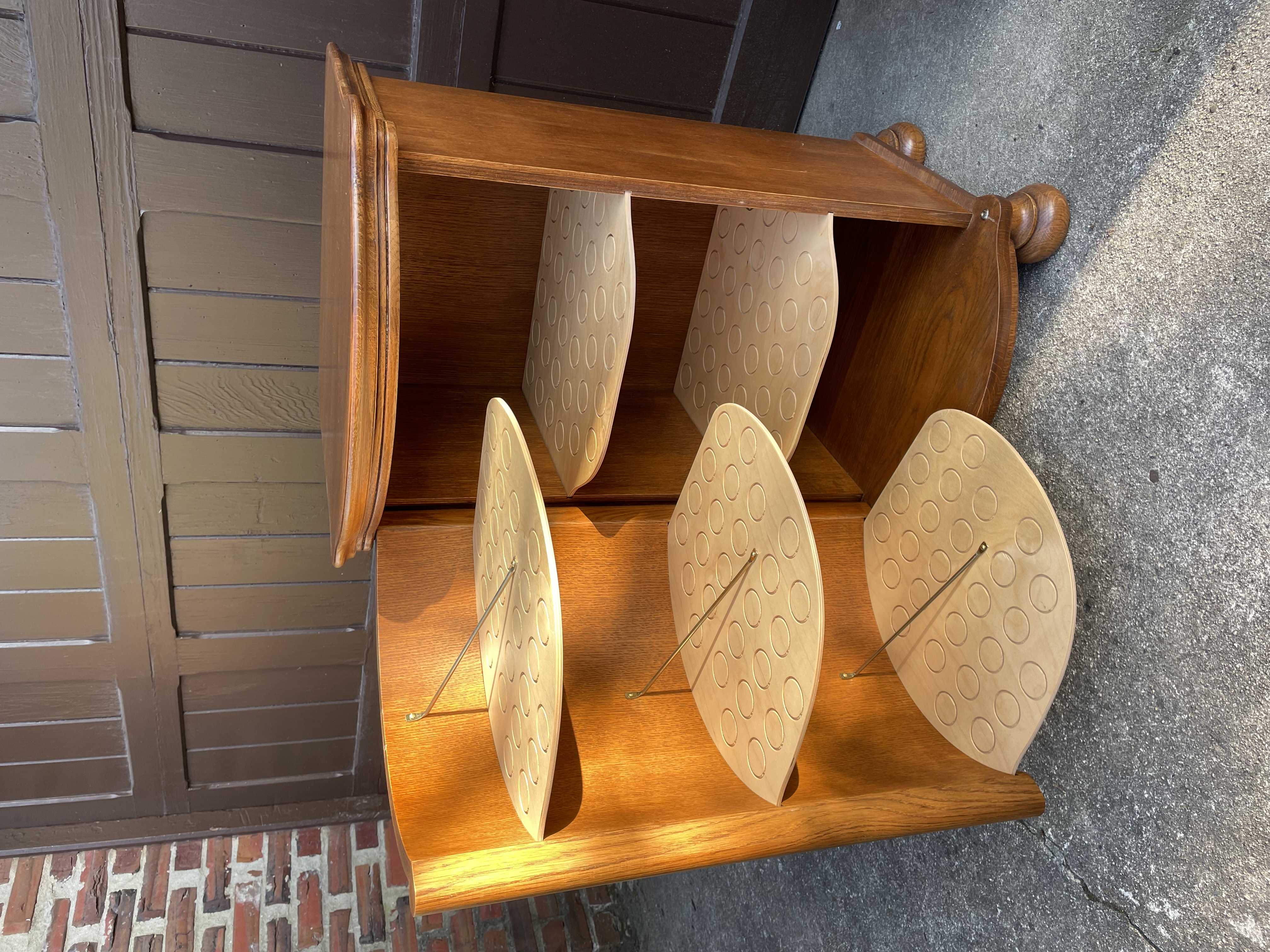 Extremely nice super clean reproduction oak Herzog half-barrel cylinder cabinet… all together, the five shelves can accommodate 147 cylinder pegs… these high quality accurate reproductions were being produced in a very limited run about 15 to 20 years ago, they weren’t cheap and as I recall the pegs were sold separately… $1100.