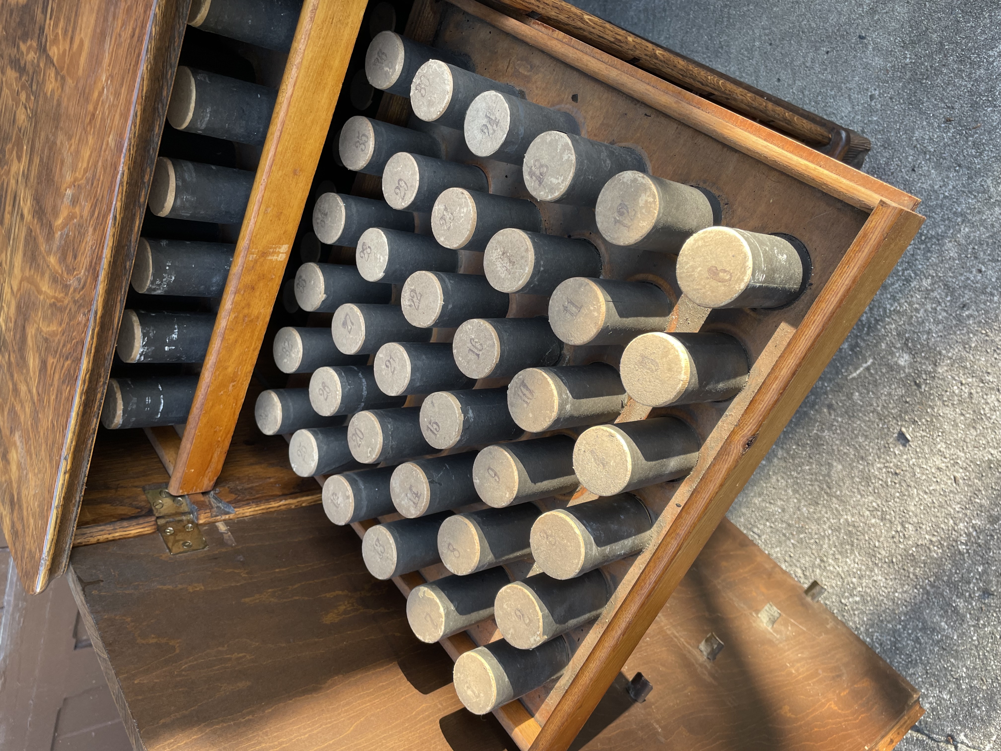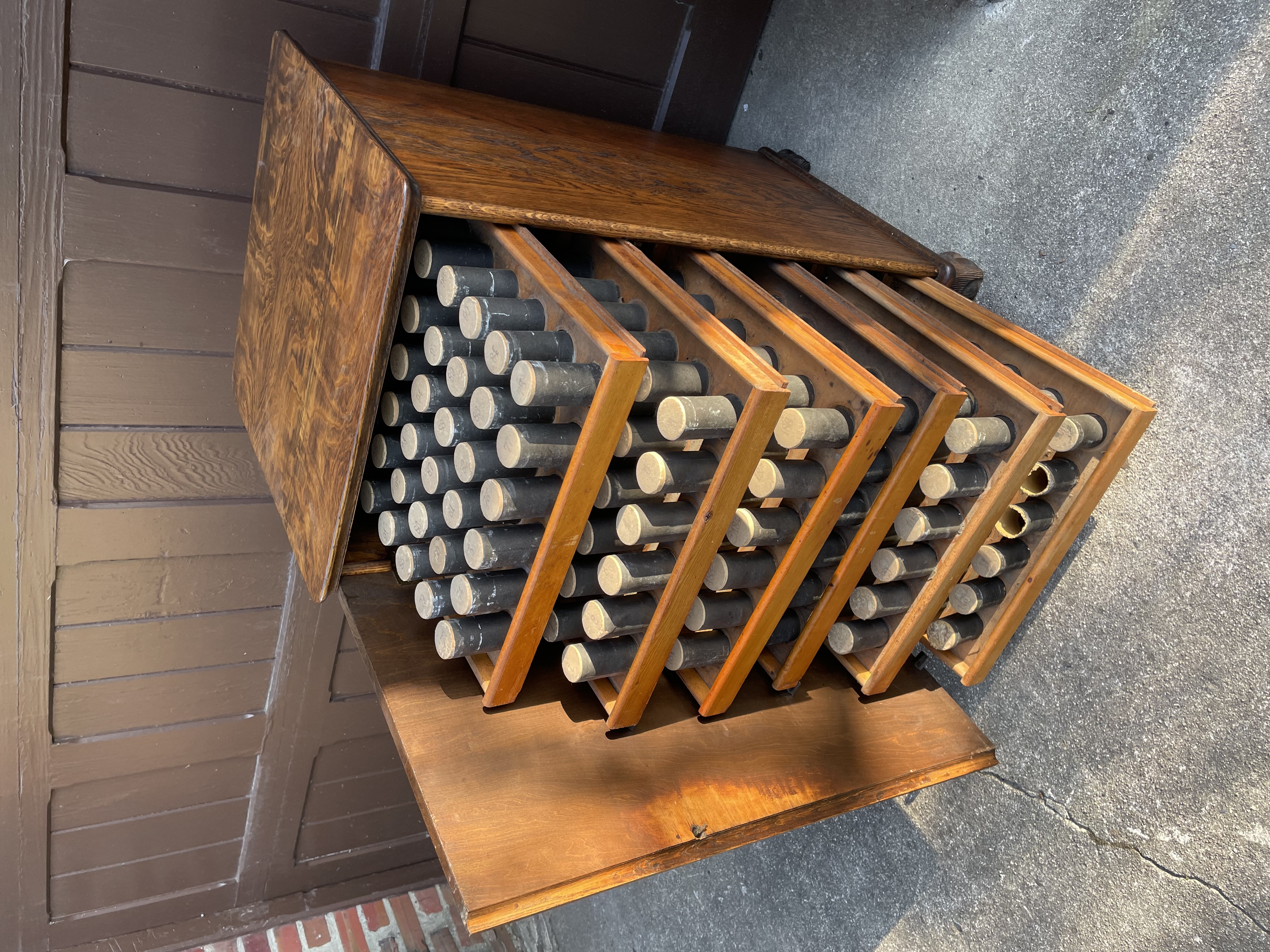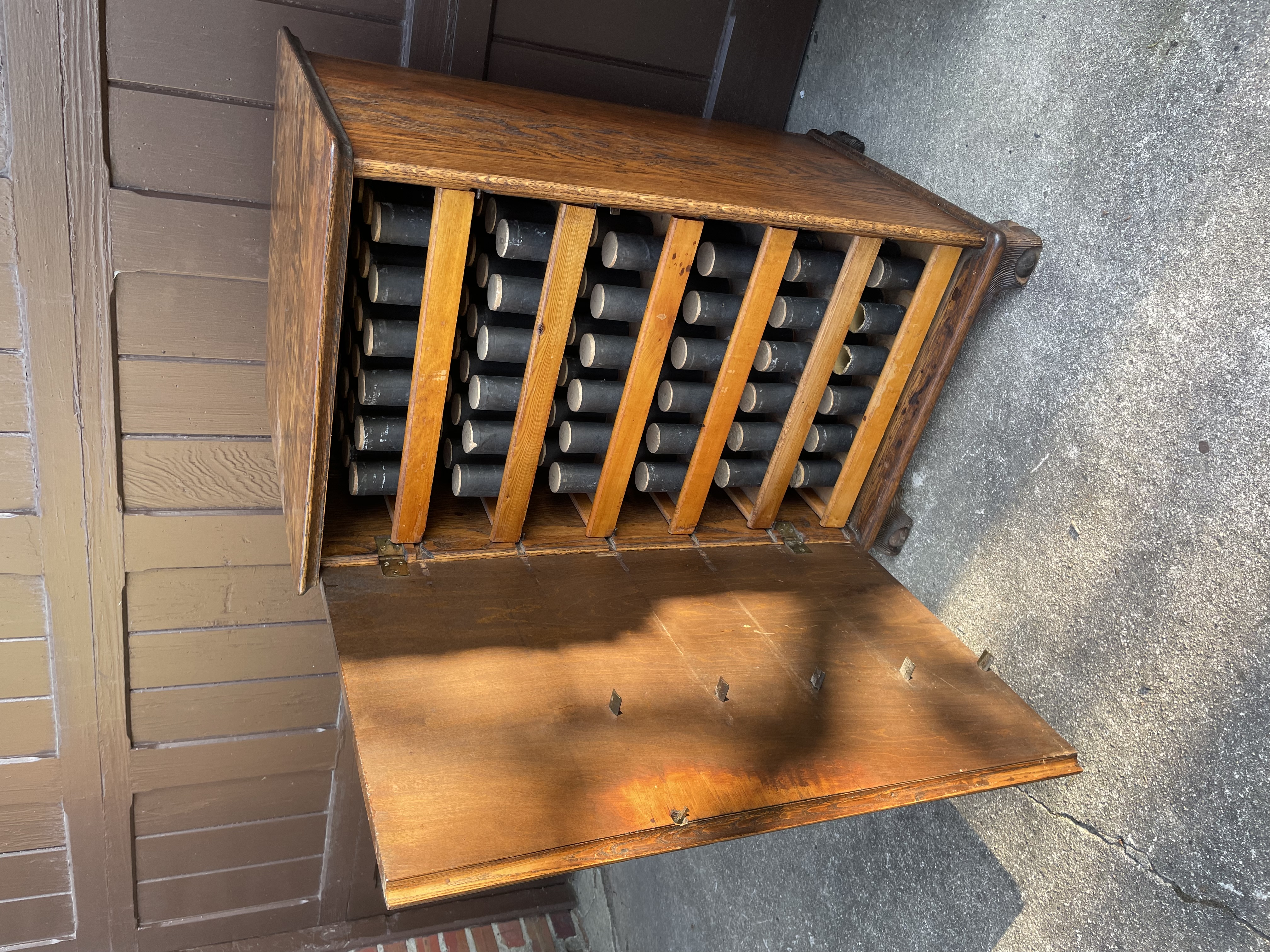 Nice original single-door six-shelf oak cylinder cabinet… each shelf holds 36 cylinders each, 216 total… all pegs are present and all but a handful are fully intact, a few are missing the tops… $425.