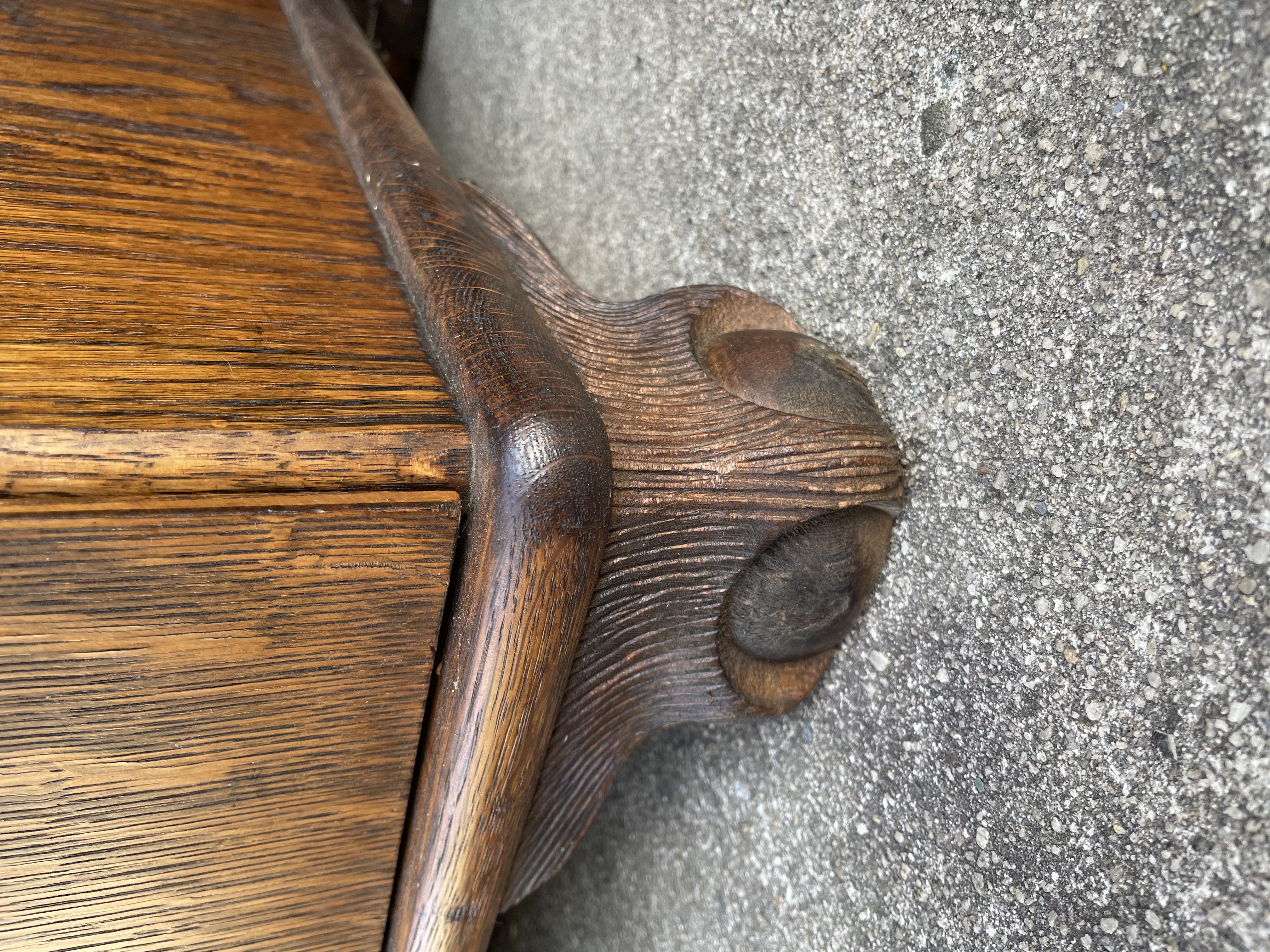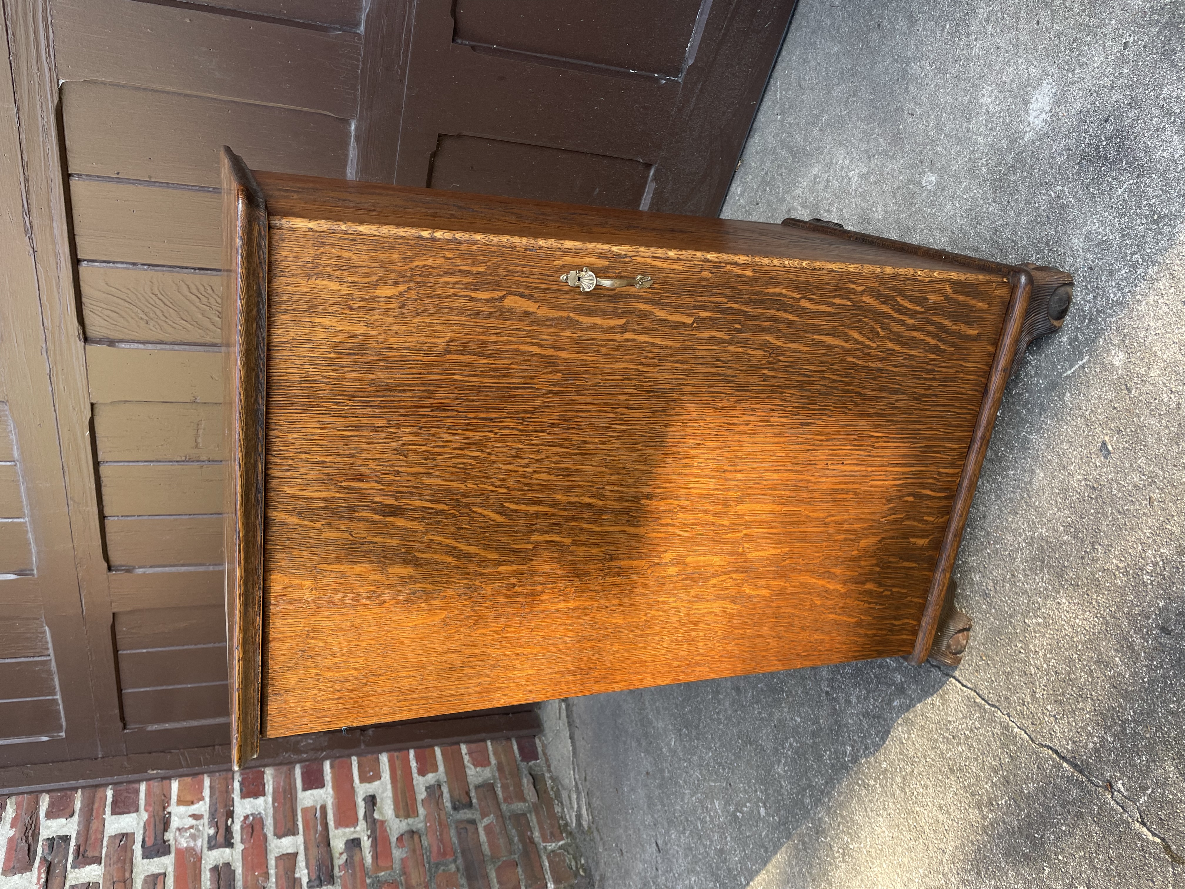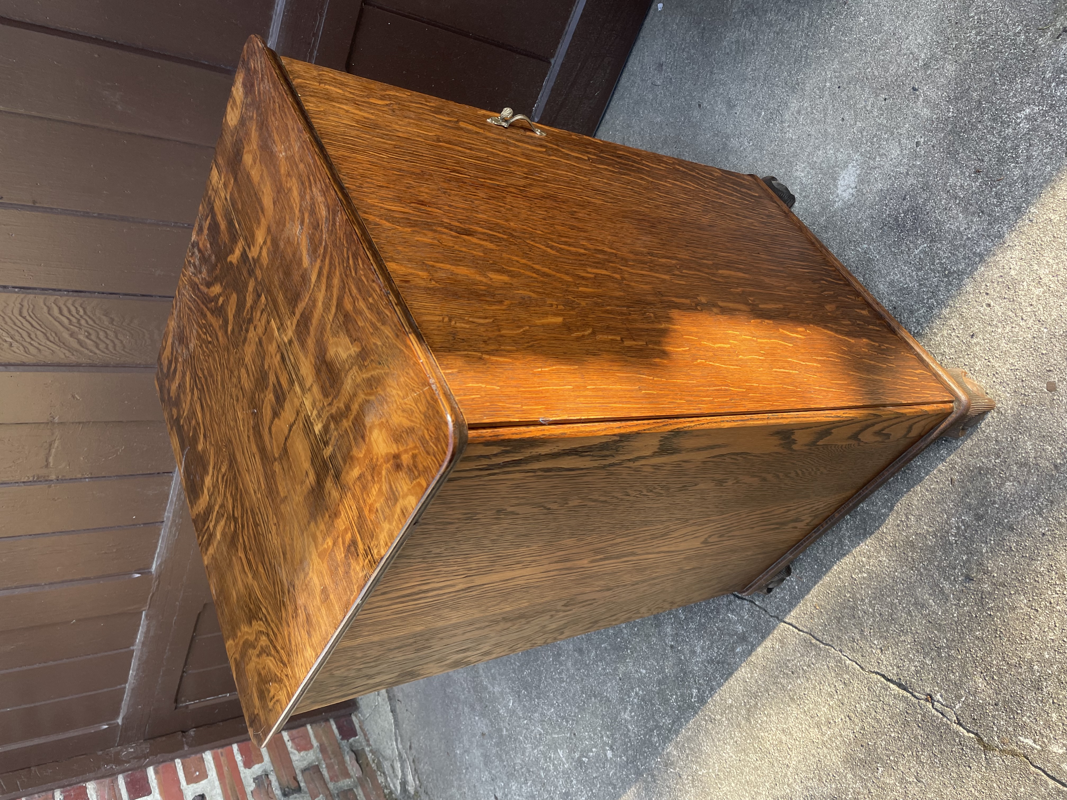 Nice original single-door six-shelf oak cylinder cabinet… each shelf holds 36 cylinders each, 216 total… all pegs are present and all but a handful are fully intact, a few are missing the tops… $425.