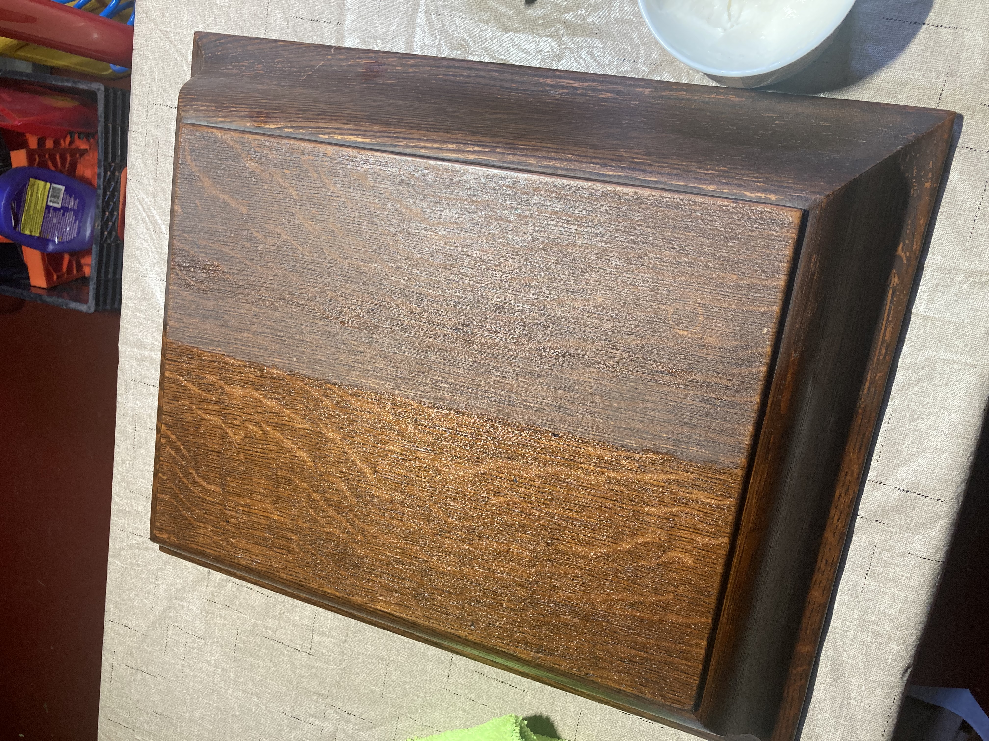 I’ve only had one VV-IX and it now belongs to my Dad. It was very similar being the fact it was cared for and stored properly during its life. It was a model in oak and he loves it. All it needed was a cleaning, motor rebuild, springs and brake pads. Here is a photo of just cleaning the lid with one Gojo coat. These finishes were beautiful and the patterns of the veneer just not found anywhere today.