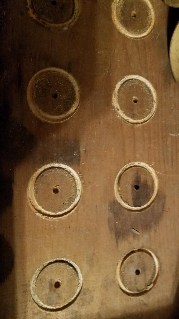 There are two crank holes in the cabinet--- Apparently it was made for one model machine, then adapted to fit a Home, Model "A" long bedplate. The large original opening measures 9 ¾" x 19" and lines up with a plugged crank hole. (Not sure what machine it originally fit)
