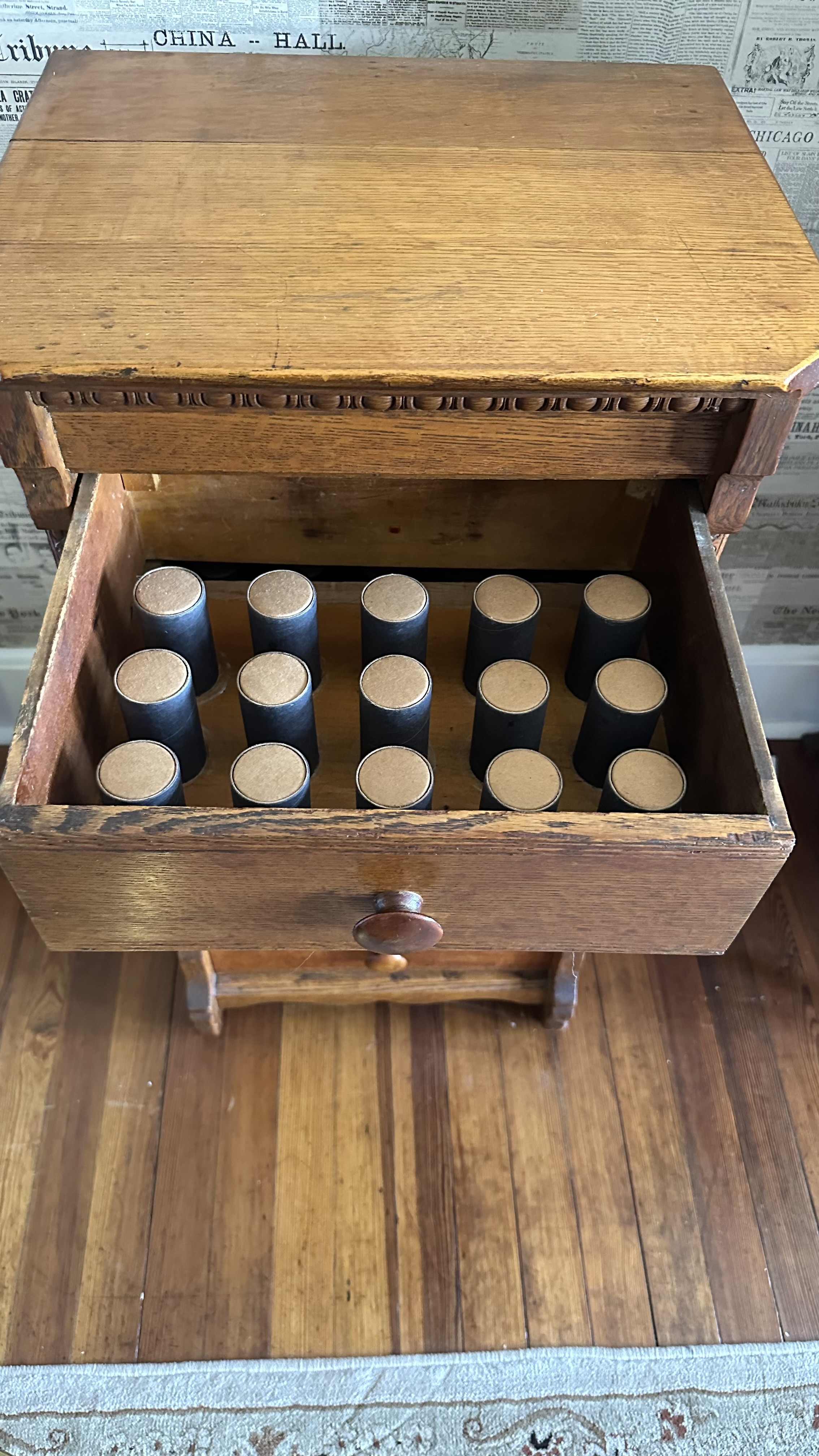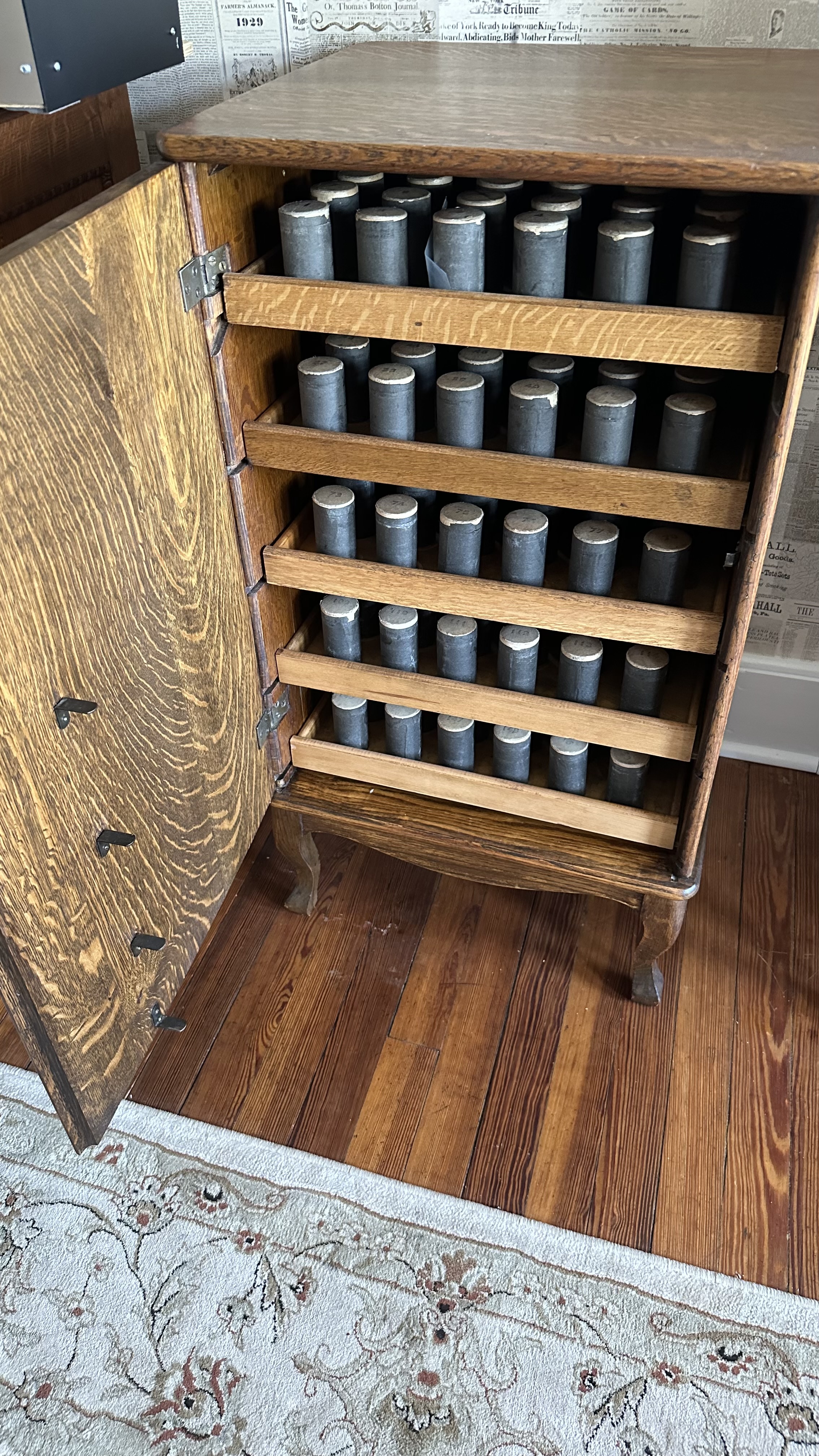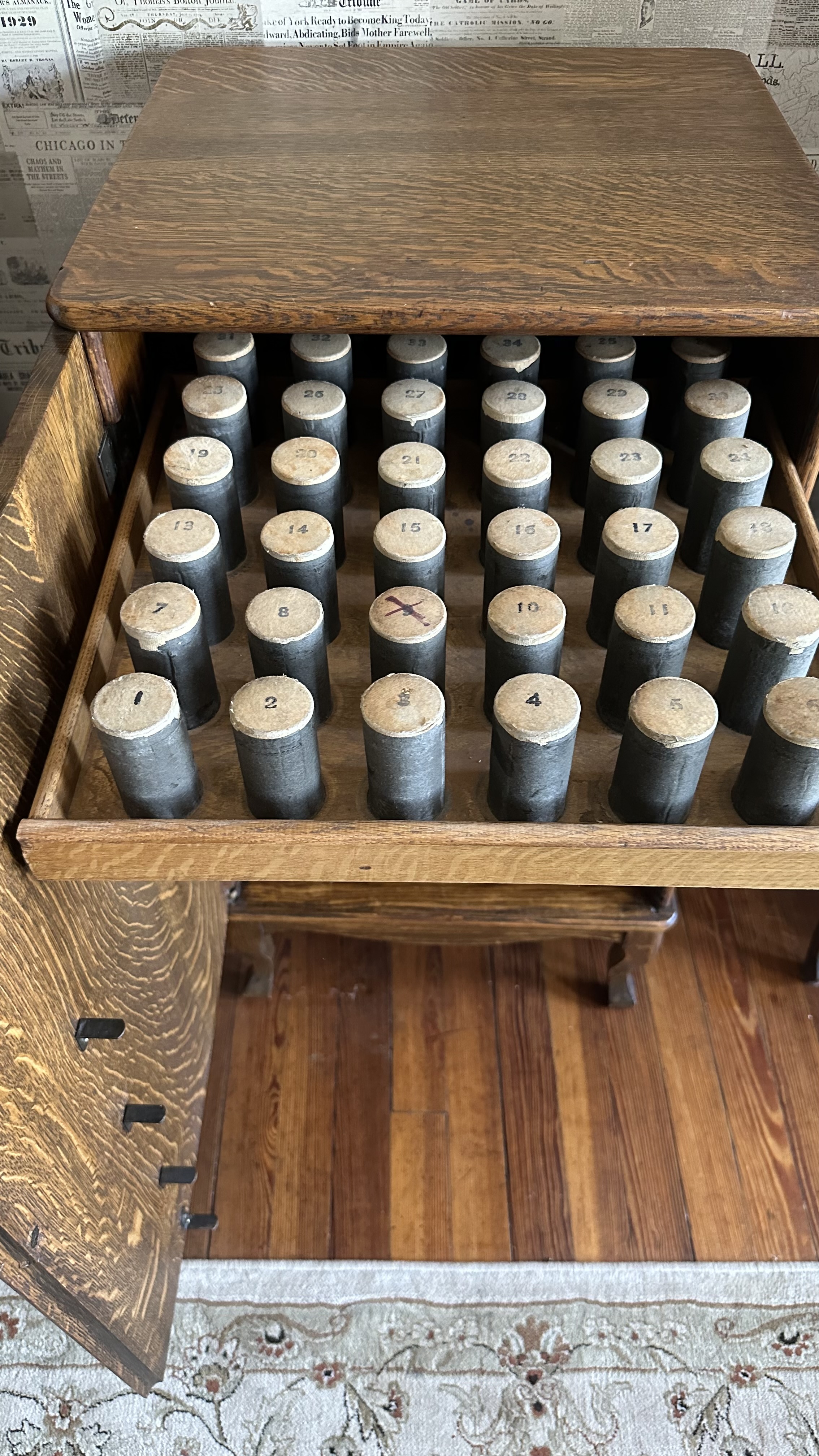 The second is a five drawer cabinet. Each drawer holds 36 cylinders for a total of 180. Pegs are numbered. Asking price is $350
