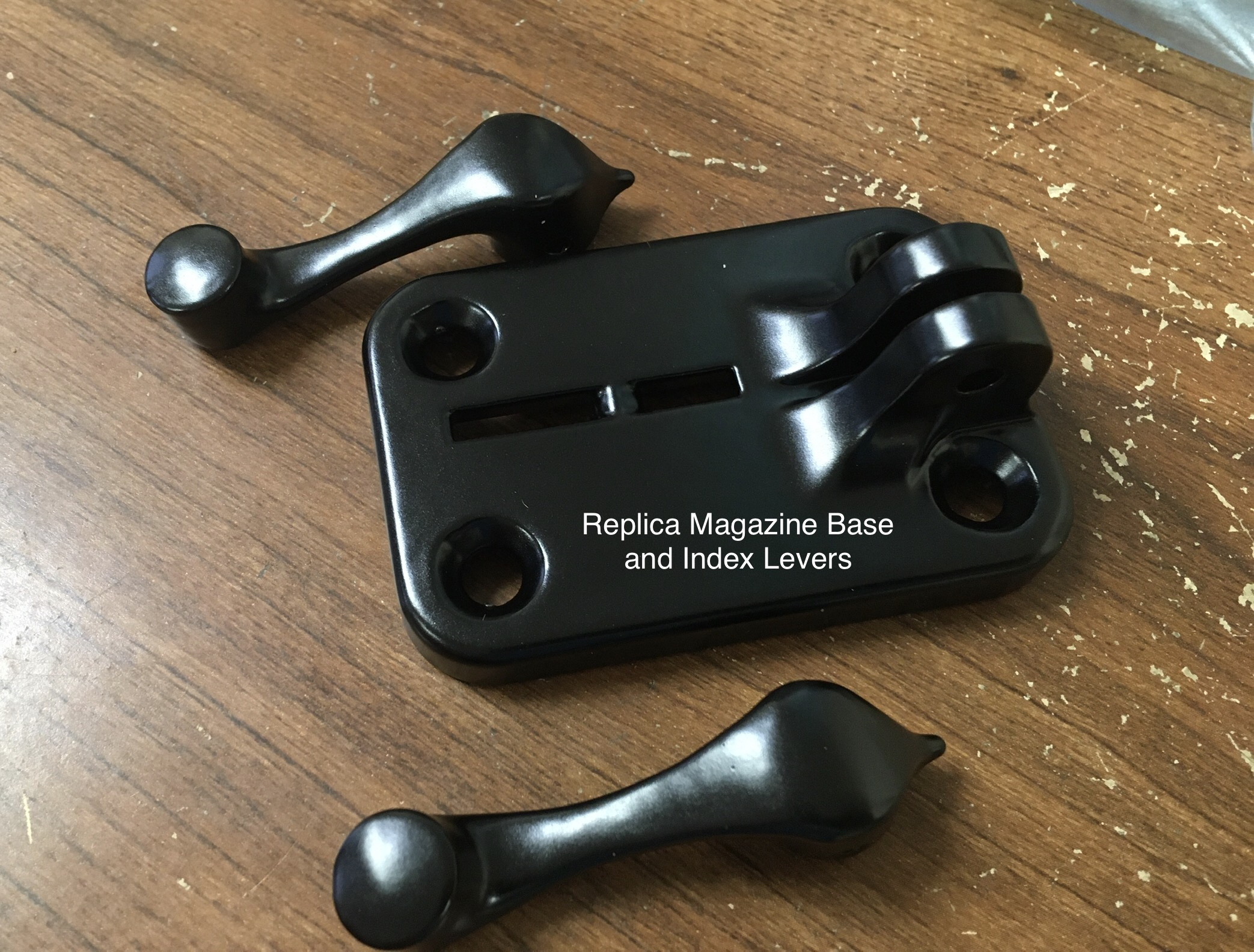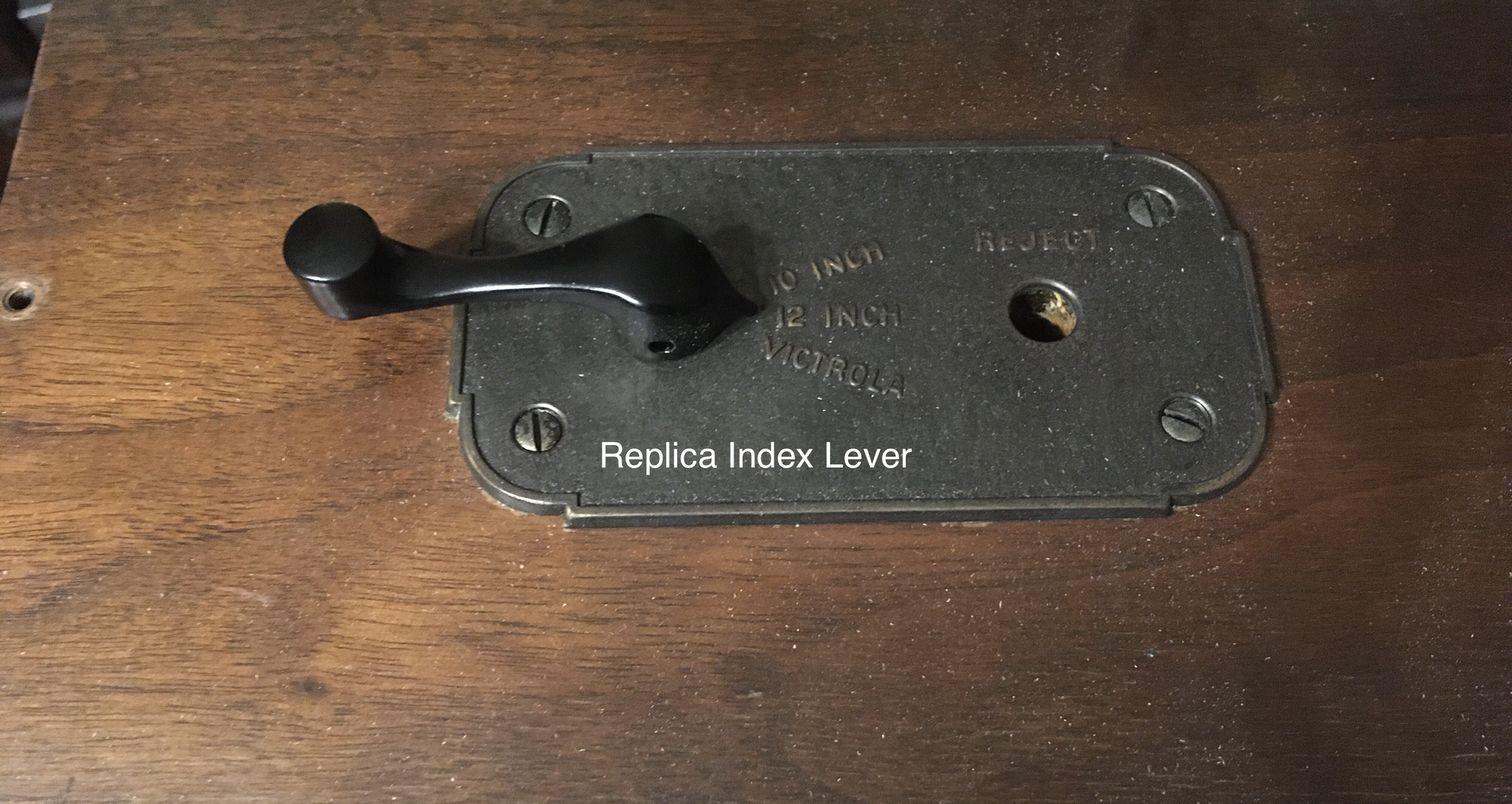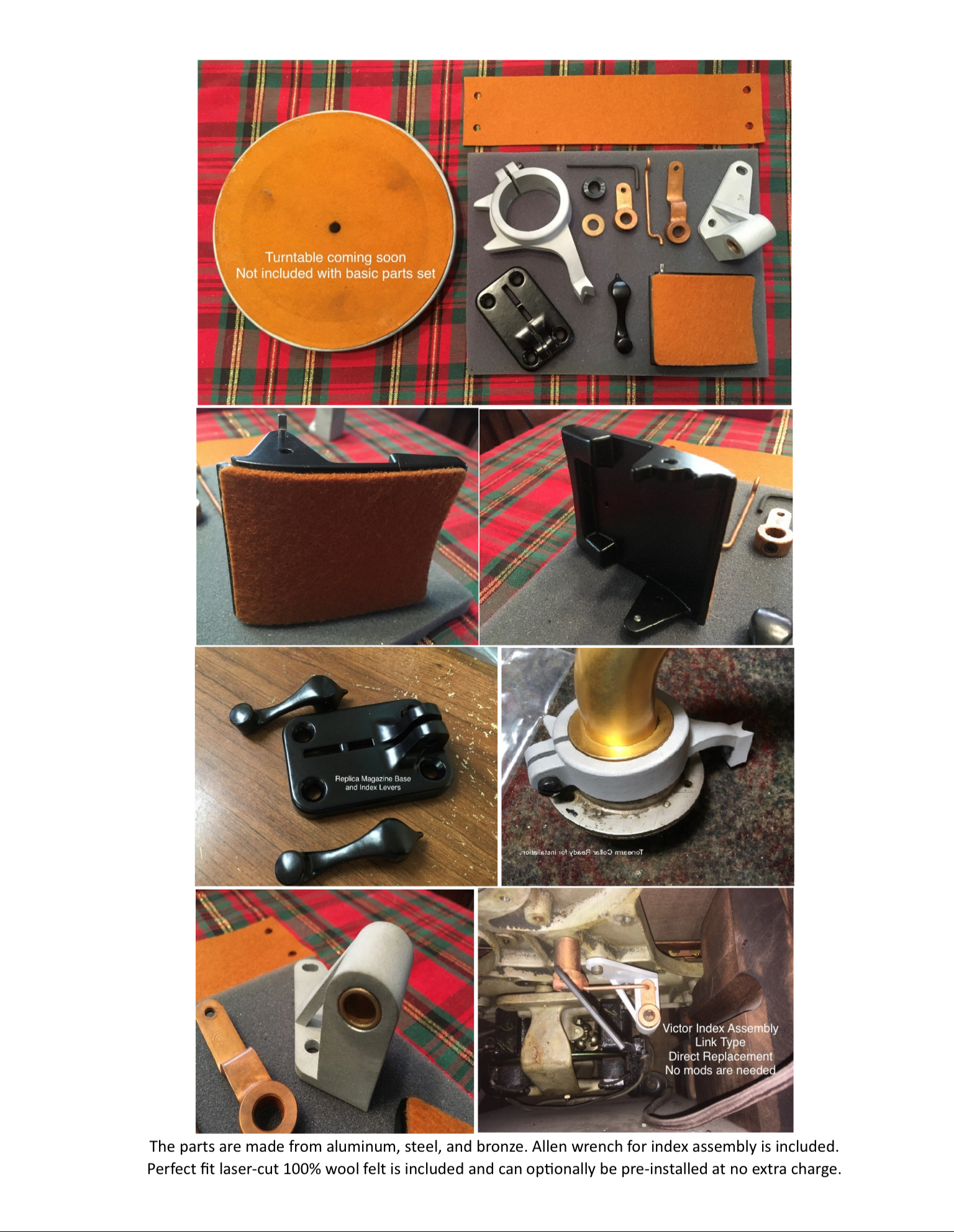 These parts are fully finished, drop in replacements not requiring the tedious filing and trial filling of earlier sets. The parts are made from aluminum, steel and bronze. The magazine base, lift pad and index lever handle have a baked powder coat paint finish for durability and match the sheen and color of the original parts. The index links are copper plated for rust protection and look like the other copper plated links used in the changer. A bronze Oilite bearing is used in the index assembly for long life without lubrication. Each part was designed from the ground up, not recast from existing swollen out-of-spec parts. Development involved examining existing parts, patent drawings and testing with seven complete changers using both the Orthophonic and Electrola versions. Multiple prototypes of each part were made and tested for proper performance to refine the design. A new gear-less index assembly was designed that is more effective and a drop-in replacement for the geared design, it requires no modifications to the changer. The index handle indicates the correct record size. It just does the job effectively and without the slop of the original four gear design. Many index assemblies are in the field and they have been completely embraced by the collecting community. The original color 100% wool felt is laser cut for an exact fit. It is included and can be pre-installed or left off for those of you wishing to use your old felt.