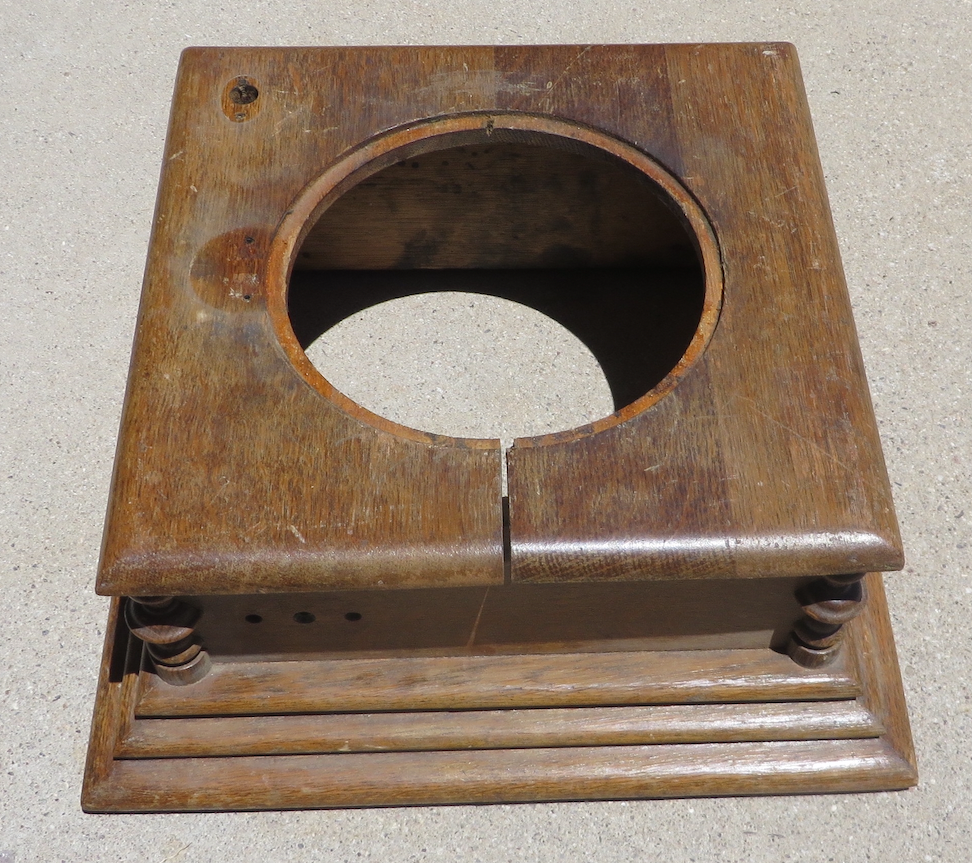 The case was cleaned, wiped down with denatured alcohol, and amber shellac wiped over the remaining old finish. The top has been repaired. The last photo is prior to cleaning.