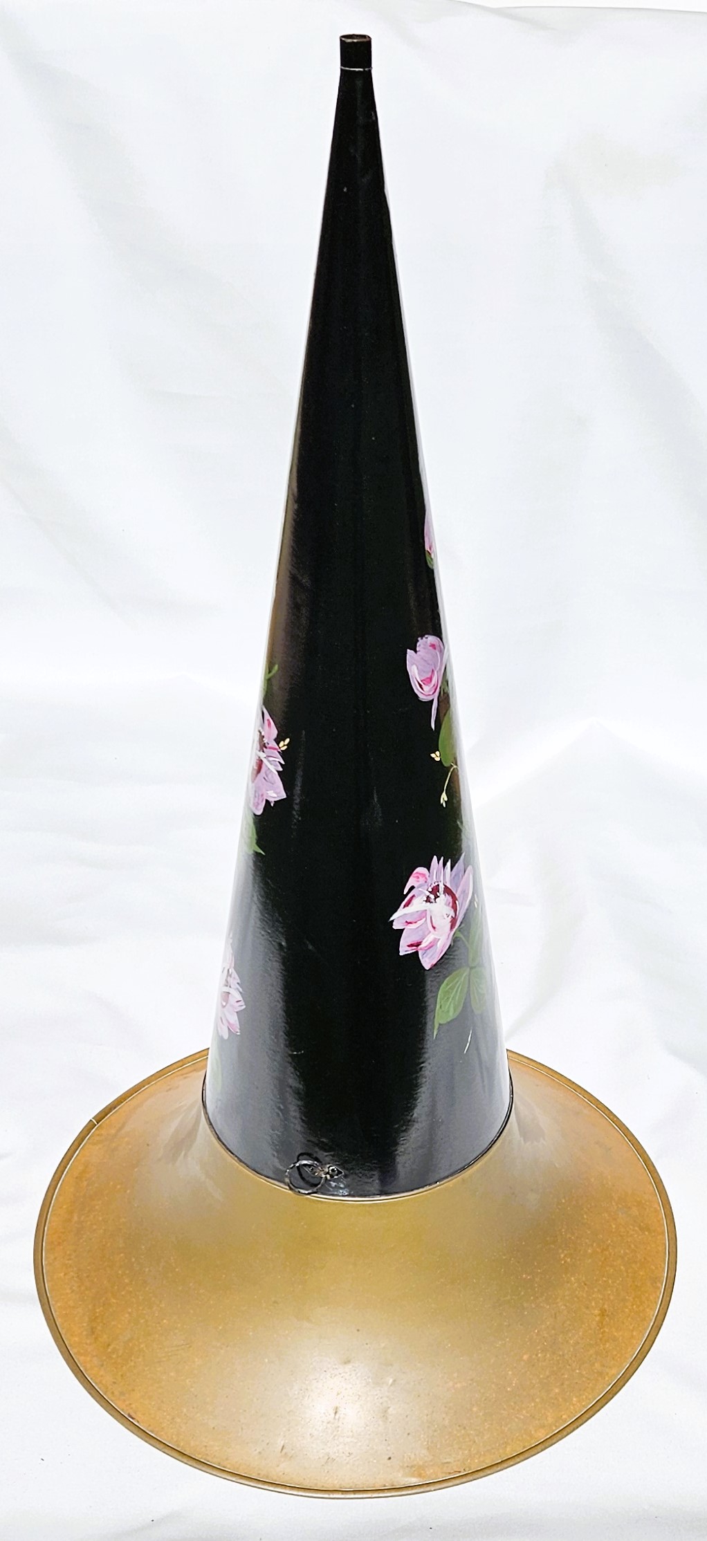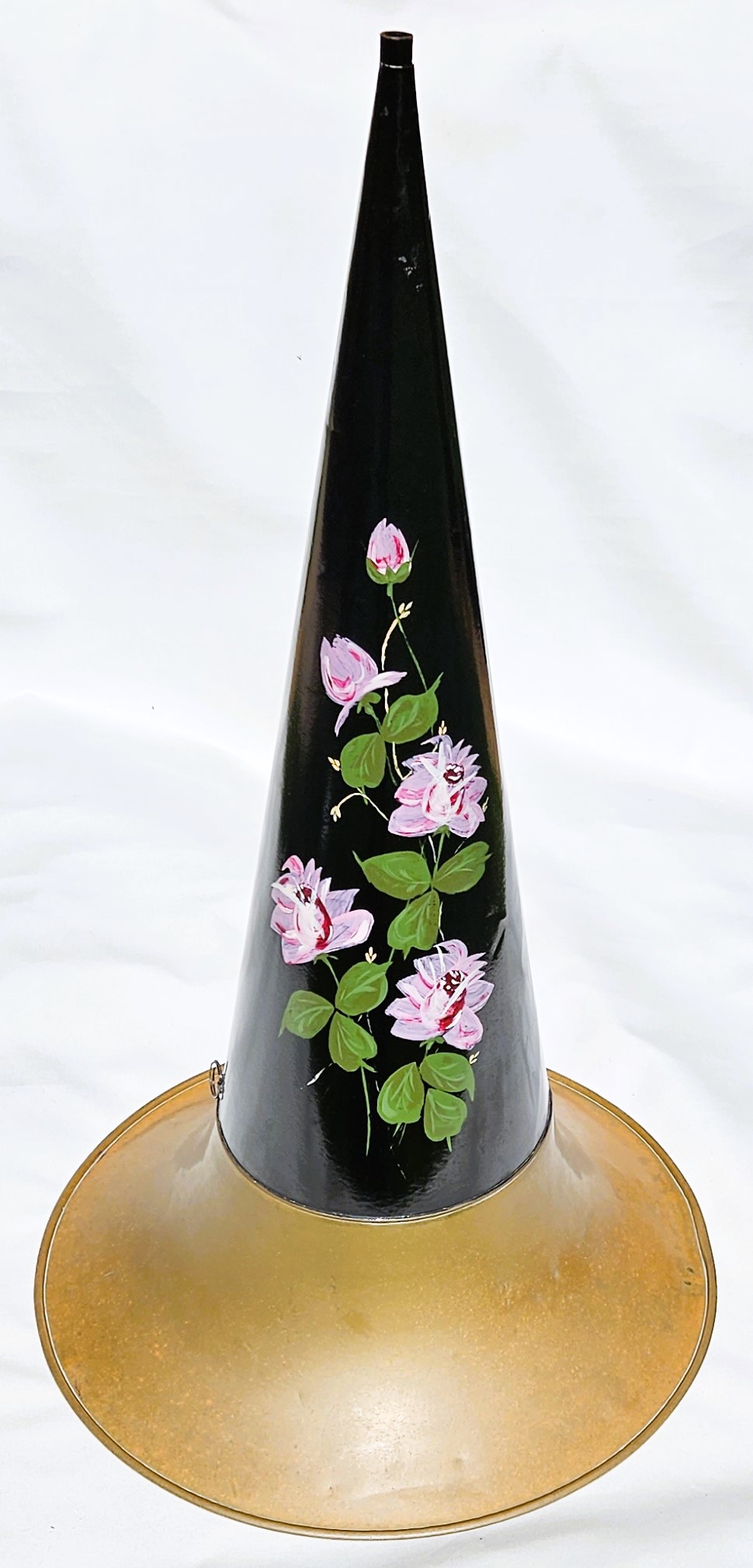 4. This beautifully painted large tin horn with a brass bell is in fantastic condition. The horn measures 35” in length and has a 20 ½” diameter brass bell. The brass bell has a few minor blemishes and will polish nicely. The chrysanthemums were probably painted by an artist at a later date and are stunning and would make a great addition to any phonograph collection. $135.00