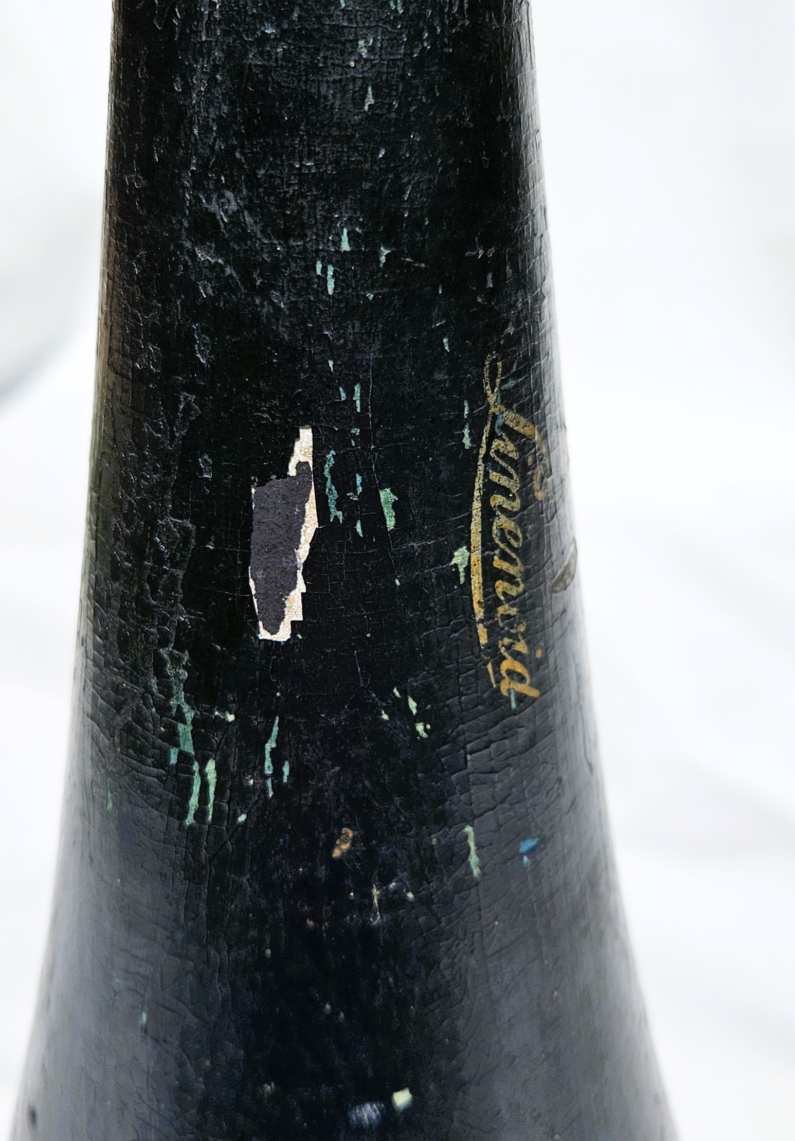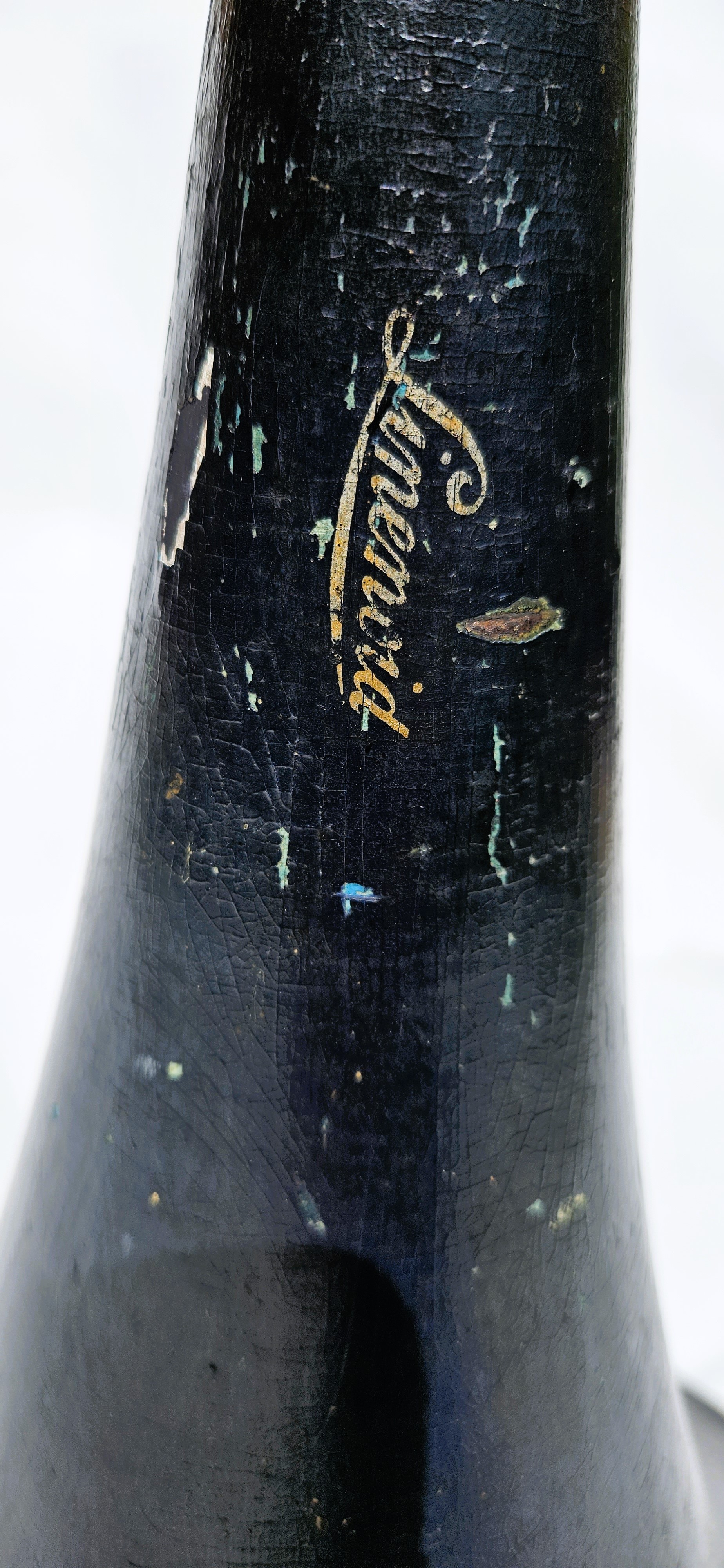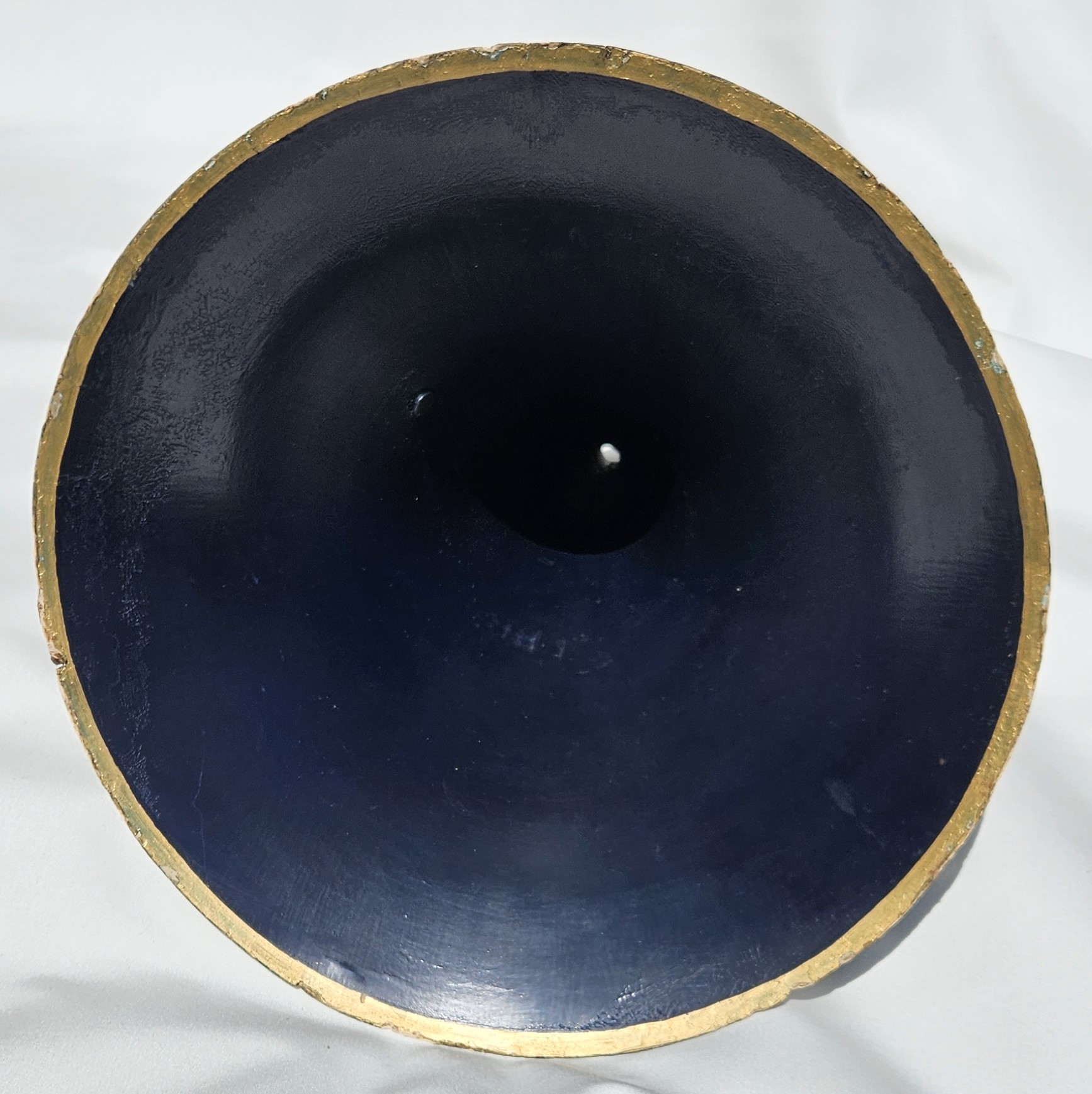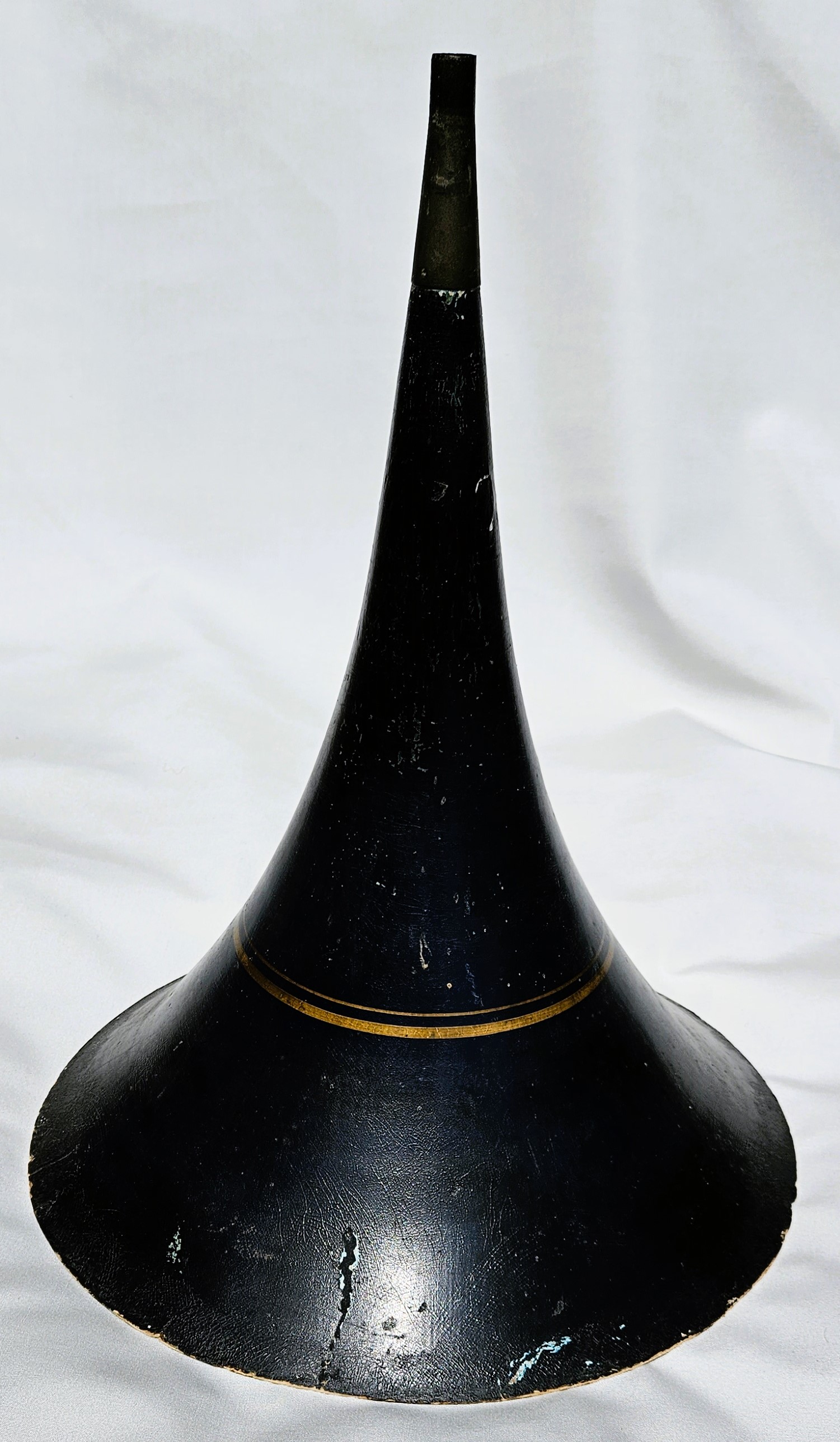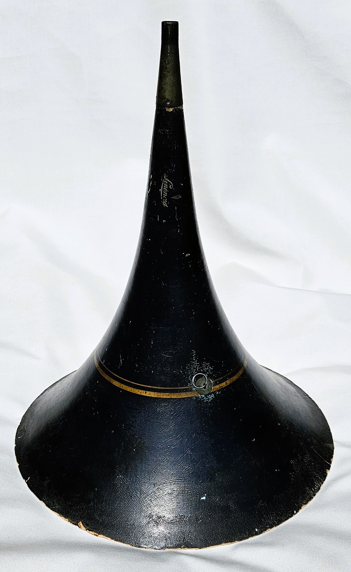 3. Here is an uncommon Linenoid brand horn constructed of a stiff fiber. It measures 20” in length with a 16 ½ diameter bell. The black surface with gold stripe is all original. It has a few spots on the outside where the original paint has been chipped. The inside is very clean with the rim and gold stripe having very little damage. Being very light weight, this horn works well with a repeater attachment or on an Edison Gem or Fireside. $125.00