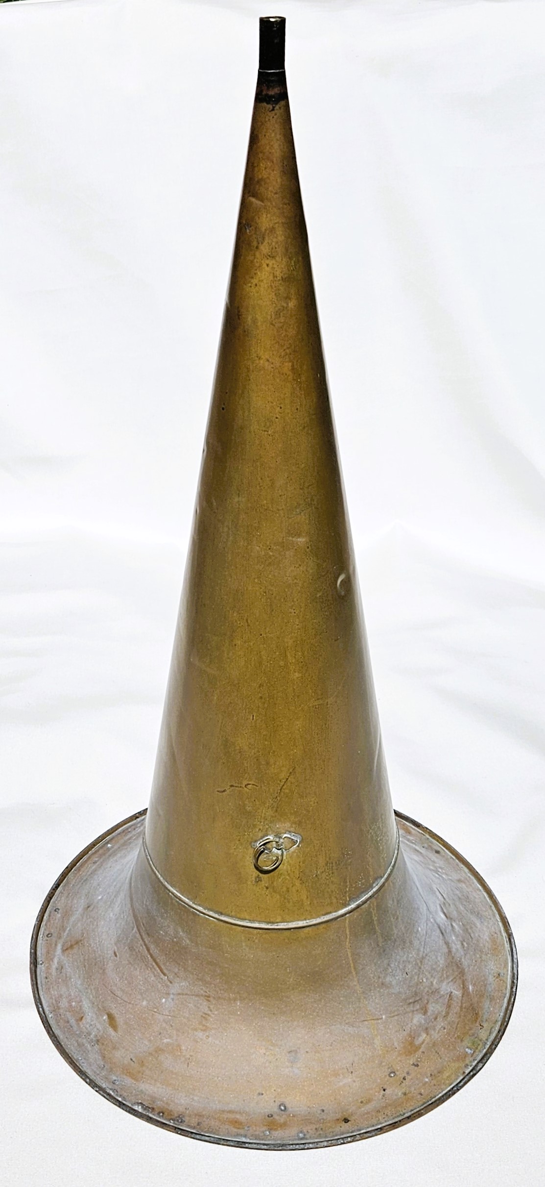 1. A large all brass horn measuring 30” in length with a 20” diameter bell. This horn has a few dents and wrinkles. Original tarnish (patina). The bell of this horn is dent free and beautiful. $60.00