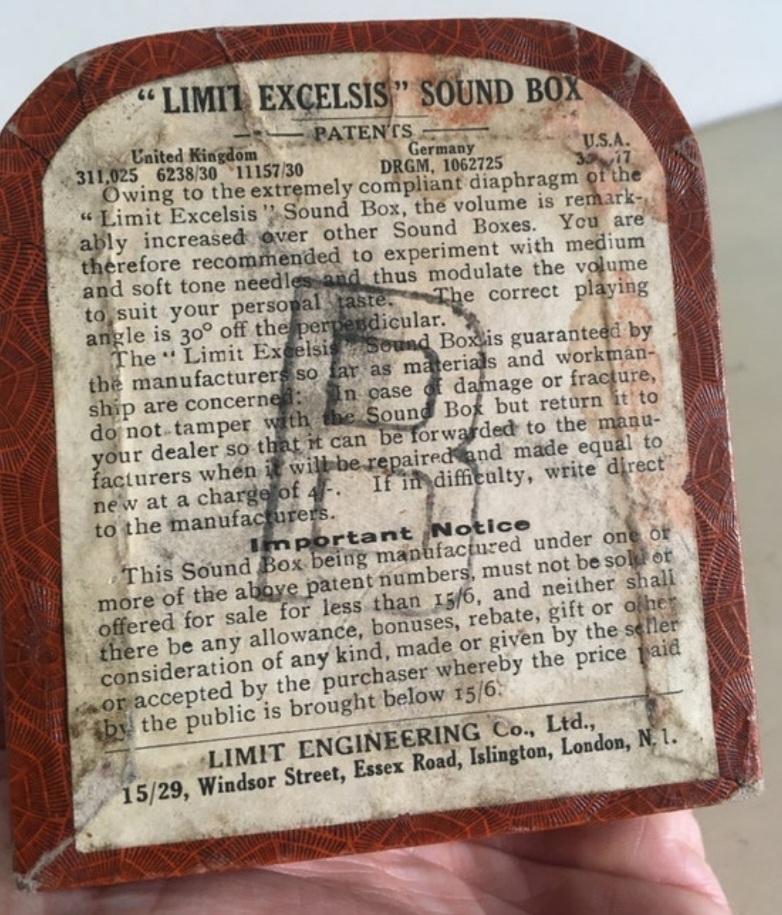 The Limit soundbox is fairly common in the UK. The one in the photo is their high-end model, the Excelsis. In terms of sound reproduction, I have a couple of them, one being the Excelsis, and I found both mediocre: a Victor orthophonic is much better, as an example.
