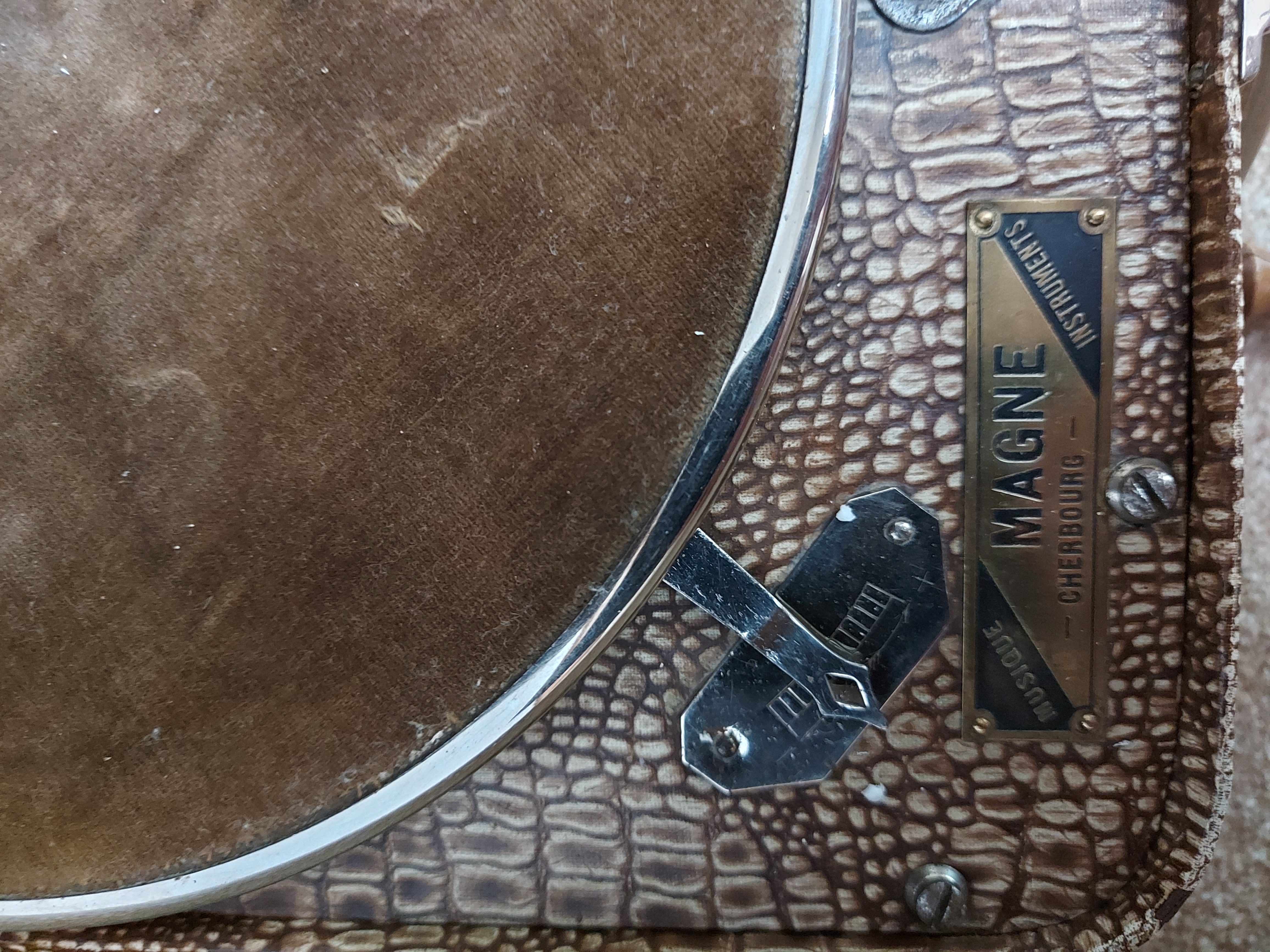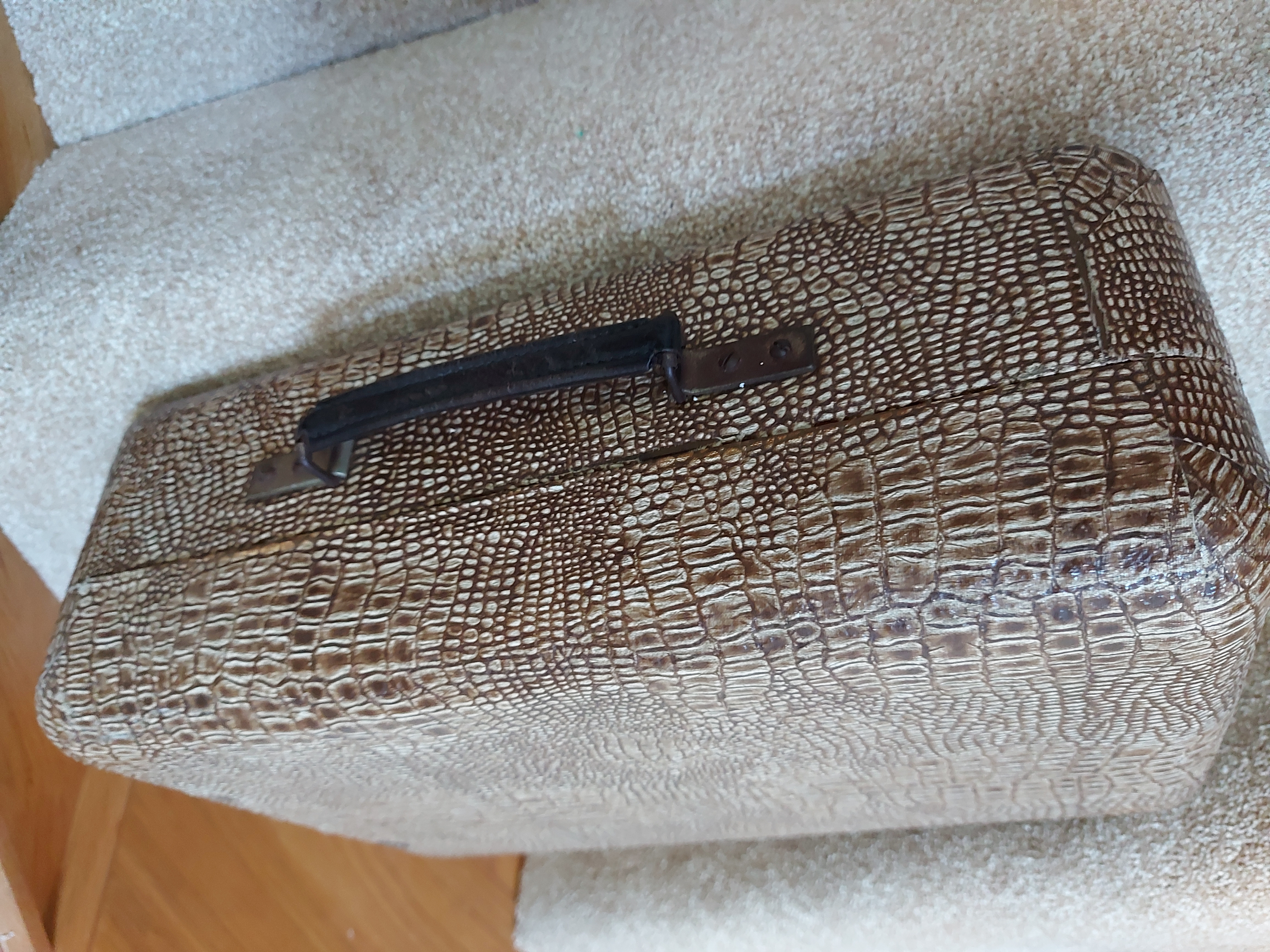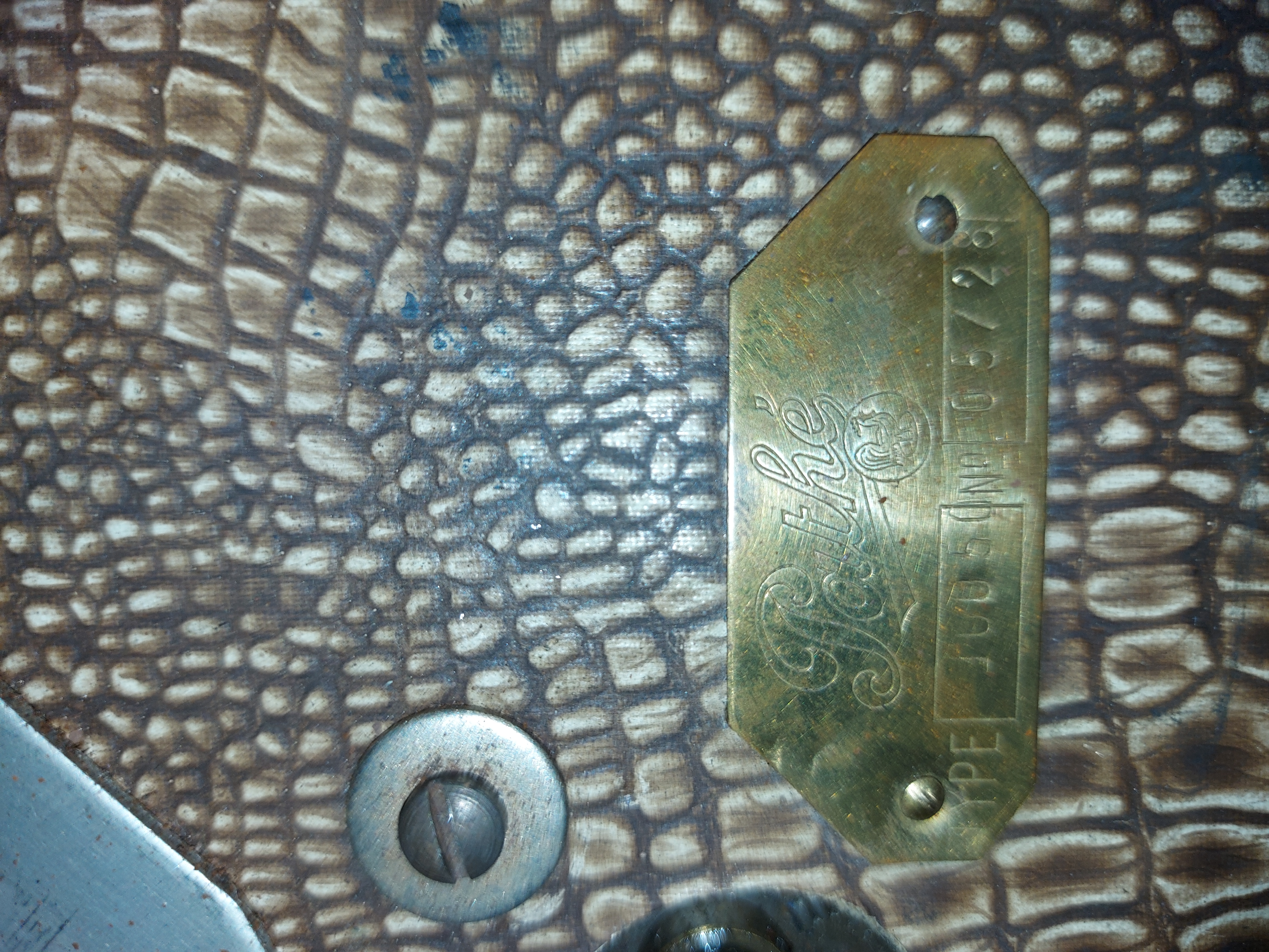 The 10050 was not, as far as I'm aware, ever sold in the UK. The machine is a rigid steel case covered in faux lizard skin rexine. It's very well made and although the case is metal it has an independent and full length steel internal horn which I've attempted to show inside.