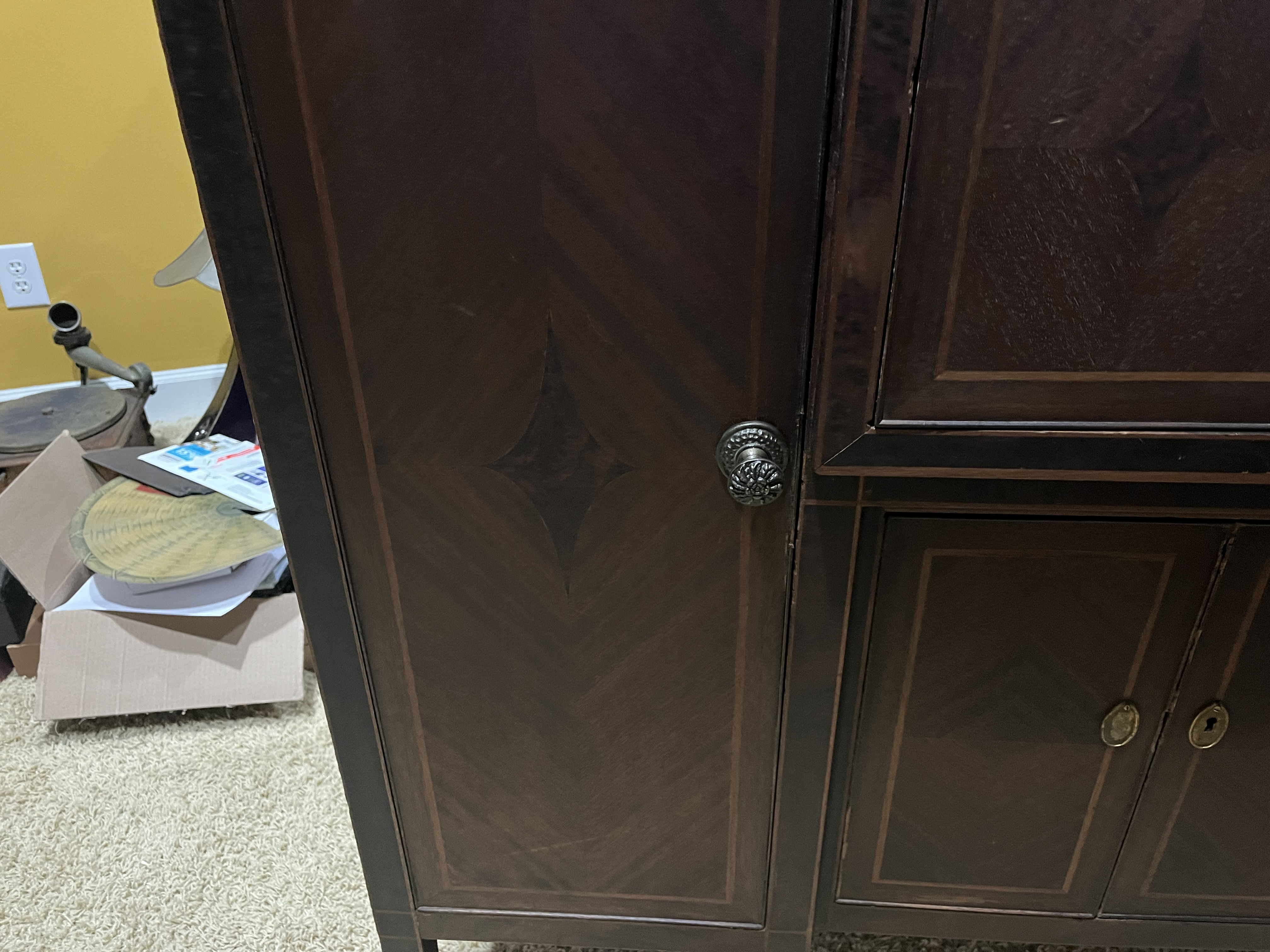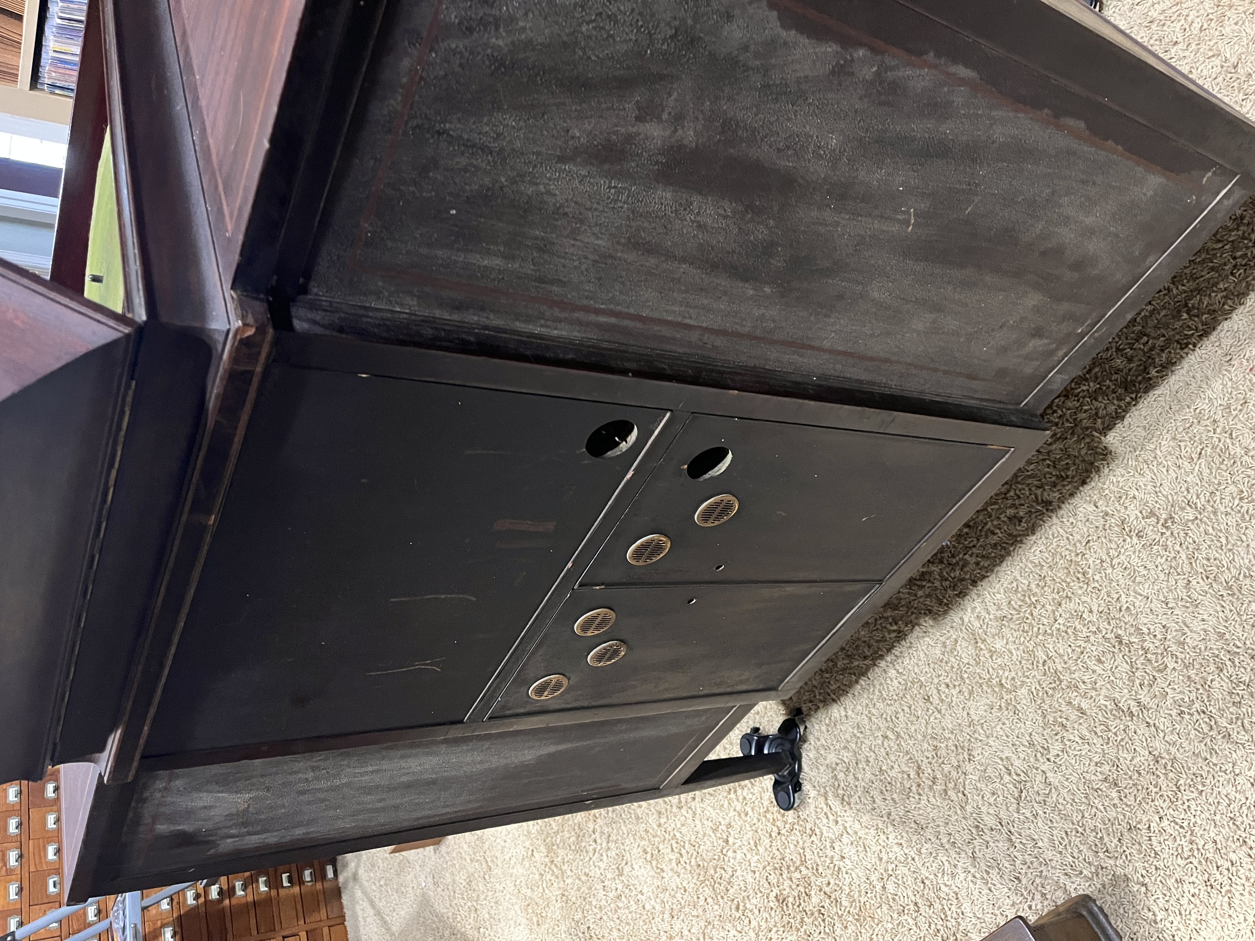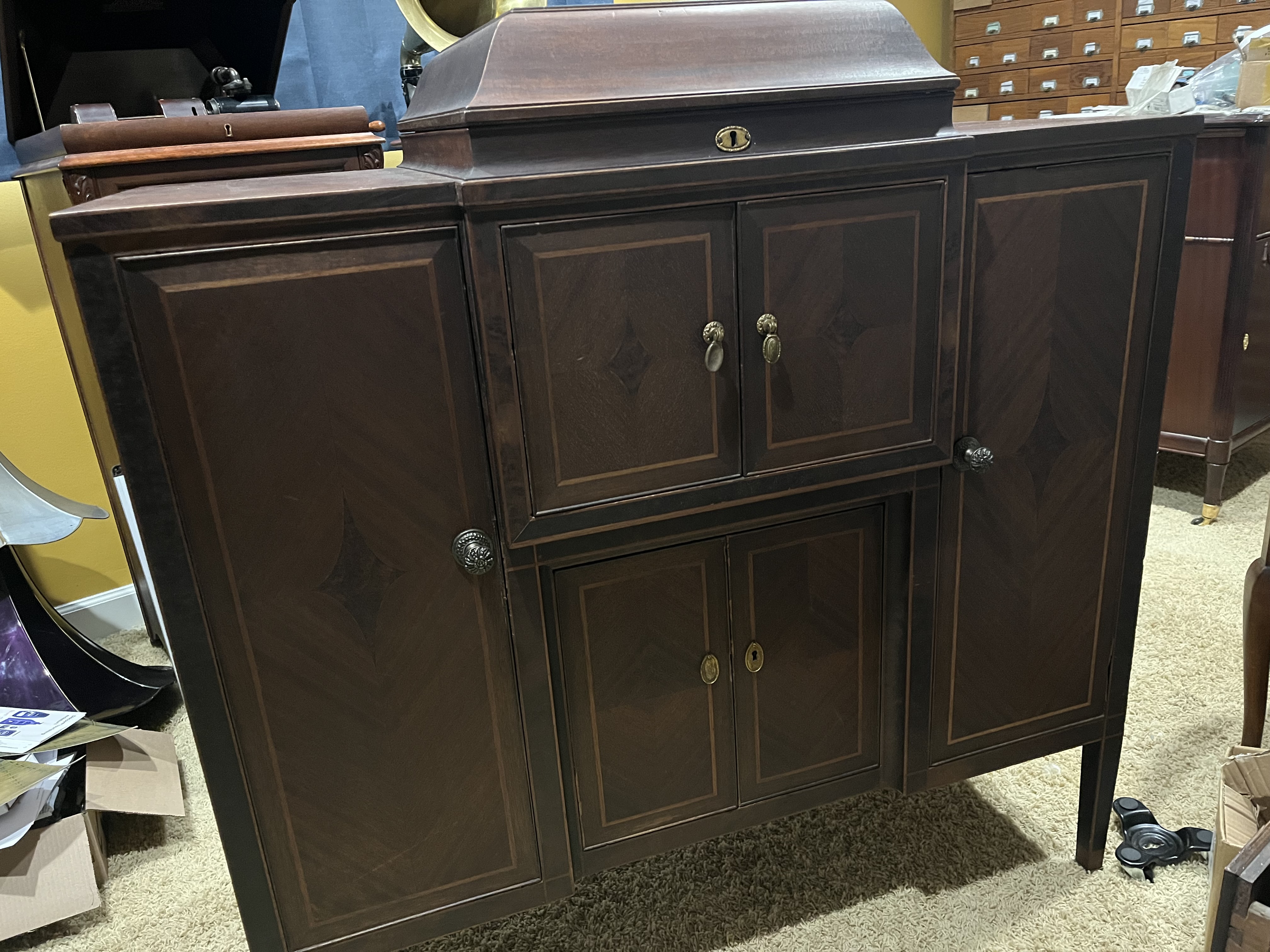 Cabinet it in good condition. Some of the piping around the doors is damaged and the door knobs are not original. Have not tried the motor but it does turn freely now after oiling.