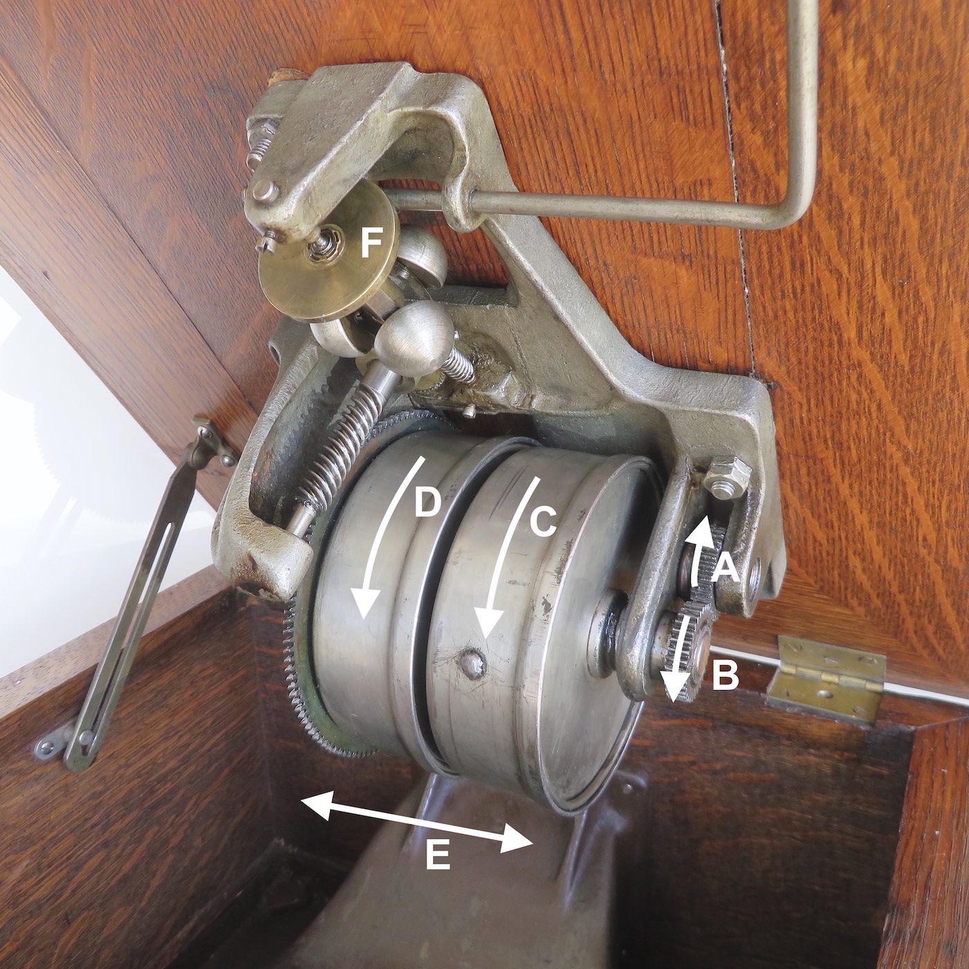 "A" is the winding gear that rotates with the crank in a clockwise direction. It turns the arbor gear "B" in a counter clockwise direction to tighten the springs.