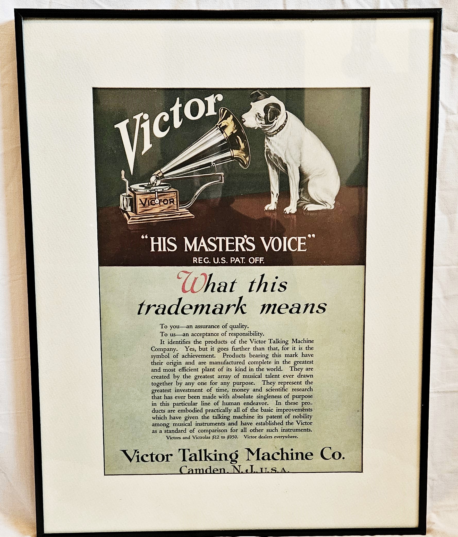 6 Framed Victor Talking Machine Company Ad Here is a nicely framed and desirable Victor Talking Machine Company Ad that is ready to hang on your wall. Great color and graphics. Free delivery to APS show. Price is $35